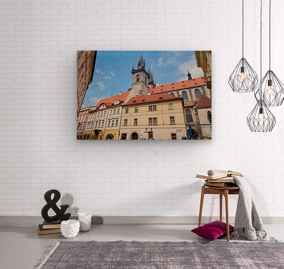 Pragues Týn Church and historic buildings under blue sky. Picture Frame Printing