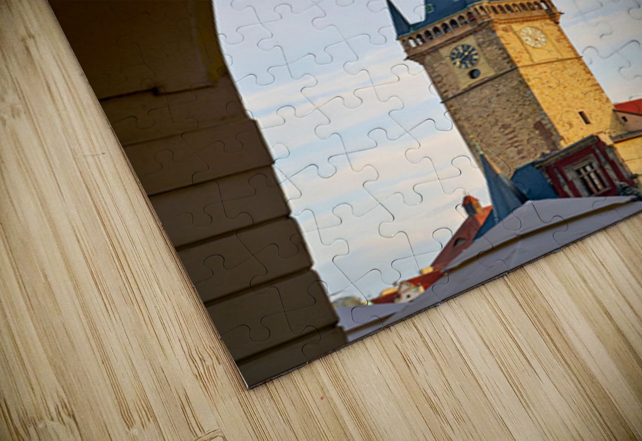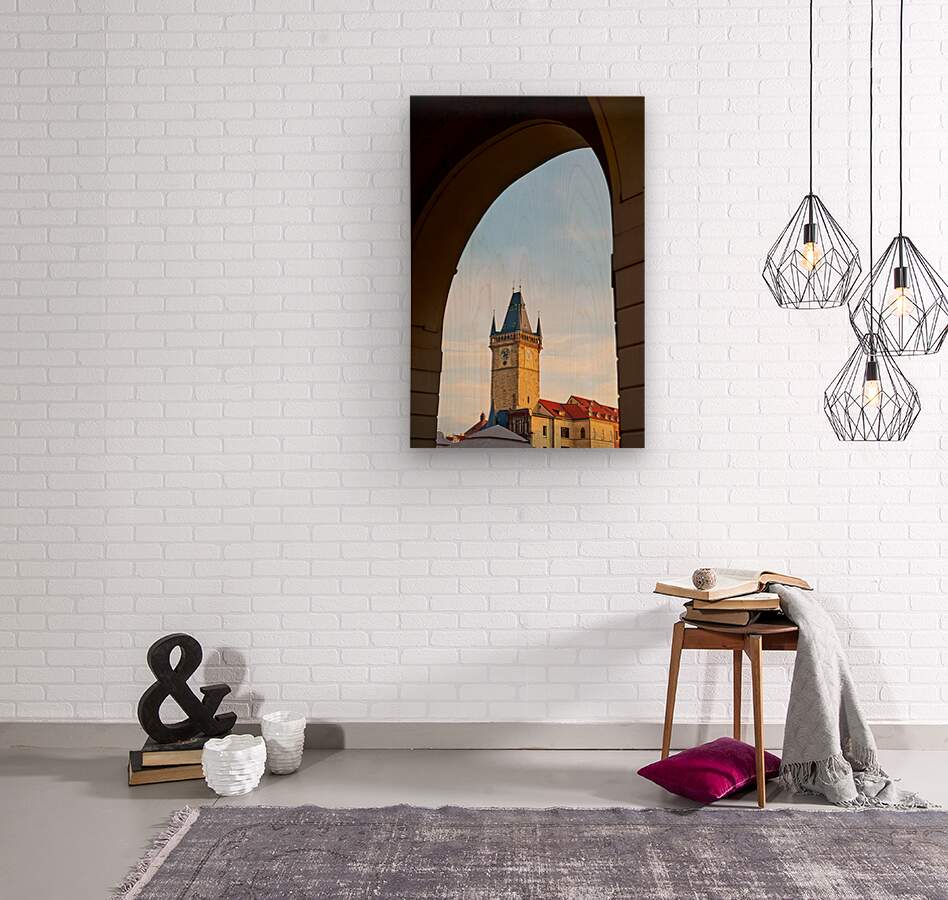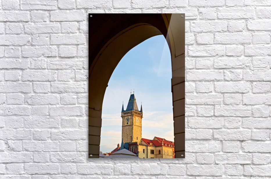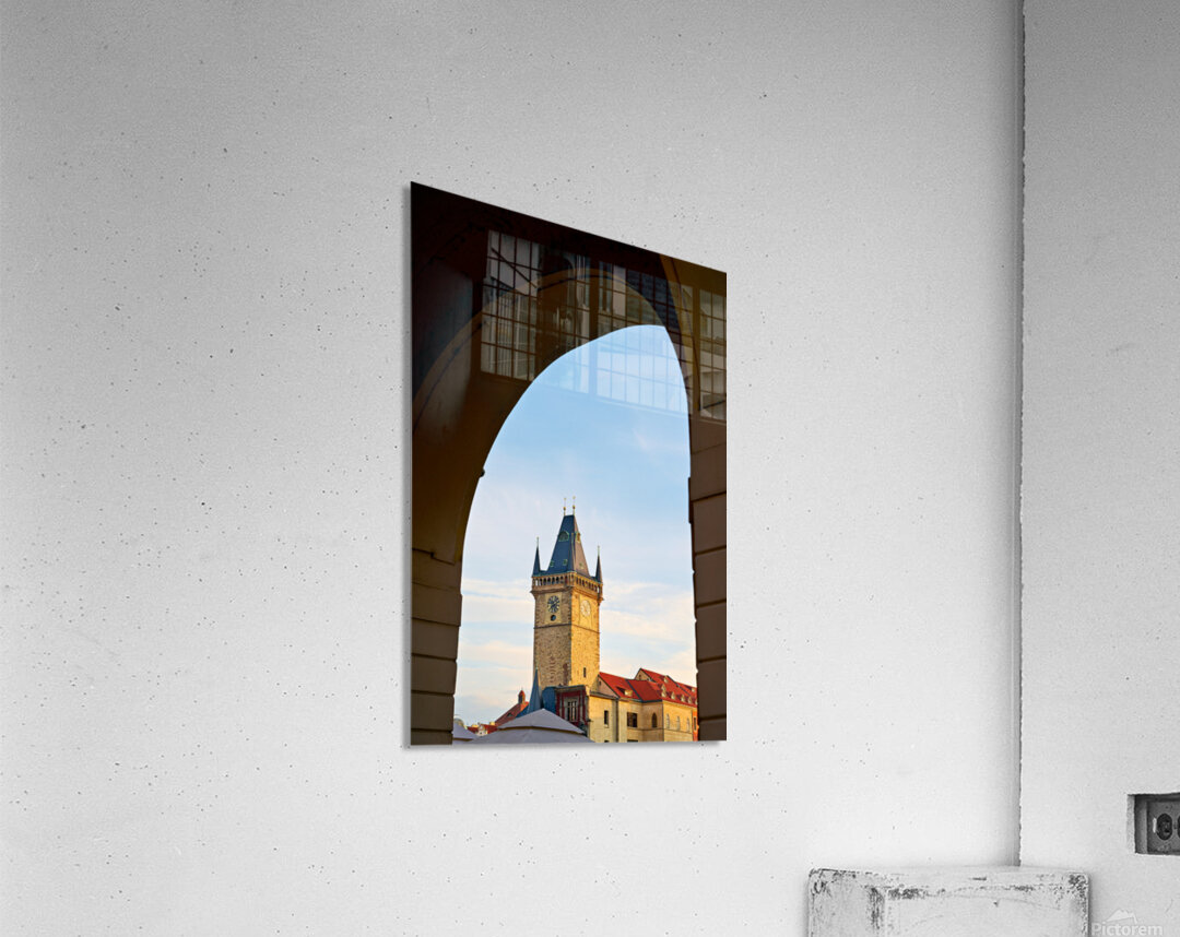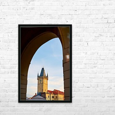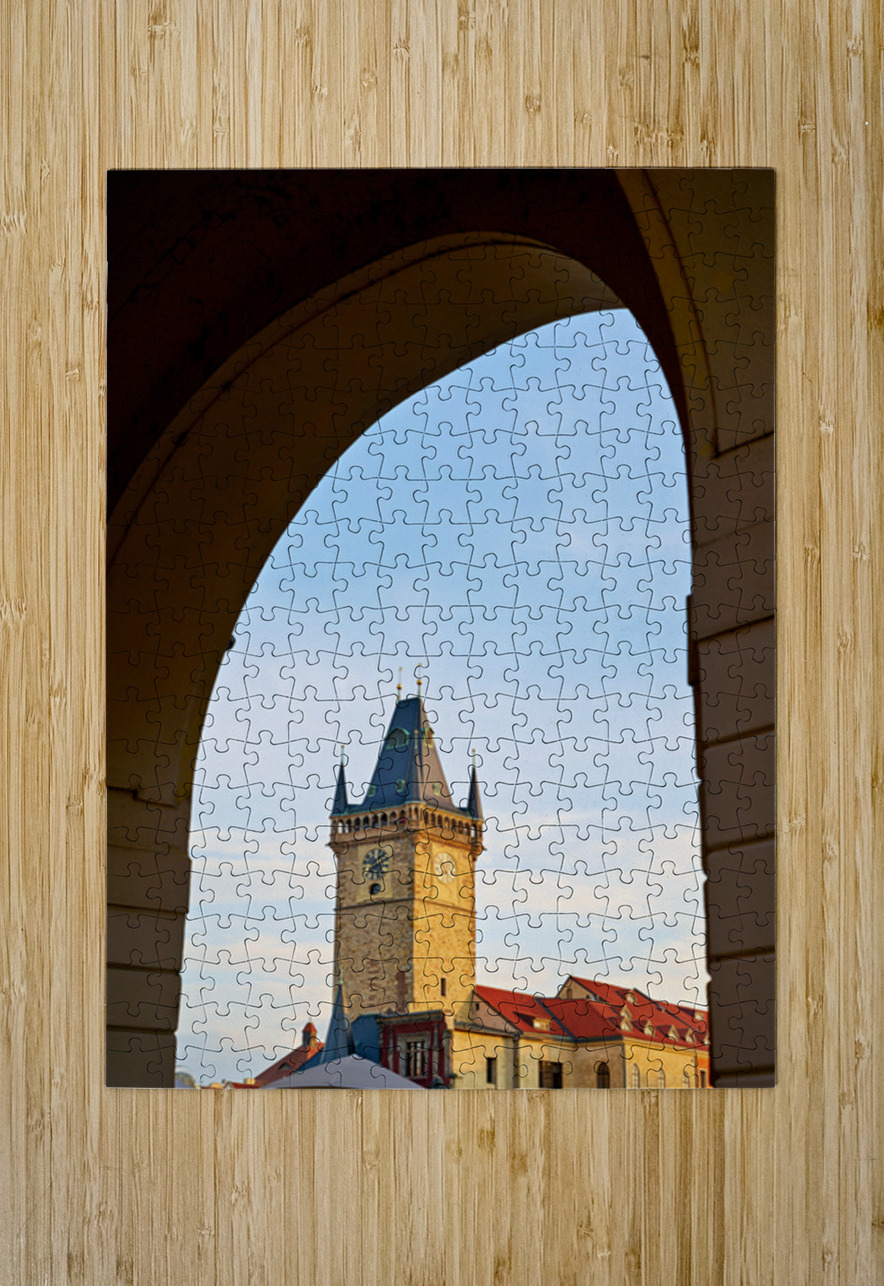 The iconic Old Town Hall Tower in Prague Czech Republic stands tall against a clear sky framed by a historic archway showcasing the citys timeless bea