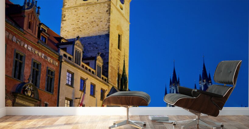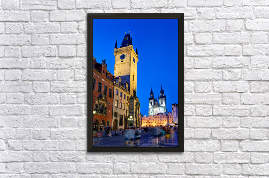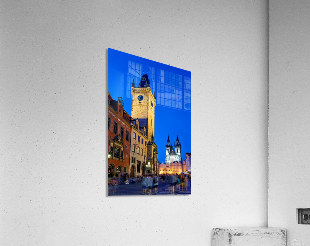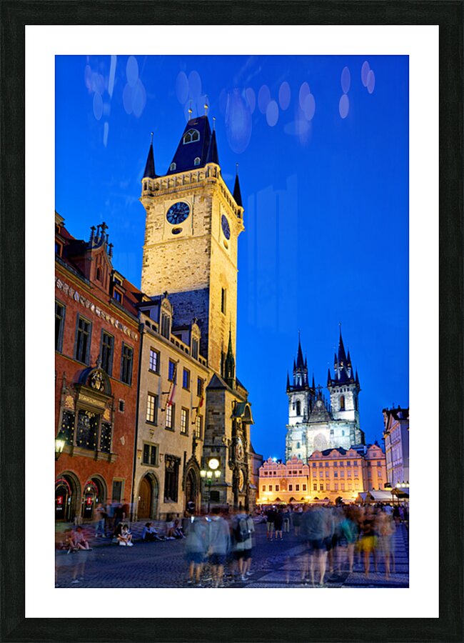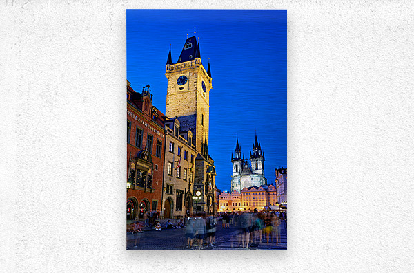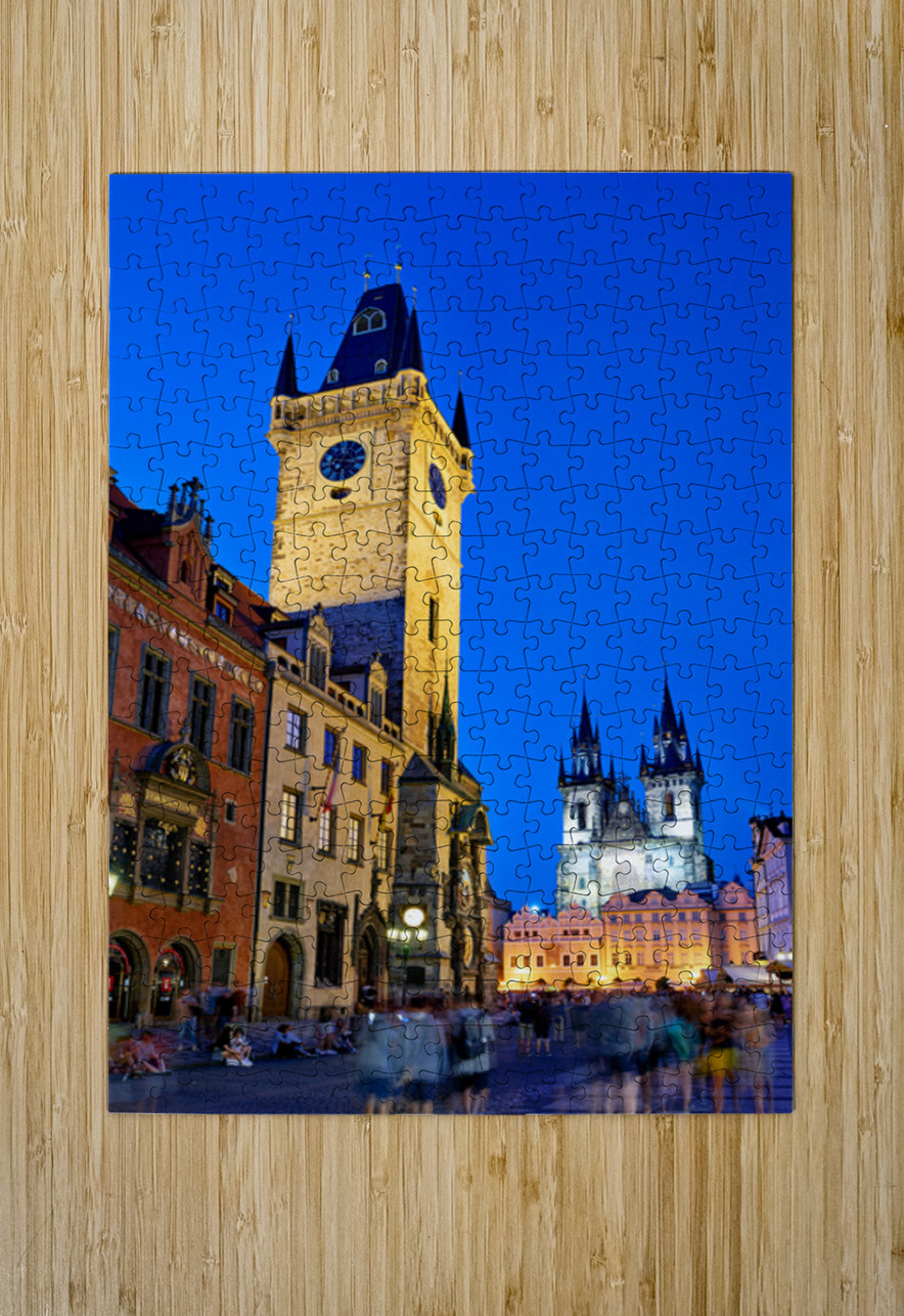 Tourists gather in Pragues Old Town Square at dusk admiring the illuminated Old Town Hall and Týn Church soaking in the historic ambiance.