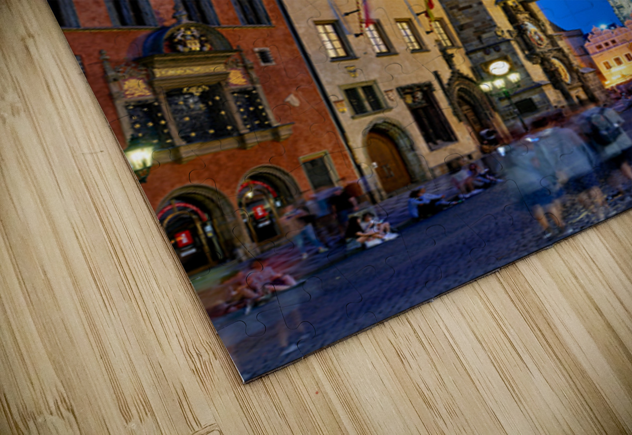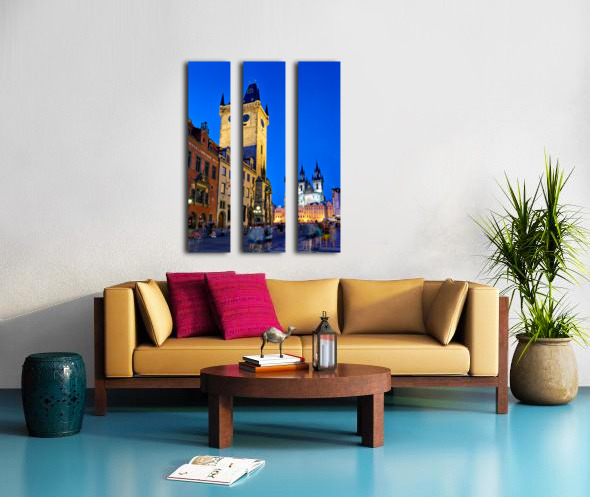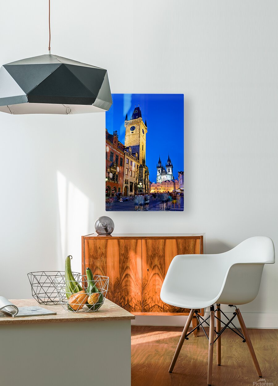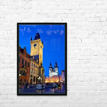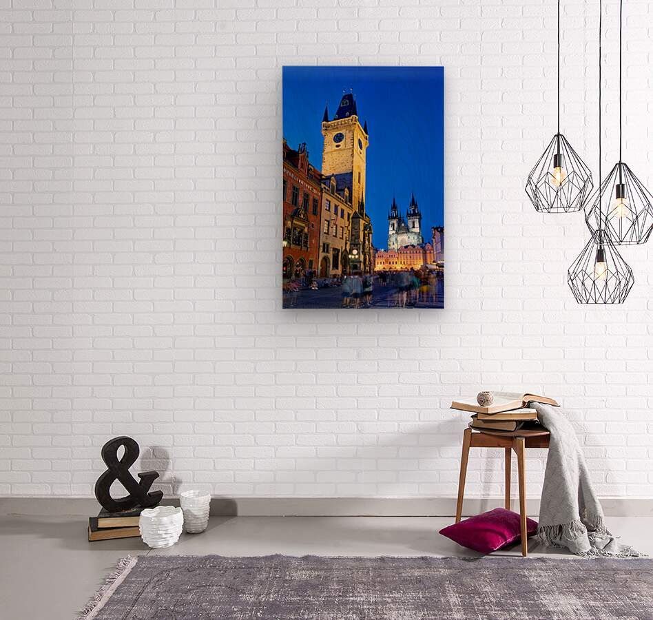 Tourists gather in Pragues Old Town Square at dusk admiring the illuminated Old Town Hall and Týn Church soaking in the historic ambiance.
