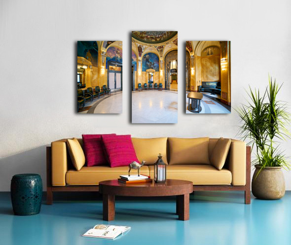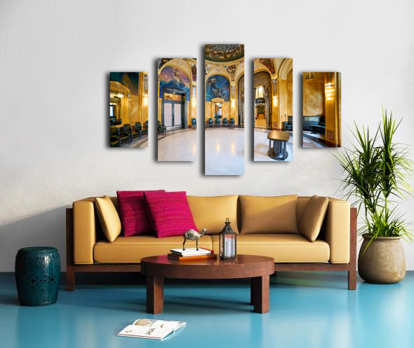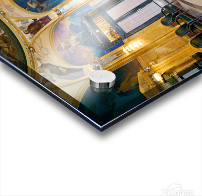 Ornate historic hall with murals arches and elegant seating. Frame print
