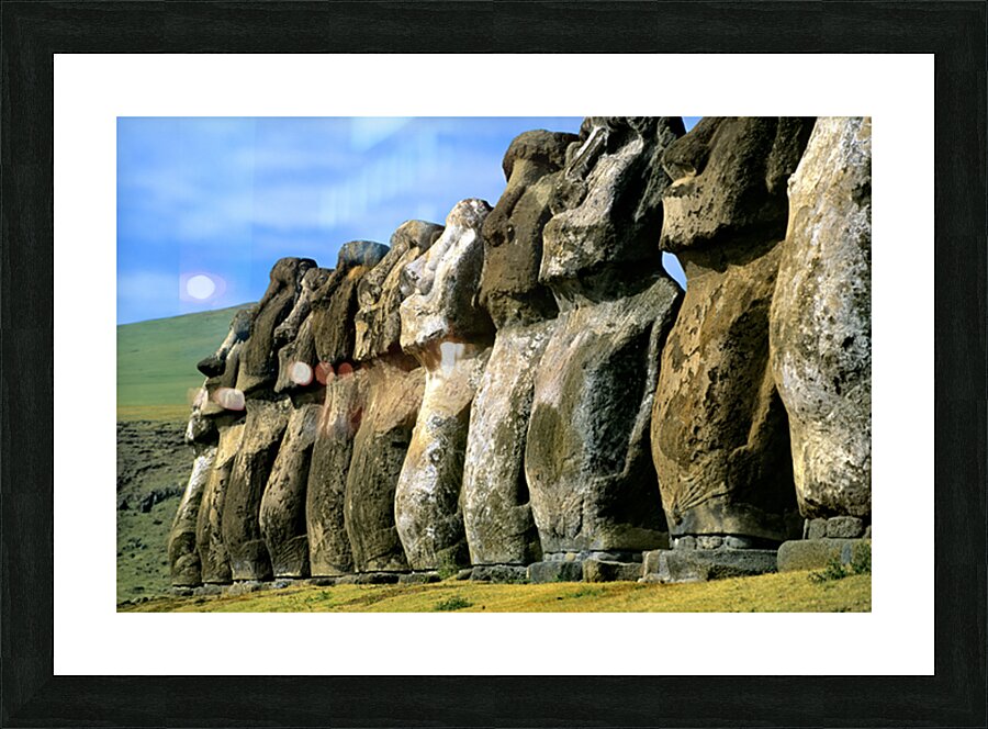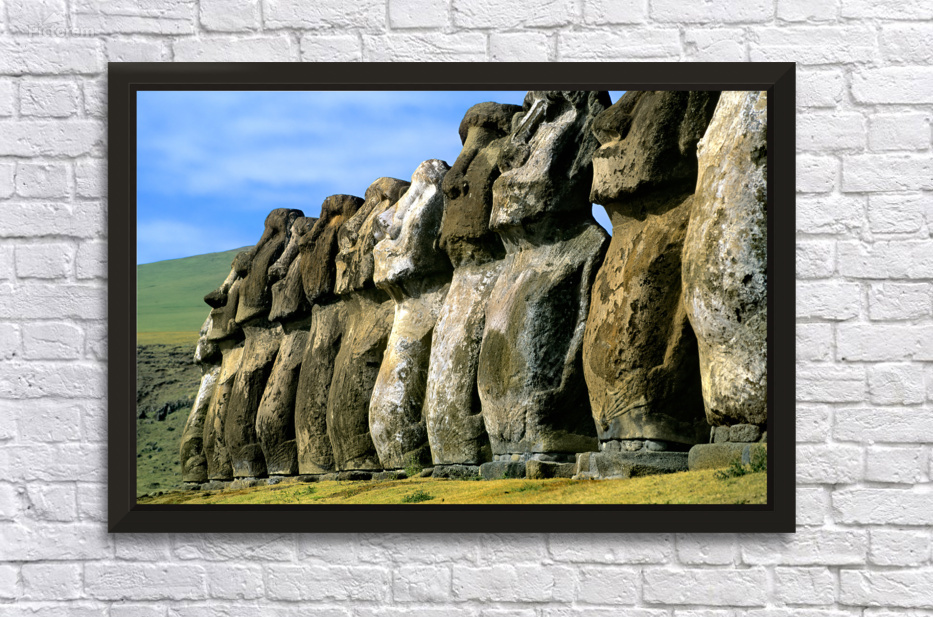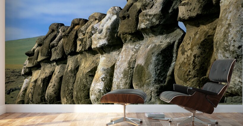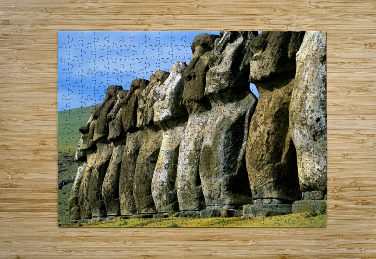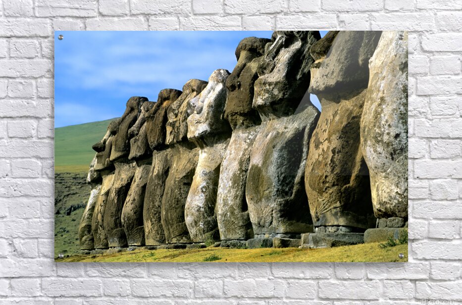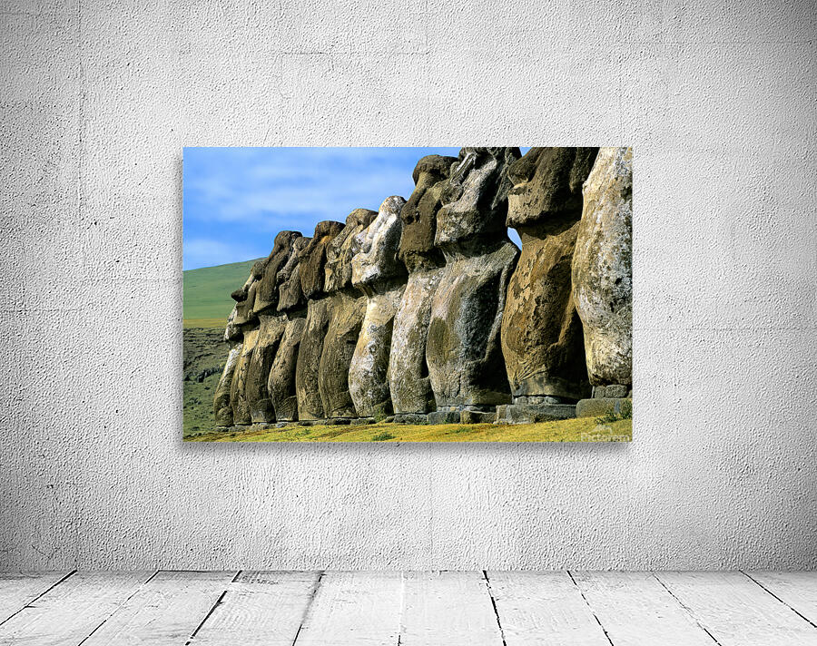 Ancient Moai statues stand on Easter Island Chile. Carved by the Rapa Nui people they represent ancestors watching over the island.