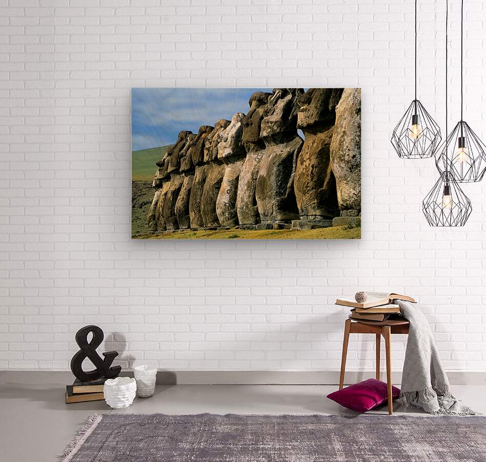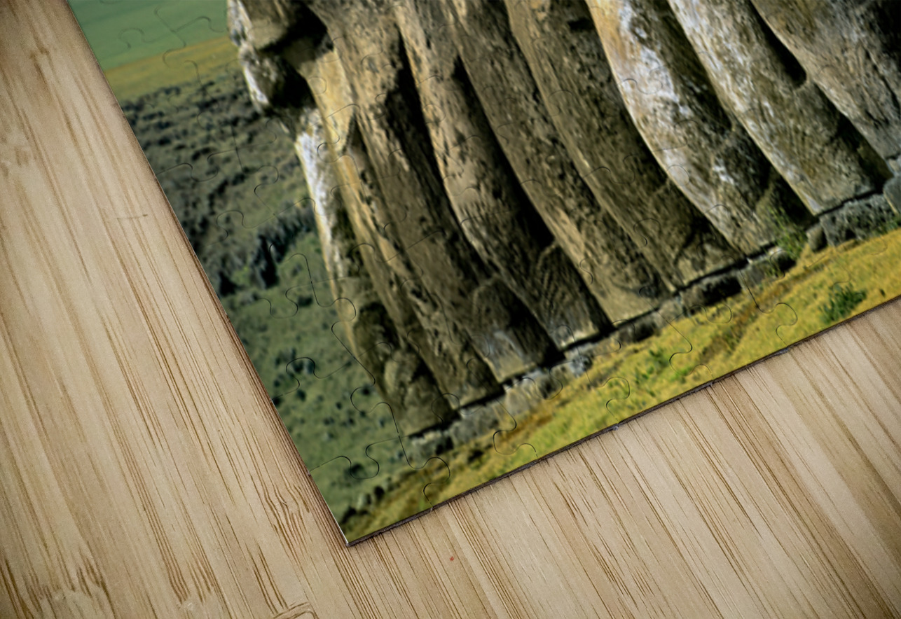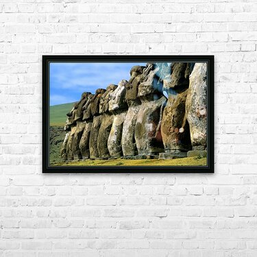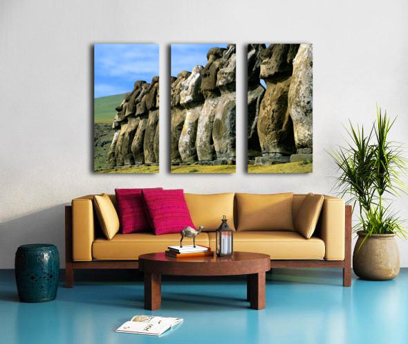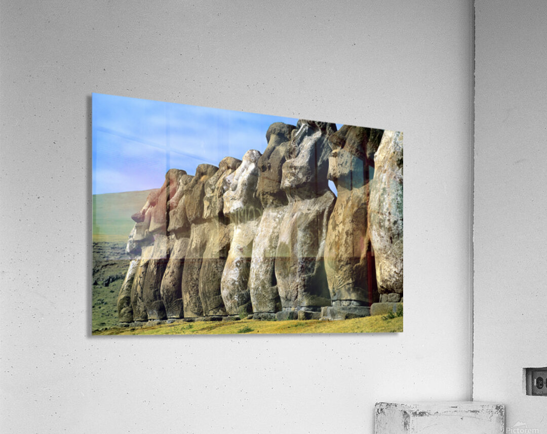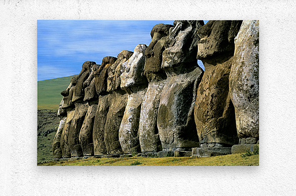 Ancient Moai statues stand on Easter Island Chile. Carved by the Rapa Nui people they represent ancestors watching over the island.