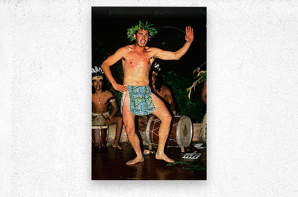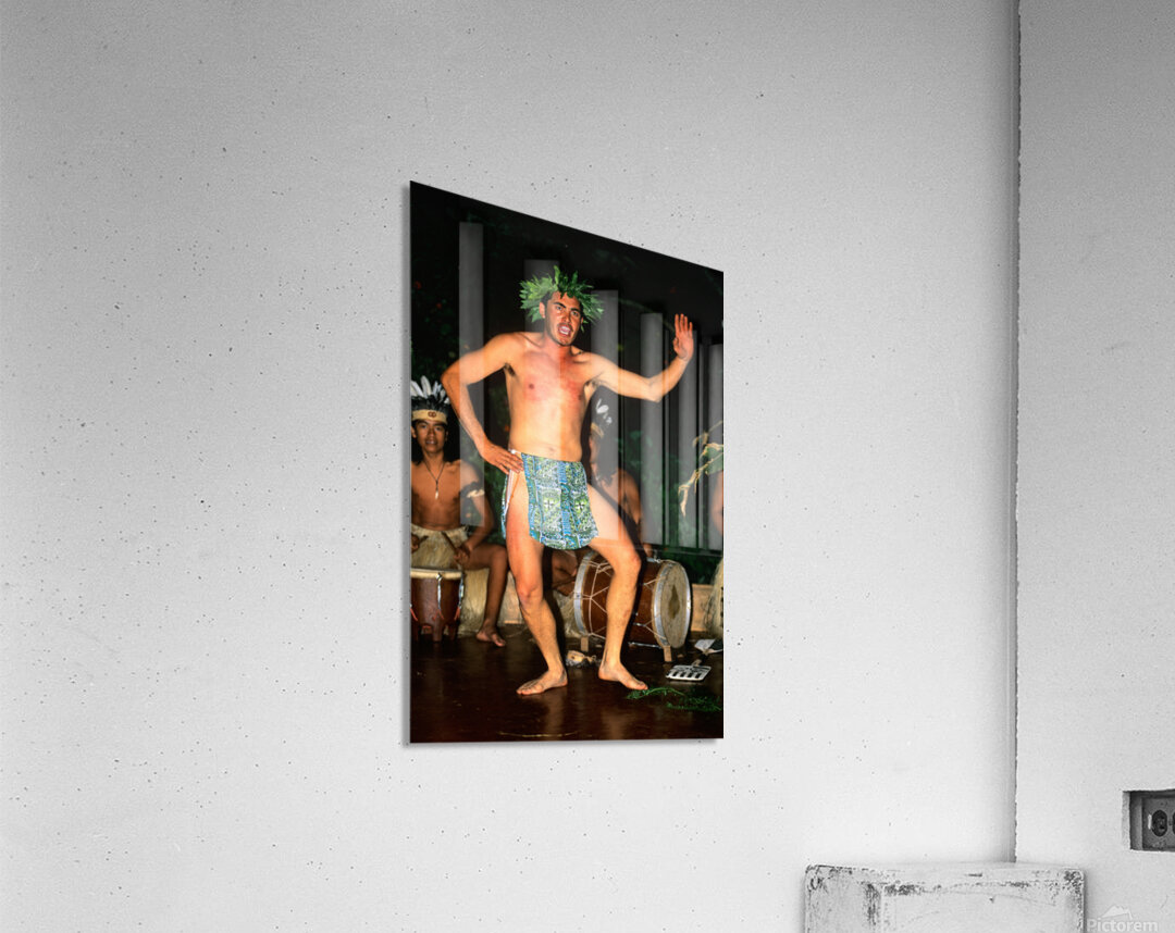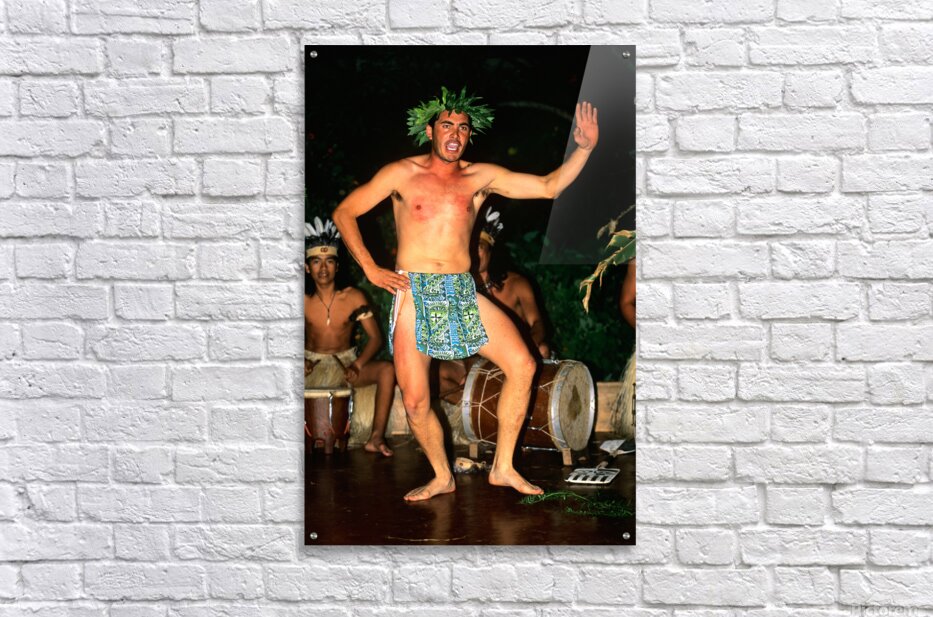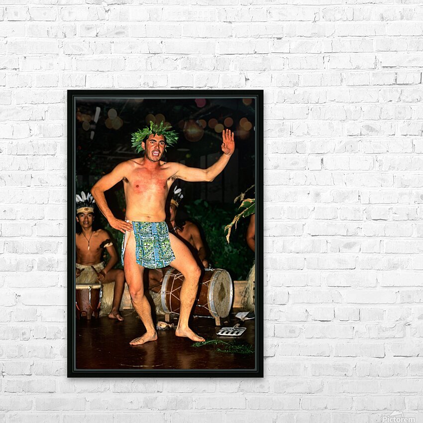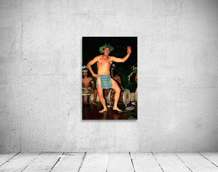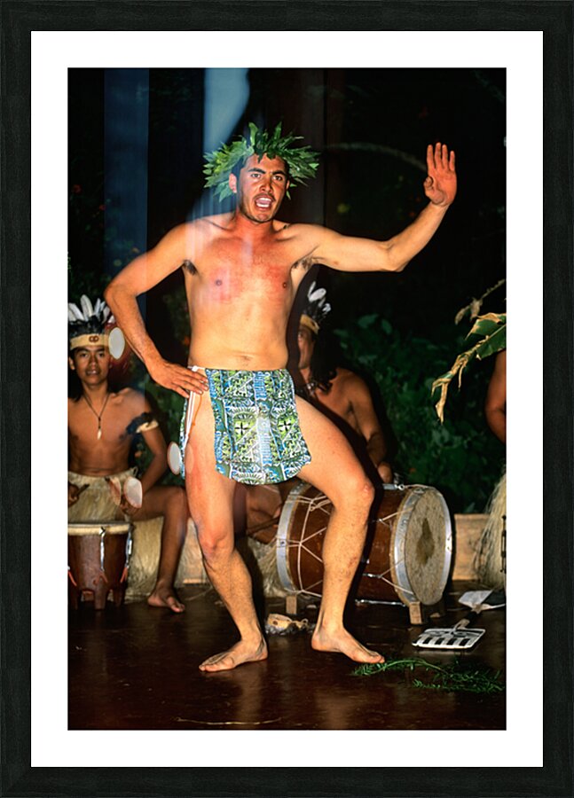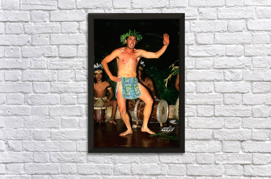 "Man performs traditional dance on Easter Island during night eve" in a framed print.