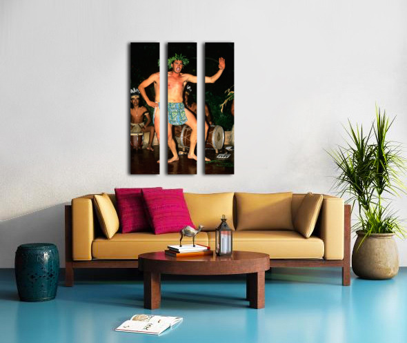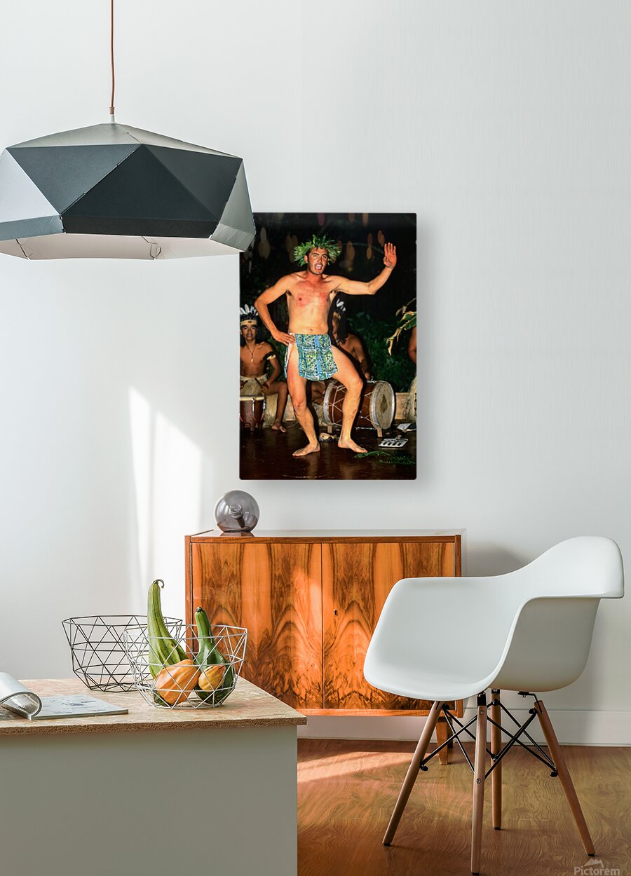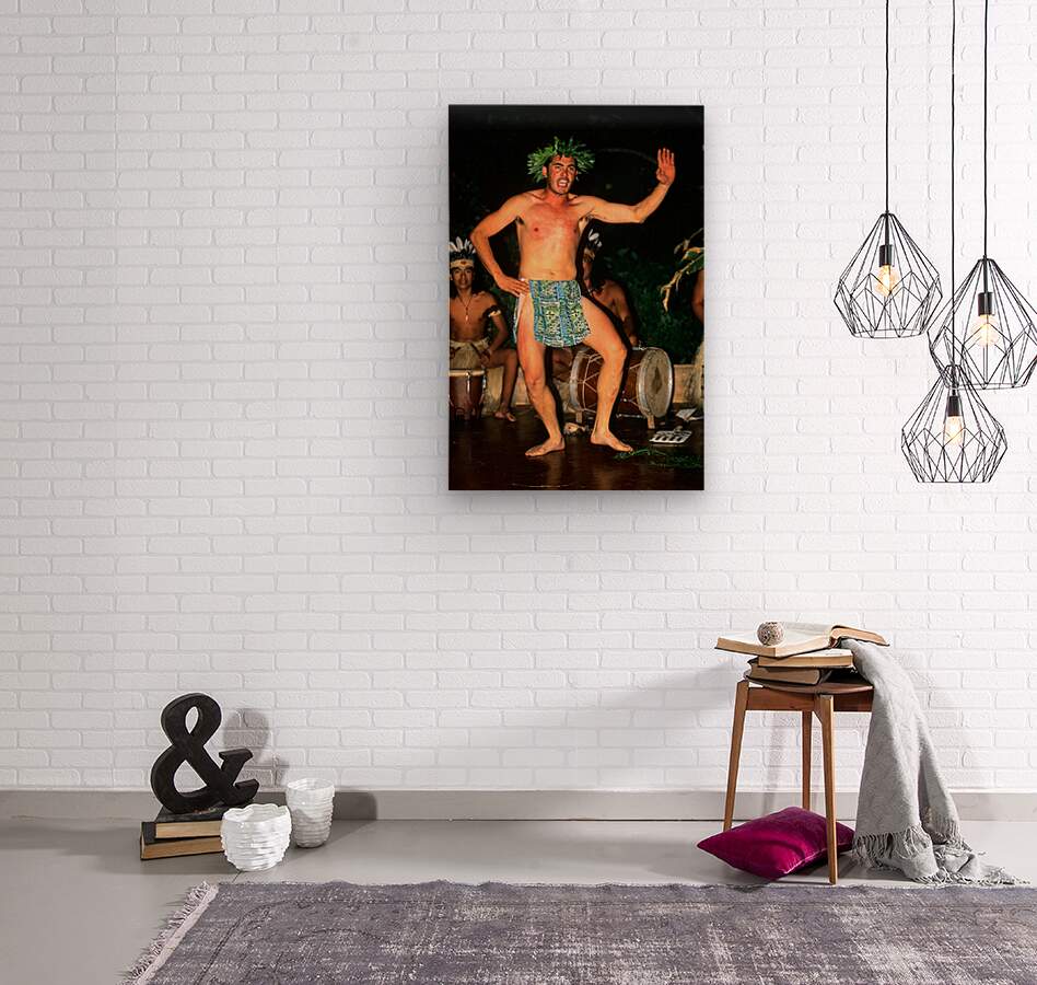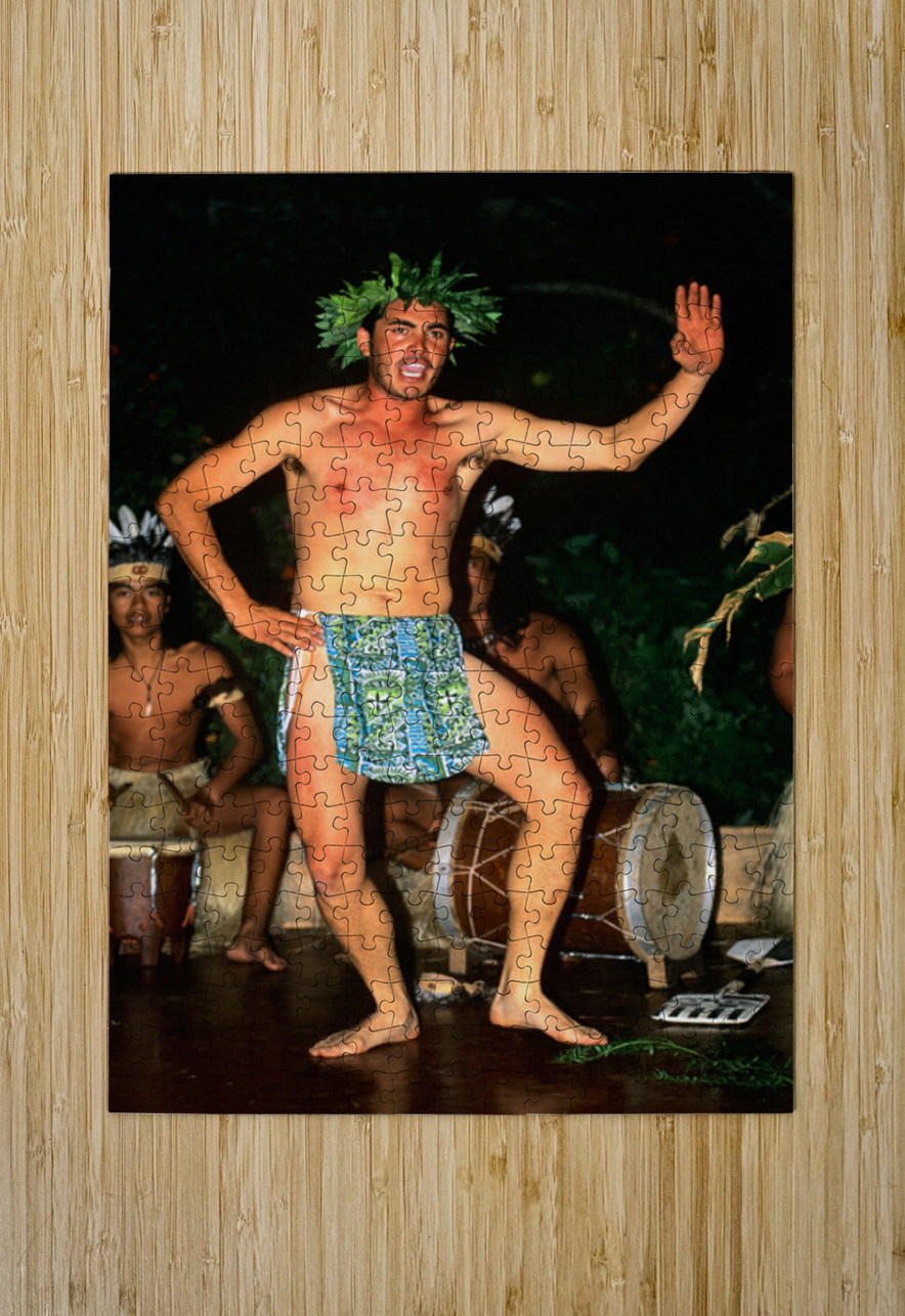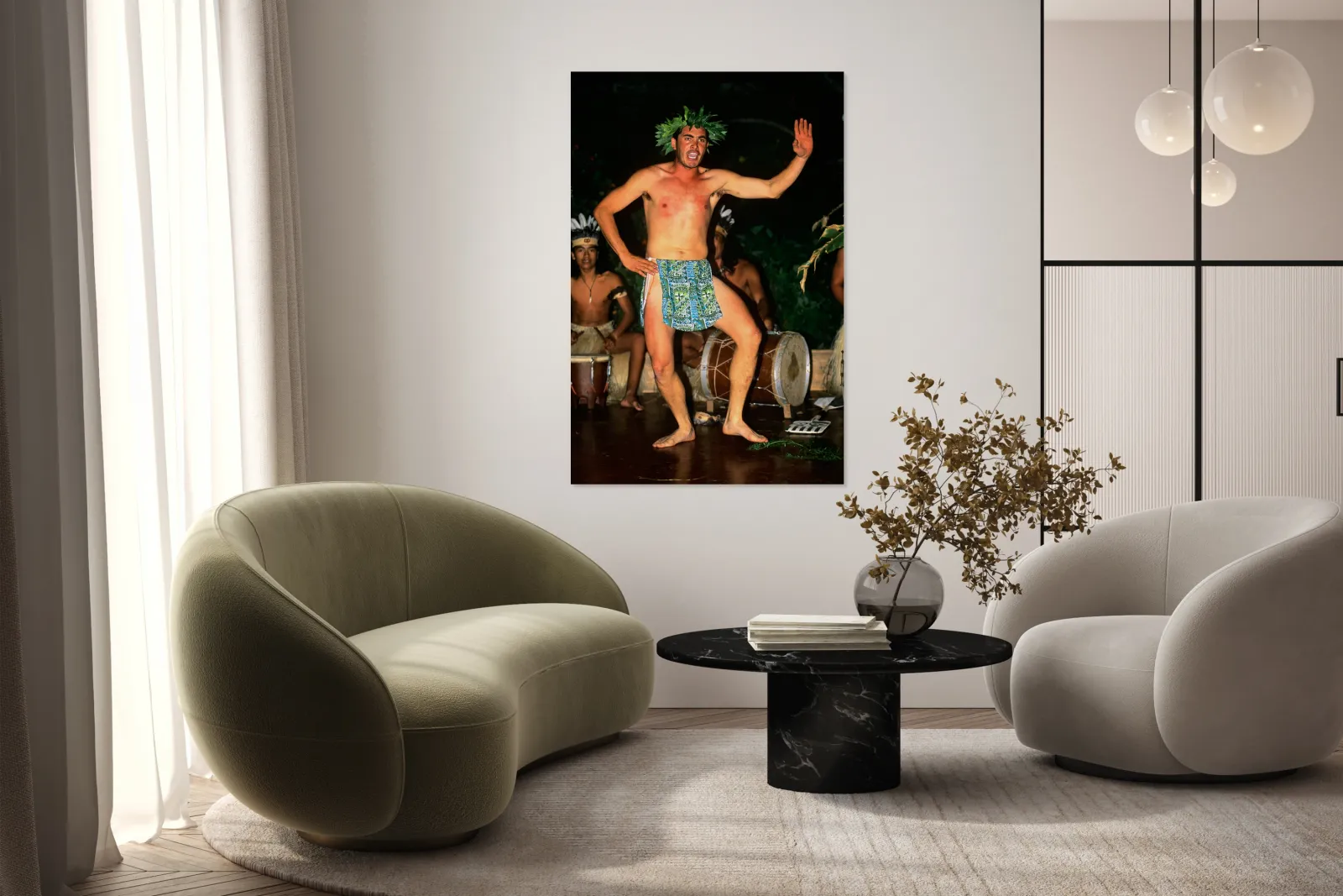 "Man performs traditional dance on Easter Island during night eve" in a framed print.