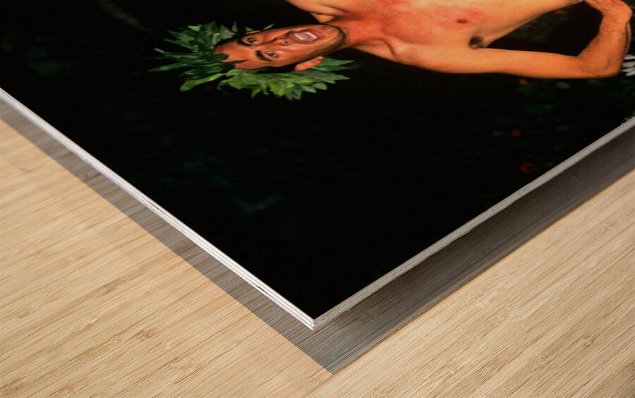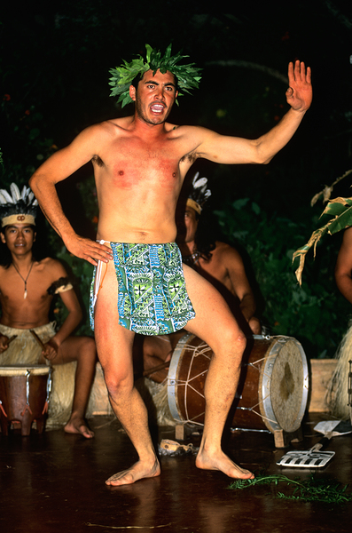 A man with a leaf crown dances with energy as drummers play during a night event on Easter Island. The crowd enjoys the cultural show.