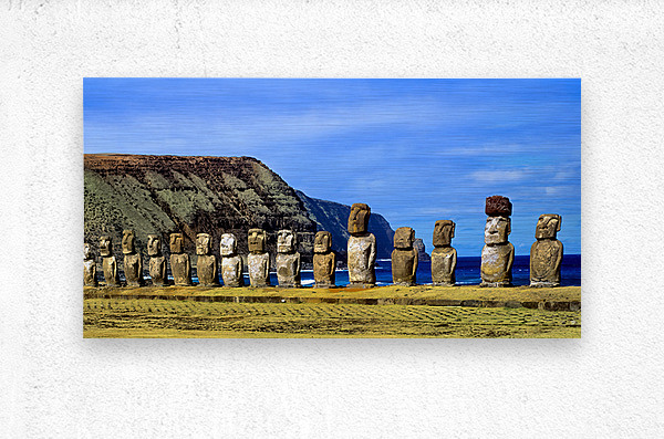 ABOUT THIS ARTWORK: EASTER ISLAND MOAI STATUES AGAINST OCEAN AND CLIFFS.