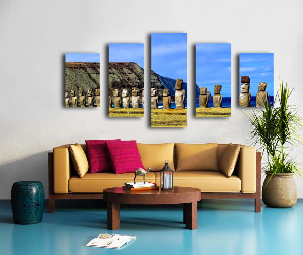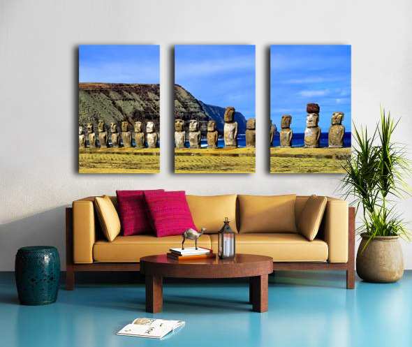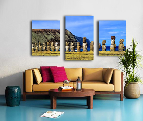 Easter Island Moai statues against ocean and cliffs. Wood print