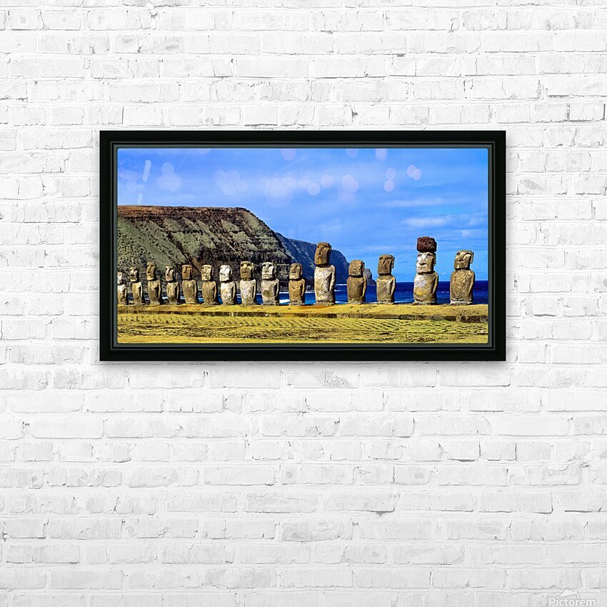 Easter Island Moai statues against ocean and cliffs. Picture Frame Printing