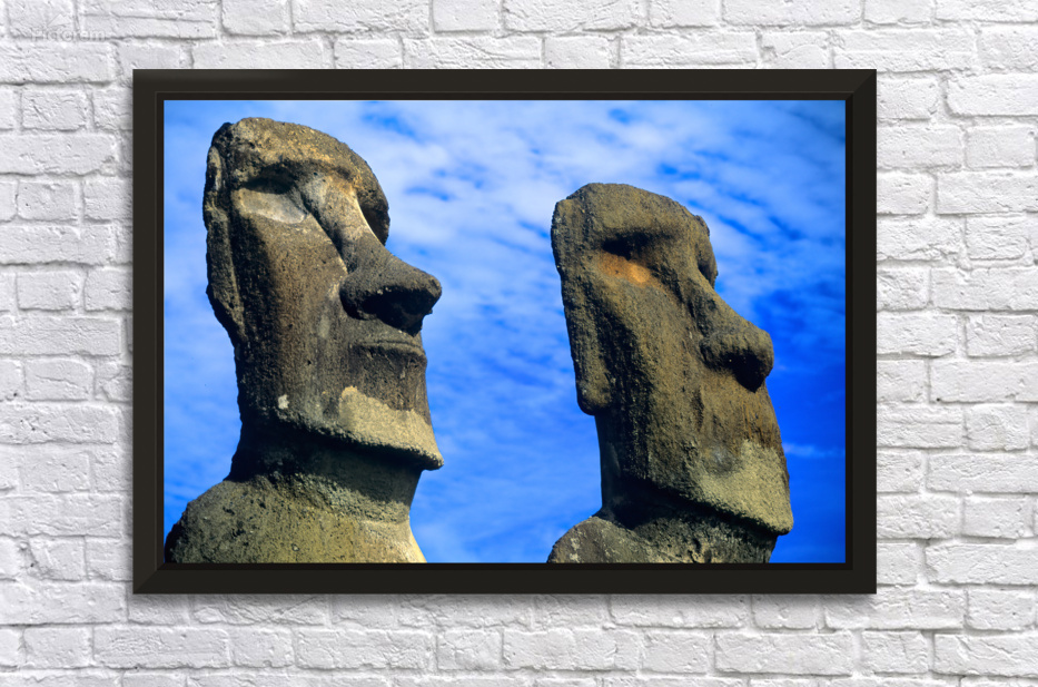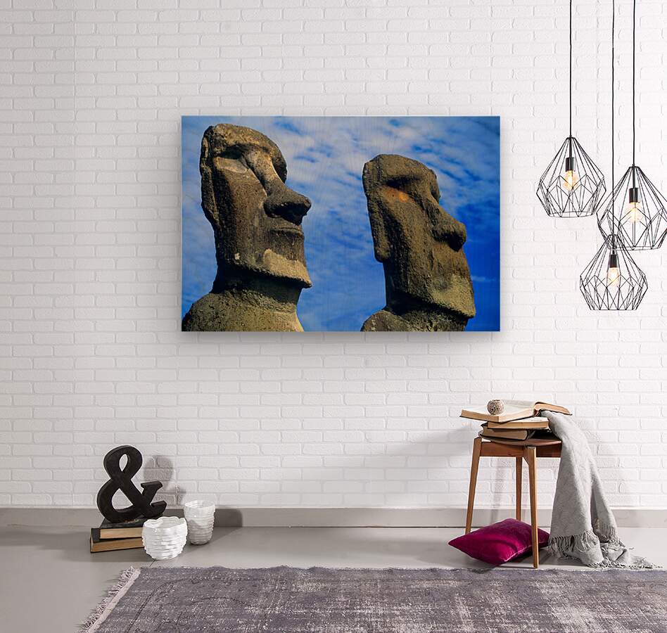Two ancient Moai statues carved by the Rapa Nui people stand on Easter Island Chile honoring deified ancestors under a blue sky.