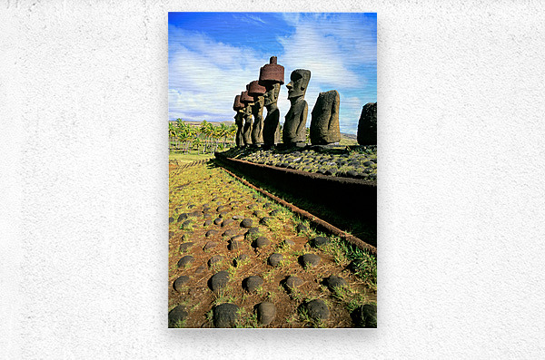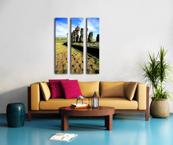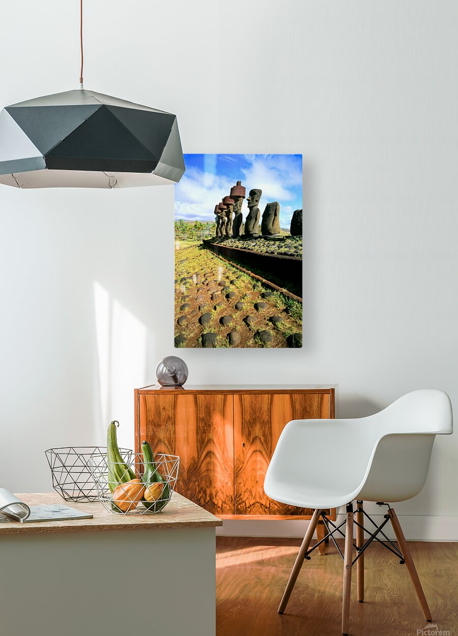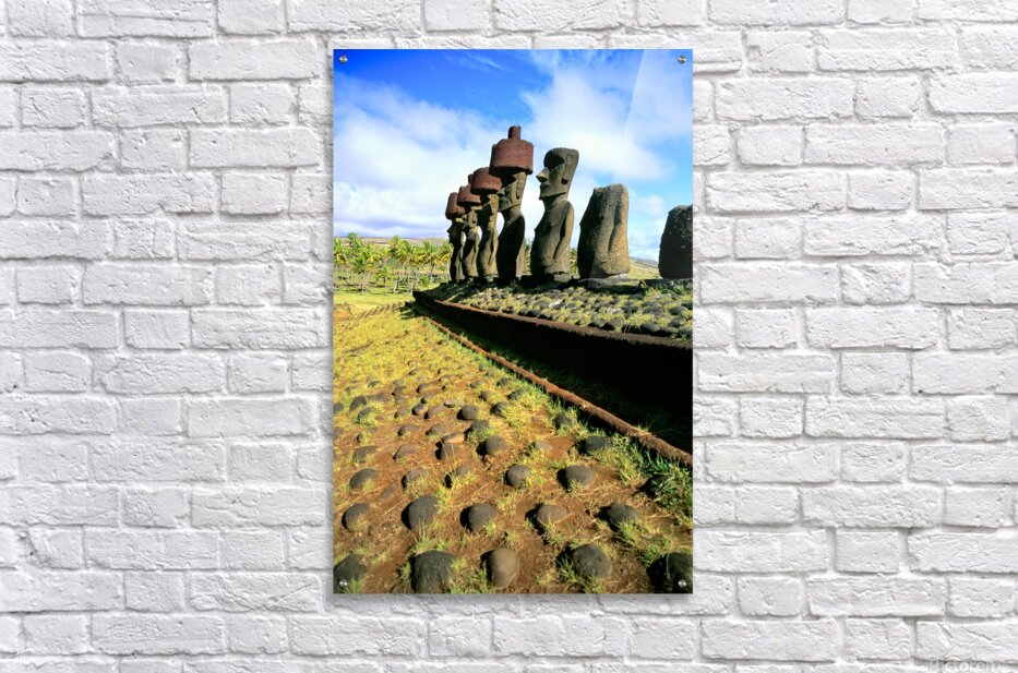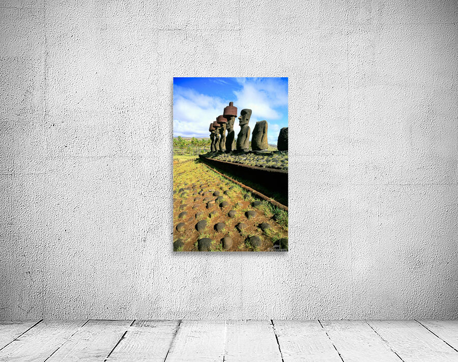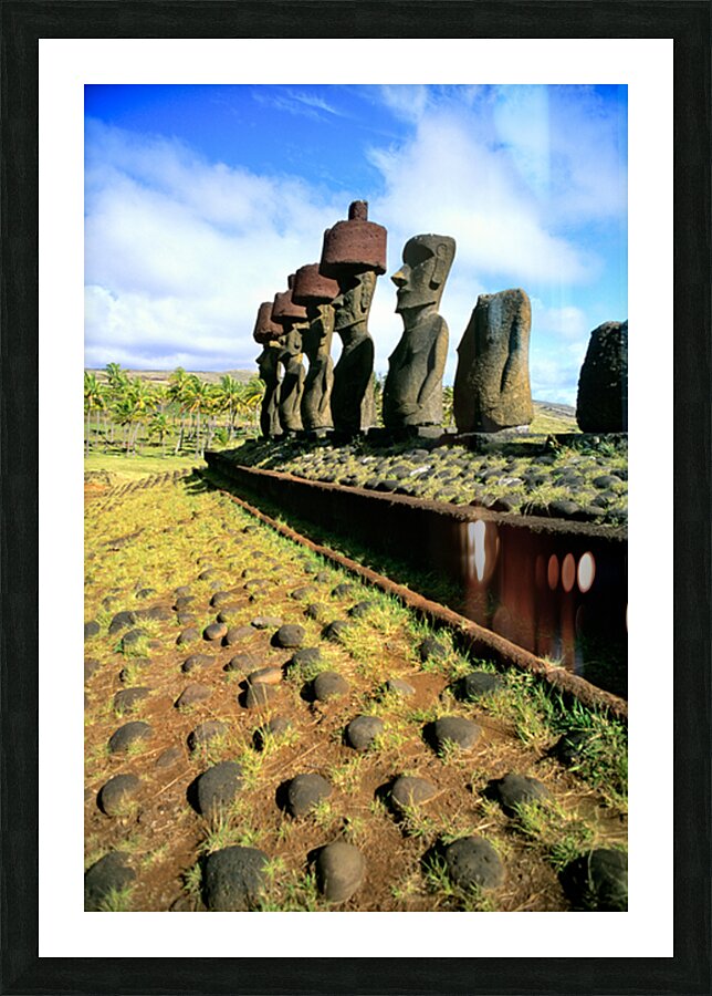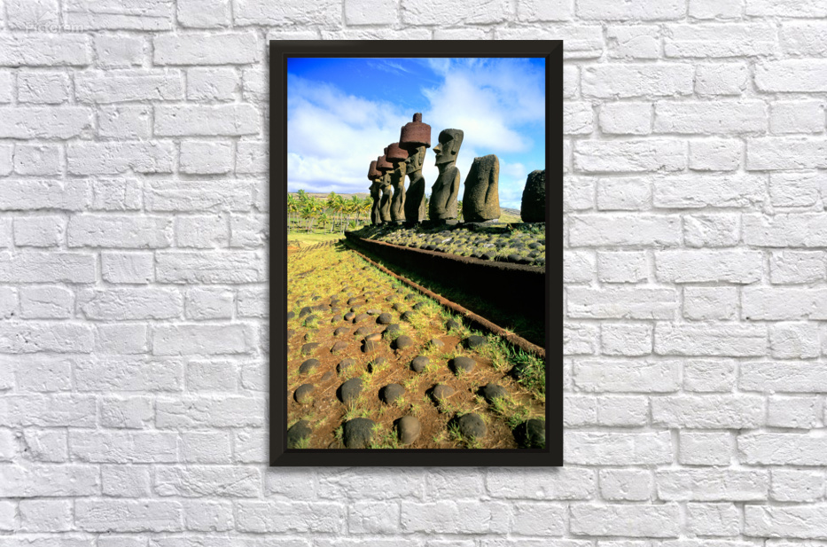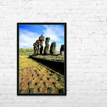 "Ancient Moai statues stand tall on Easter Island." in a framed print.