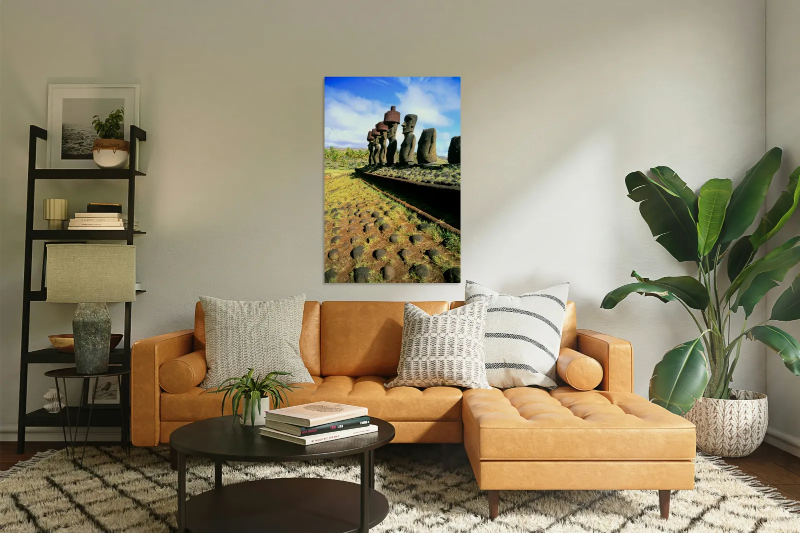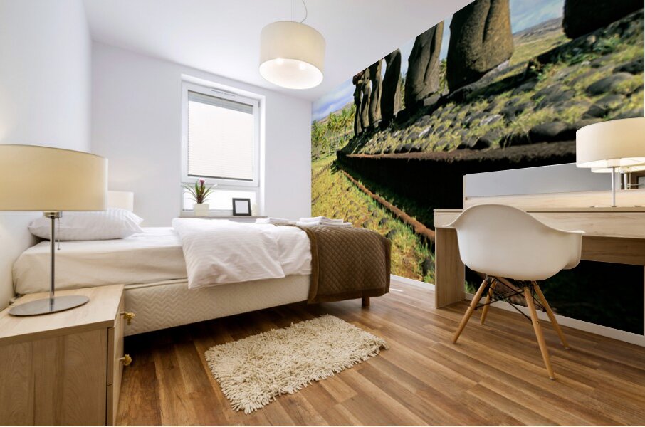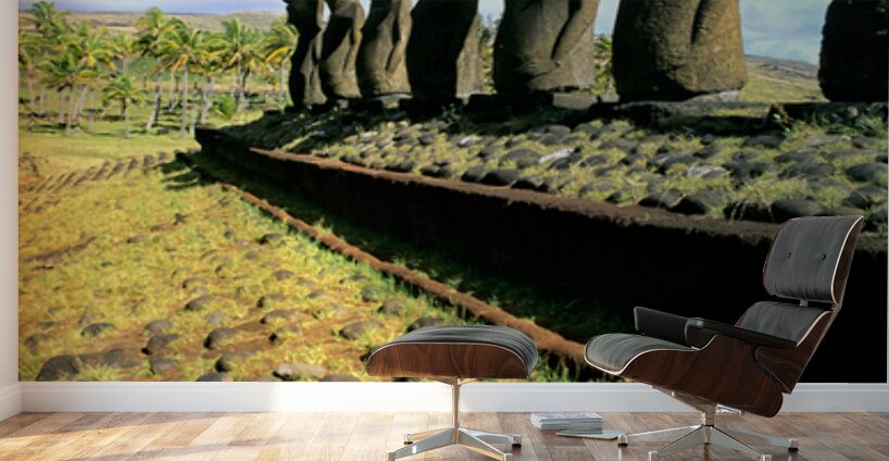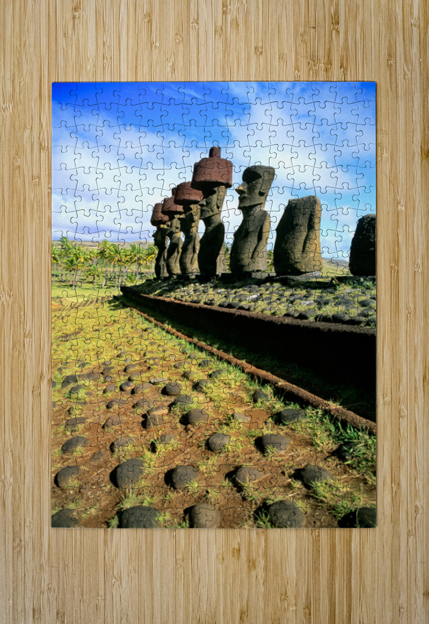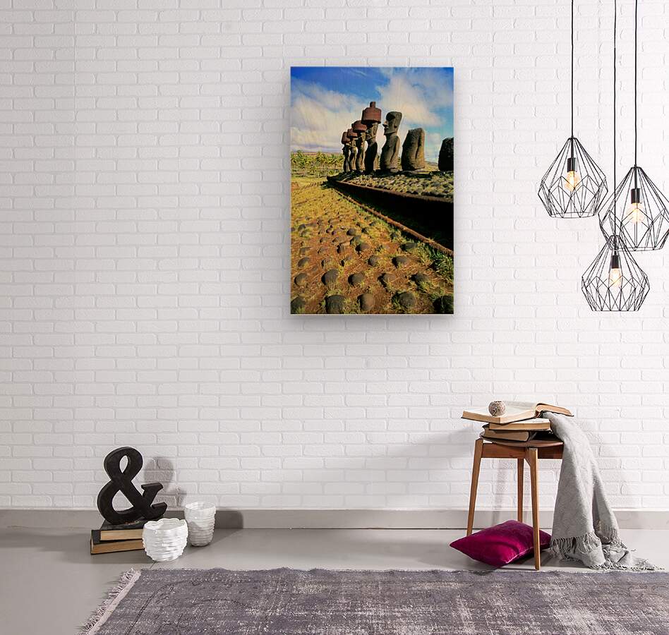 "Ancient Moai statues stand tall on Easter Island." in a framed print.