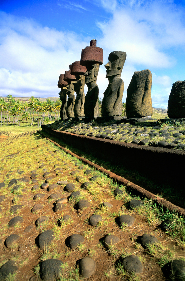 Moai statues ancestral figures of the Rapa Nui people stand on an Ahu on Easter Island Chile honoring ancestors and protecting the island.
