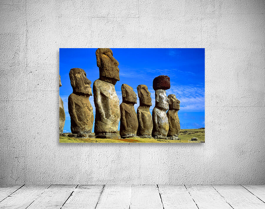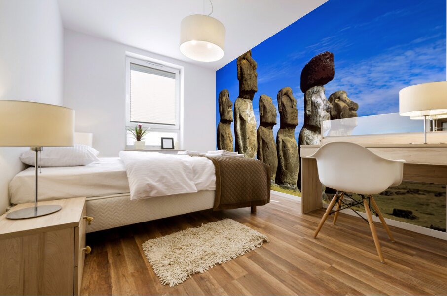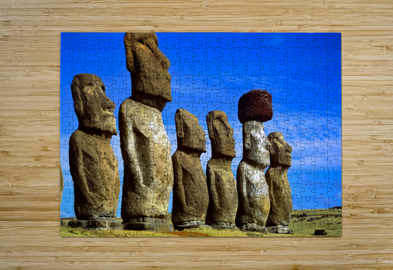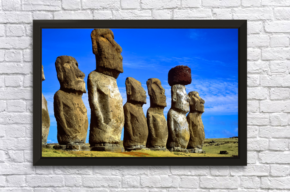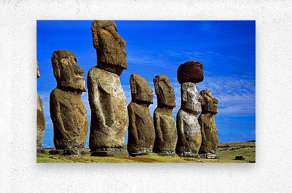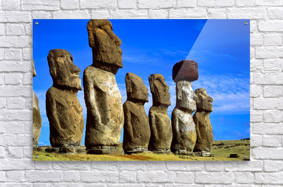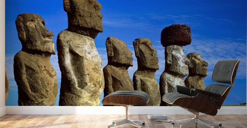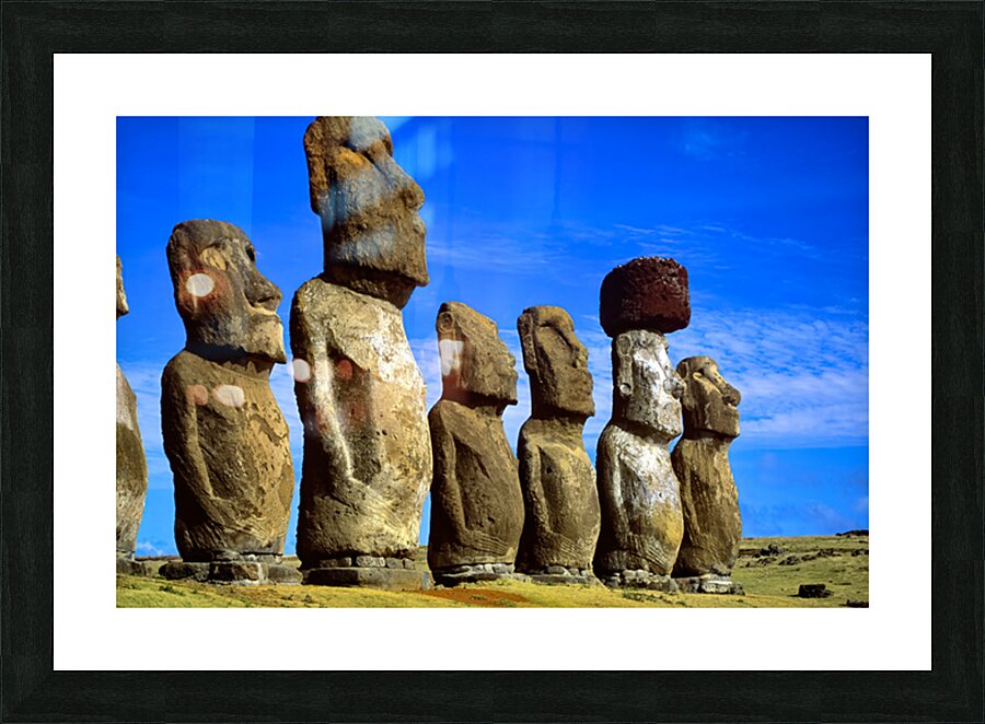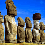 Moai statues carved by ancient Rapa Nui people on Easter Island Chile stand as ancestral guardians. One features a red Pukao.