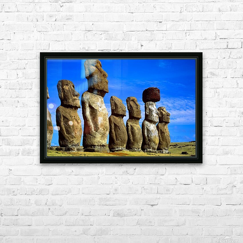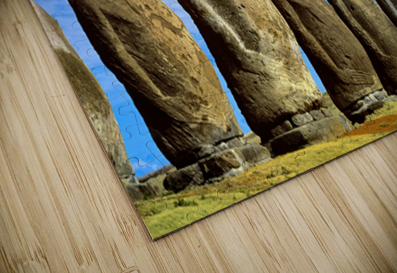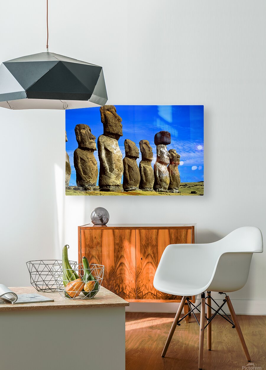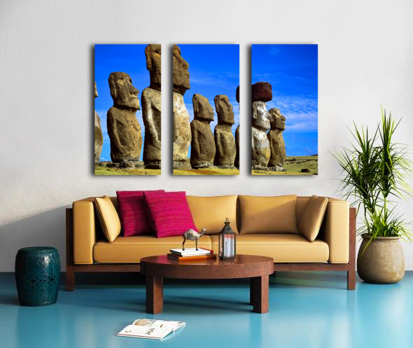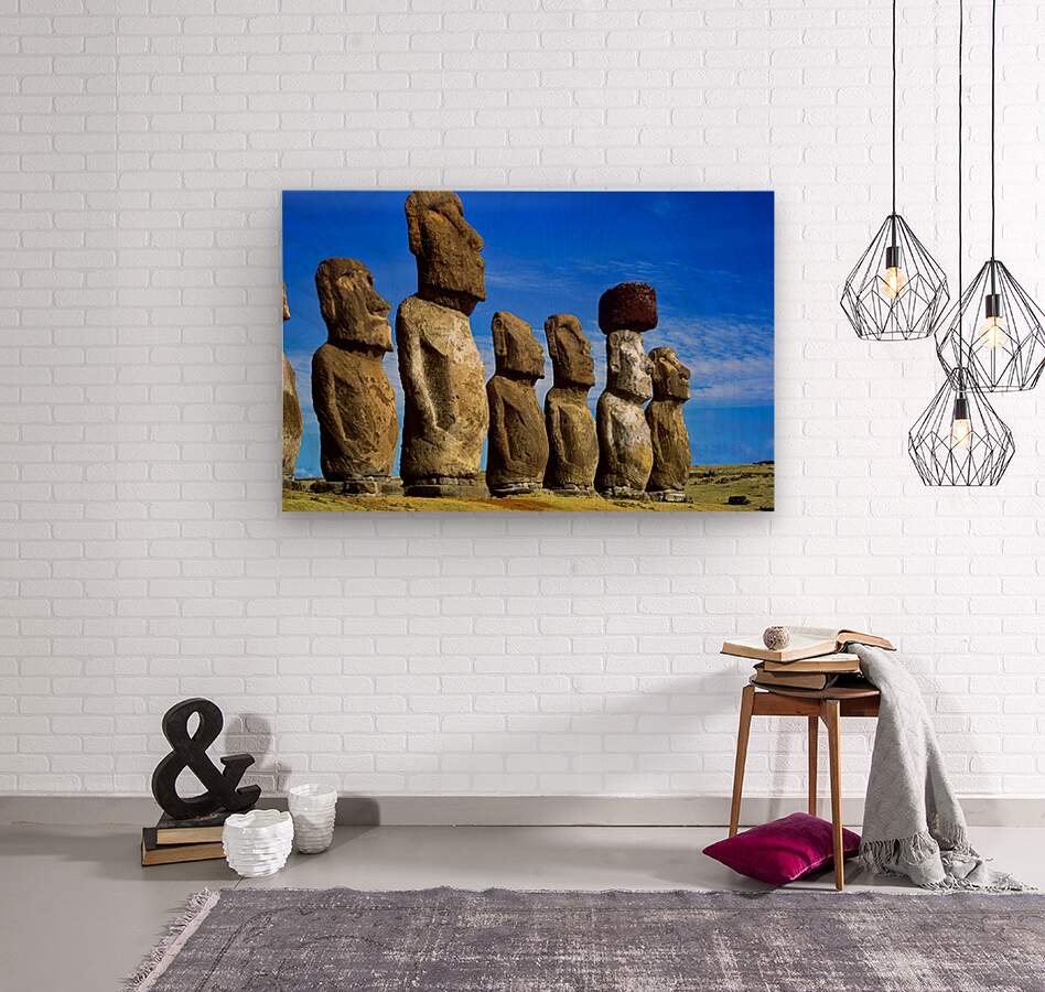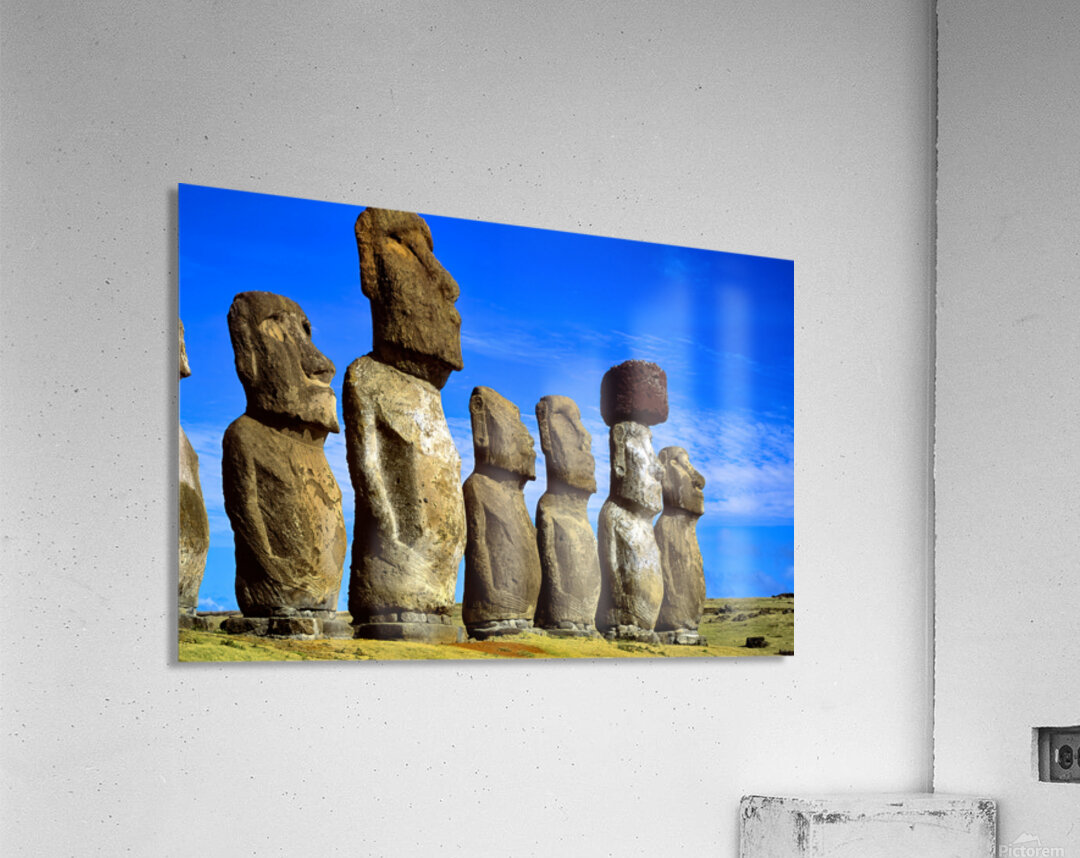 Moai statues carved by ancient Rapa Nui people on Easter Island Chile stand as ancestral guardians. One features a red Pukao.