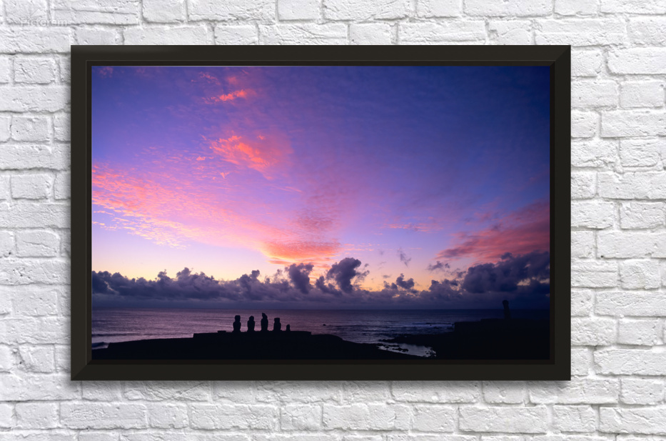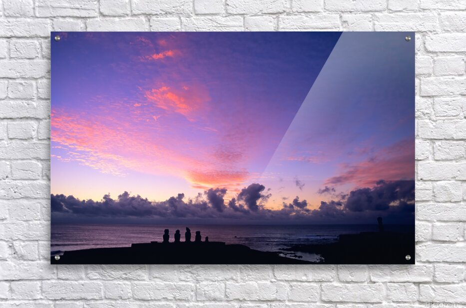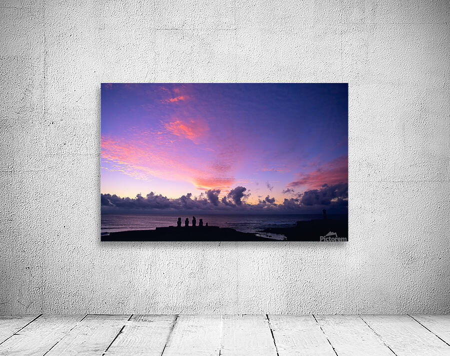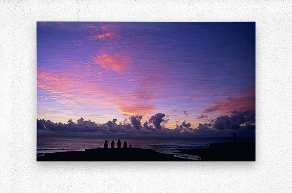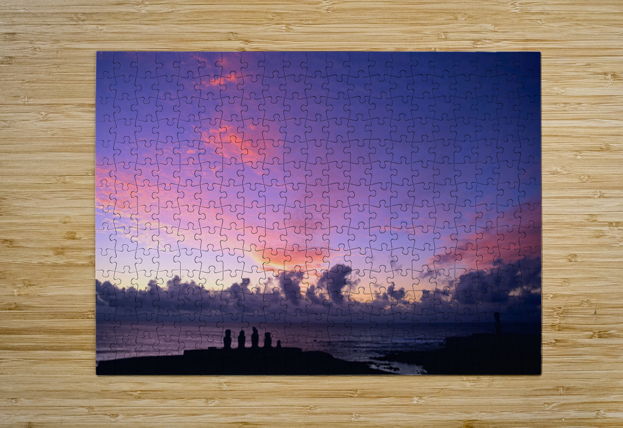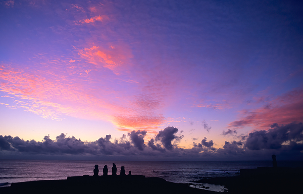 Moai statues silhouetted against a stunning purple and pink sunset over the Pacific Ocean on Easter Island Chile showcasing ancient Rapa Nui culture.