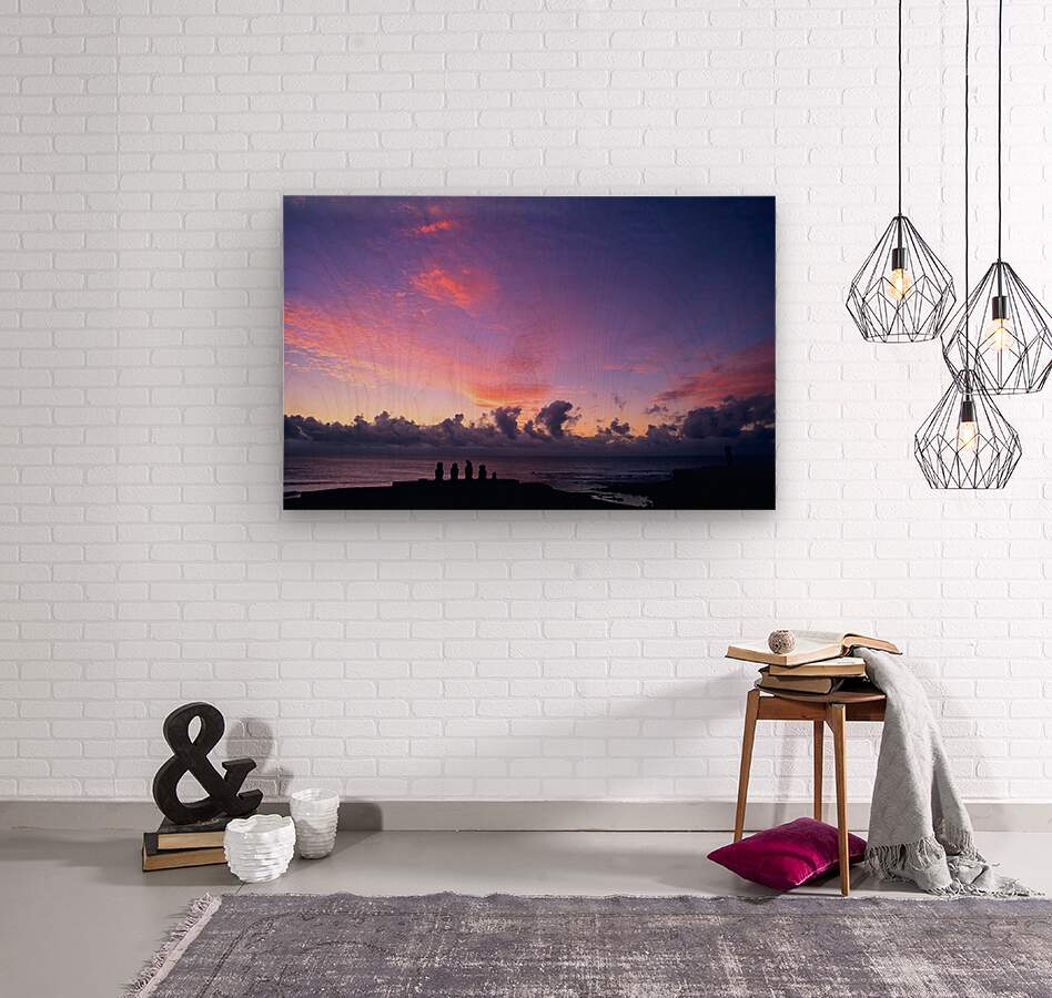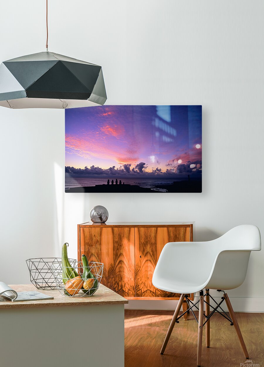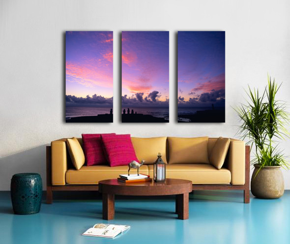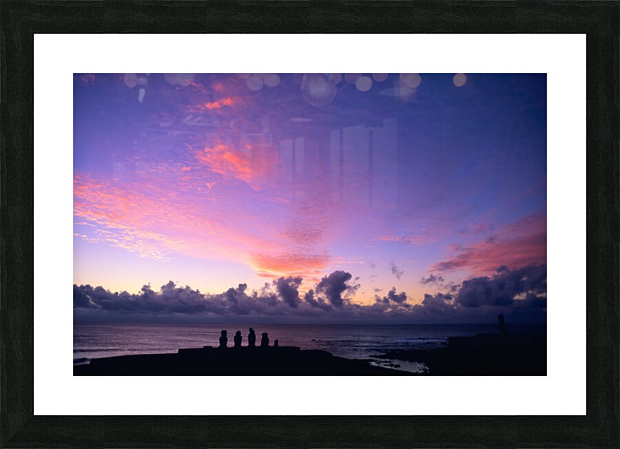 Moai statues silhouetted against a stunning purple and pink sunset over the Pacific Ocean on Easter Island Chile showcasing ancient Rapa Nui culture.