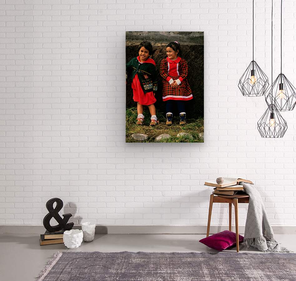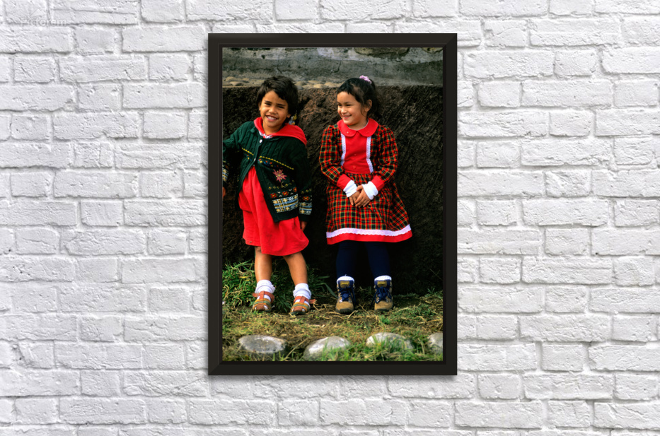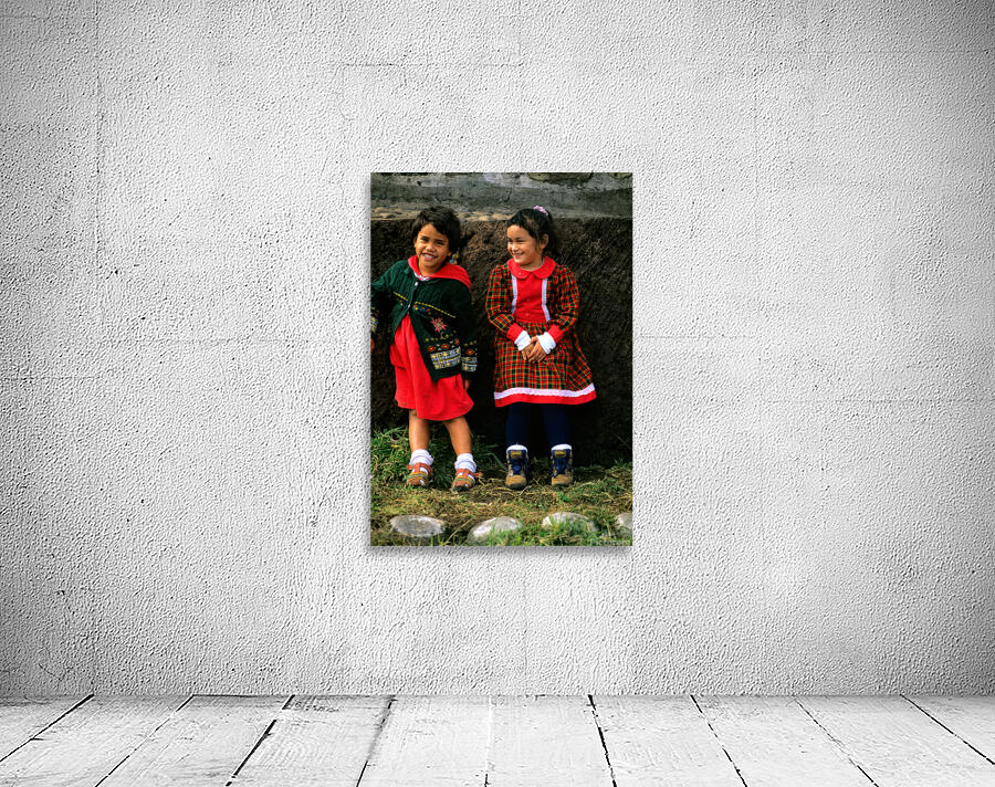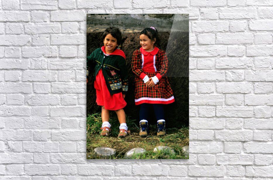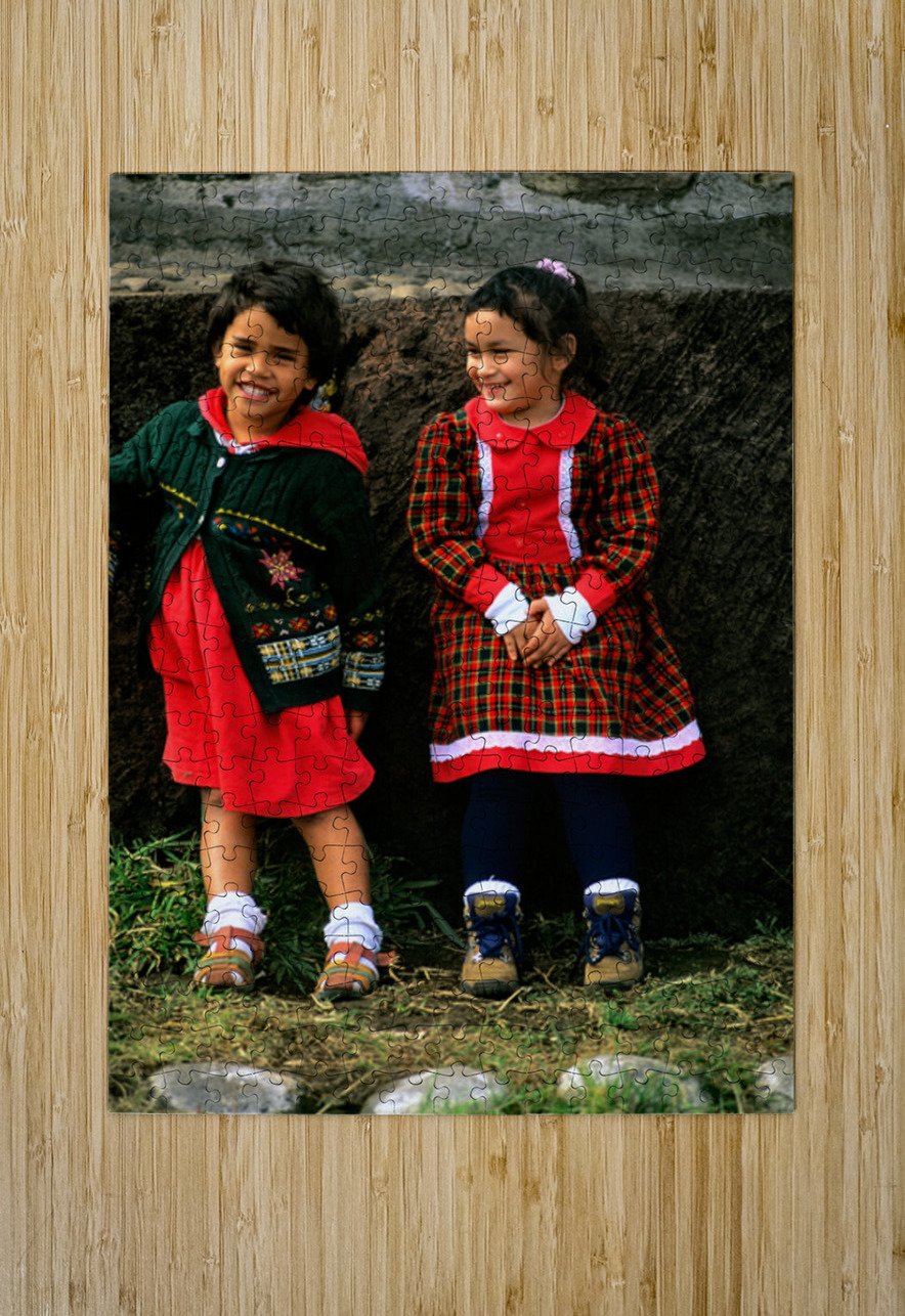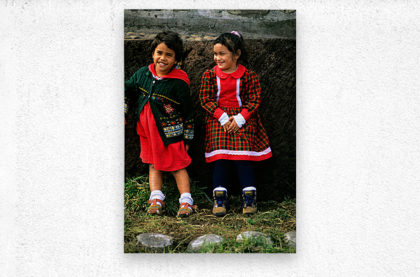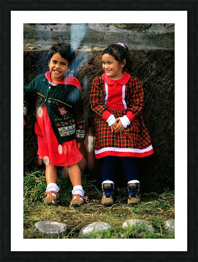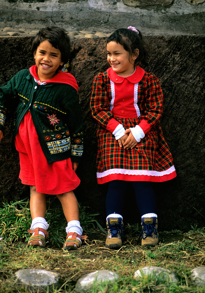 Two joyful girls in colorful patterned clothing smile brightly posing against a textured stone wall outdoors at Easter Island
