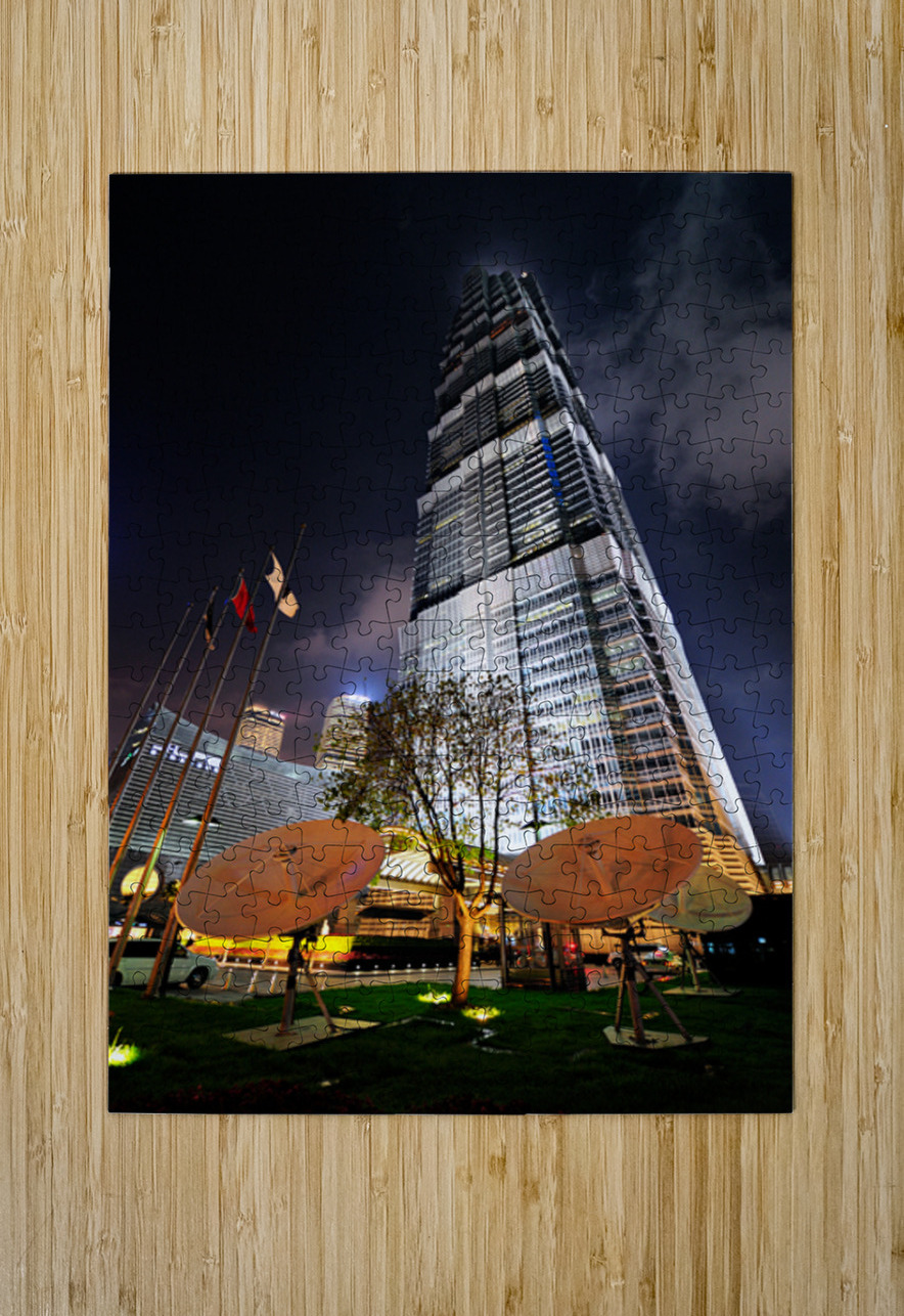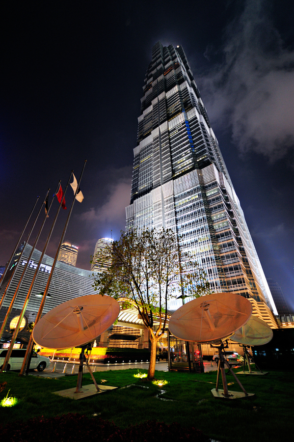 A tall skyscraper shines bright at night alongside large satellite dishes in Shanghai. The scene shows modern architecture and technology.