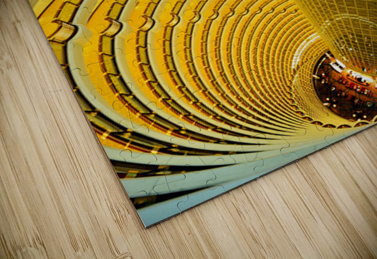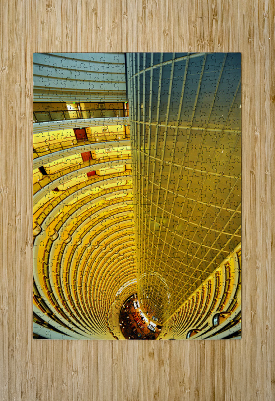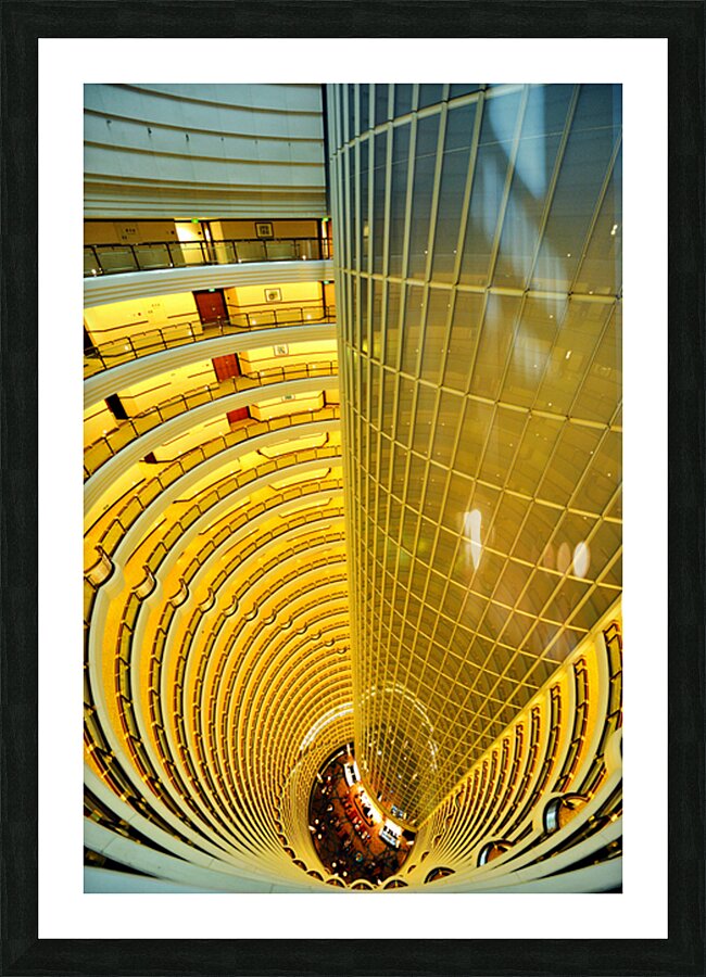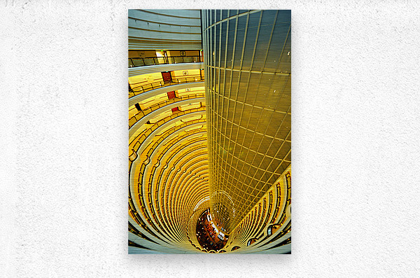 A central glass elevator moves through a large atrium with spiraling floors in a hotel in Shanghai. People gather below on the ground level.
