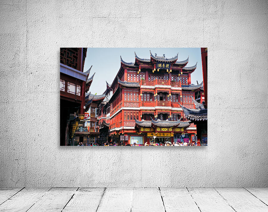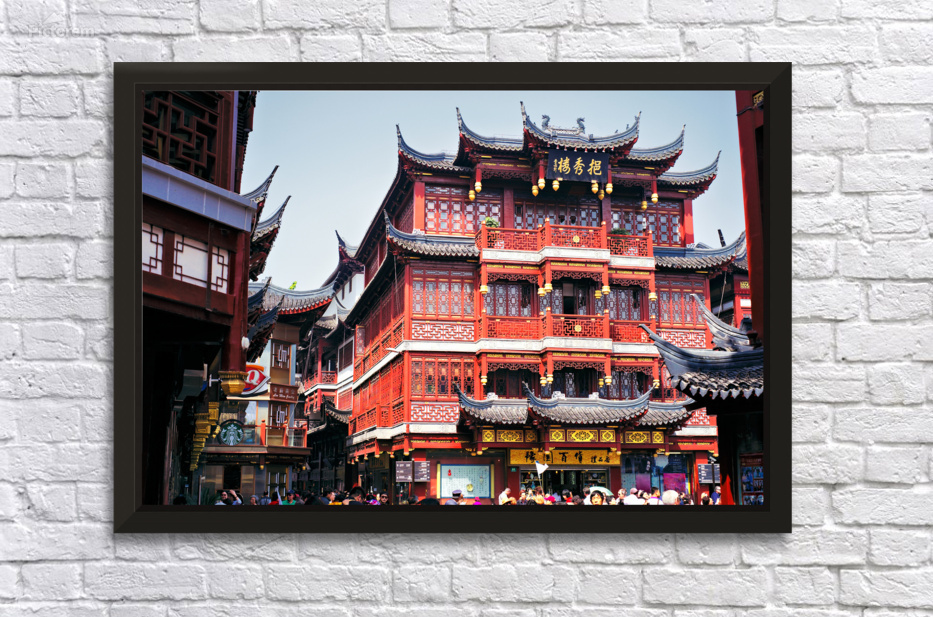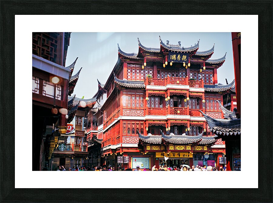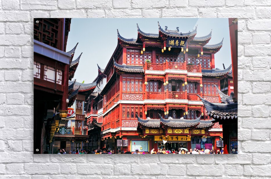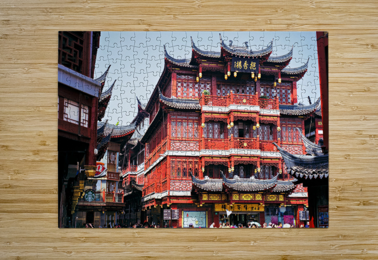People walk through a busy marketplace in Shanghai surrounded by detailed traditional buildings and vendors selling various goods.