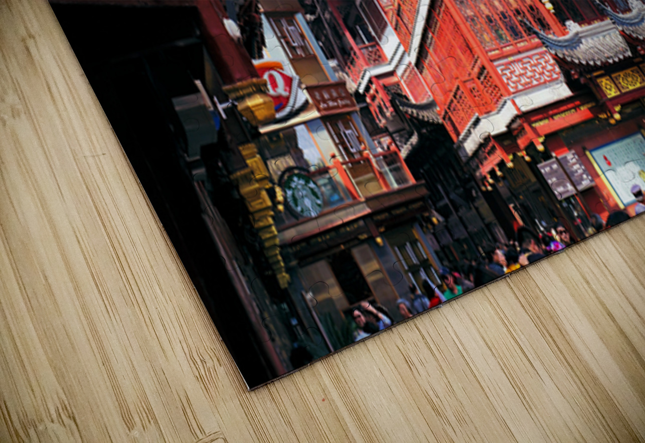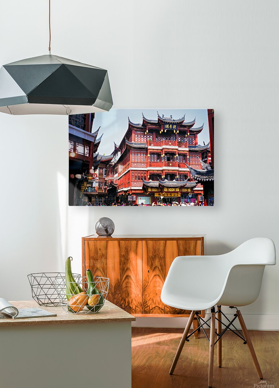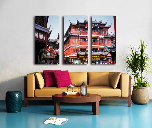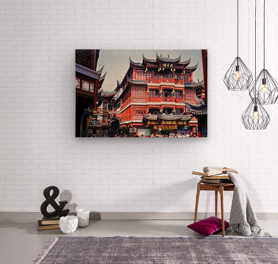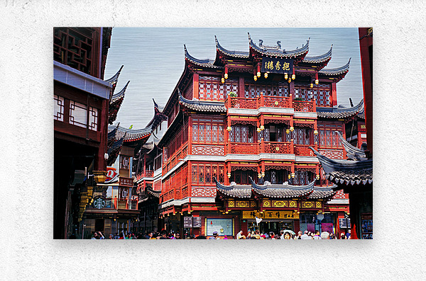 People walk through a busy marketplace in Shanghai surrounded by detailed traditional buildings and vendors selling various goods.