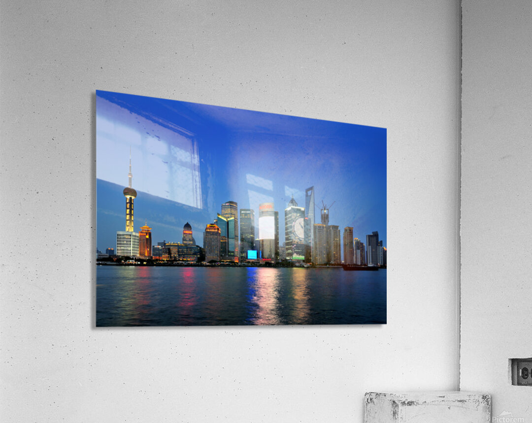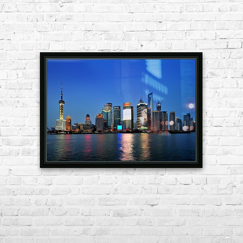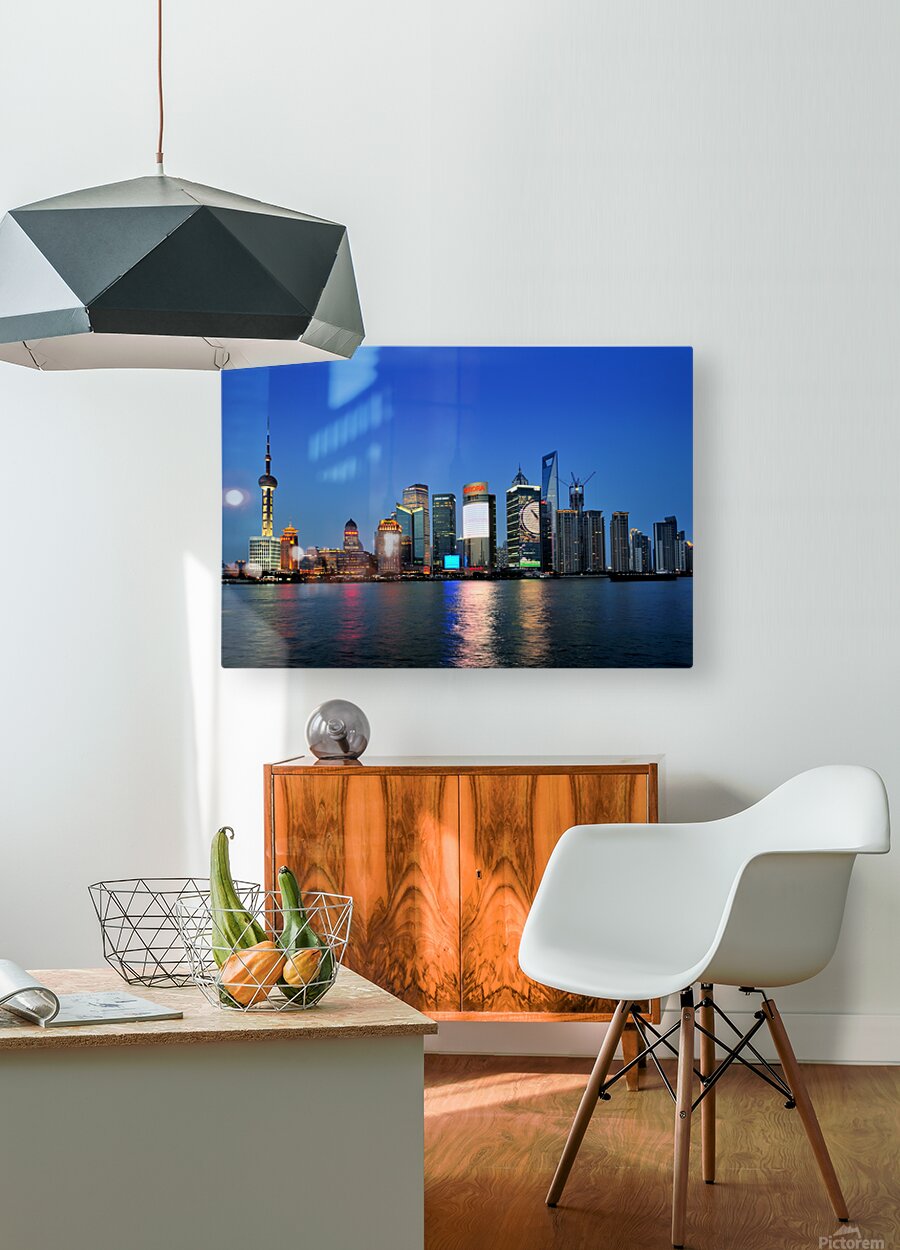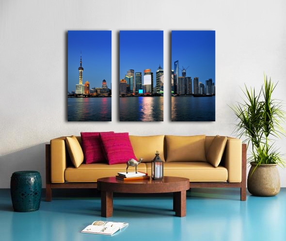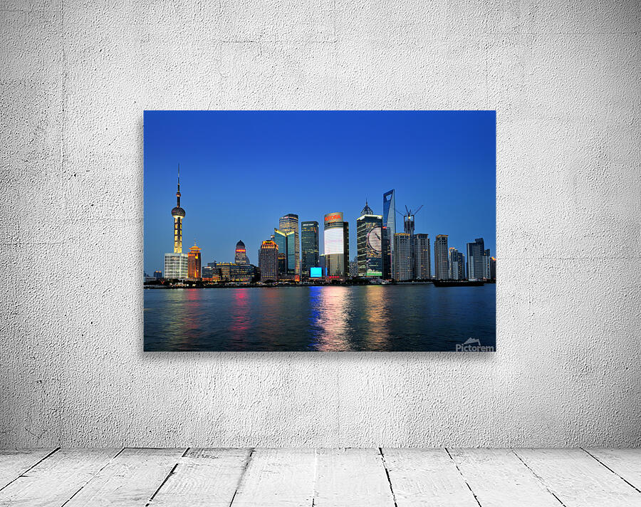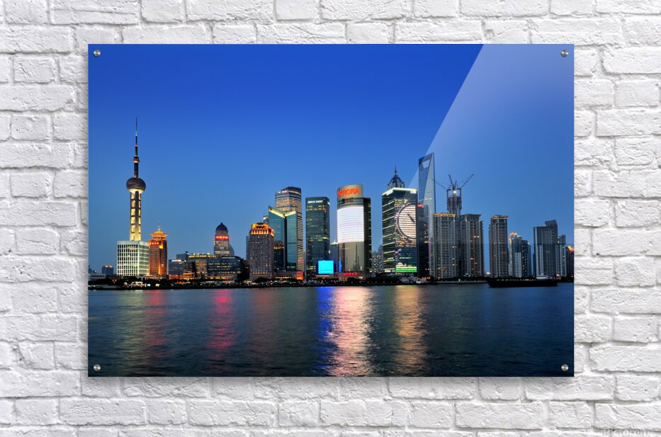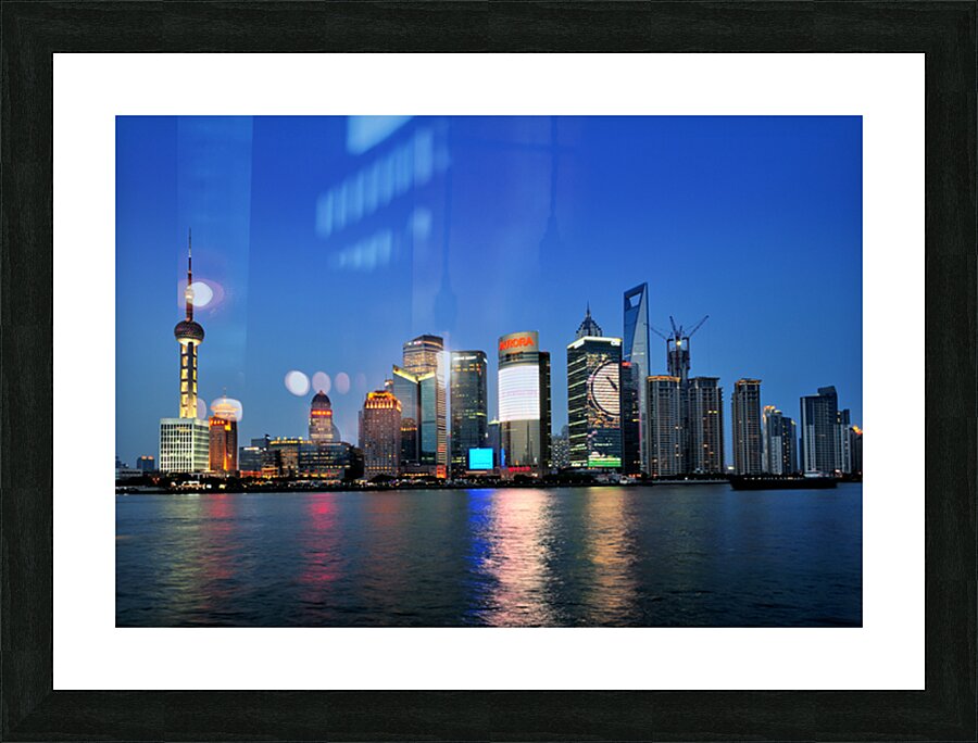 "Shanghai skyline lights up at night over the river" in a framed print.