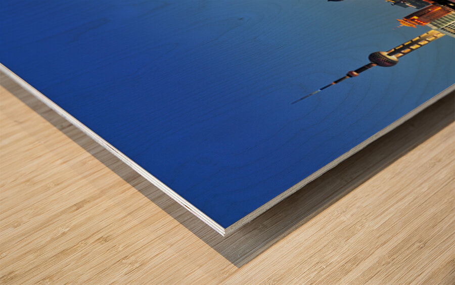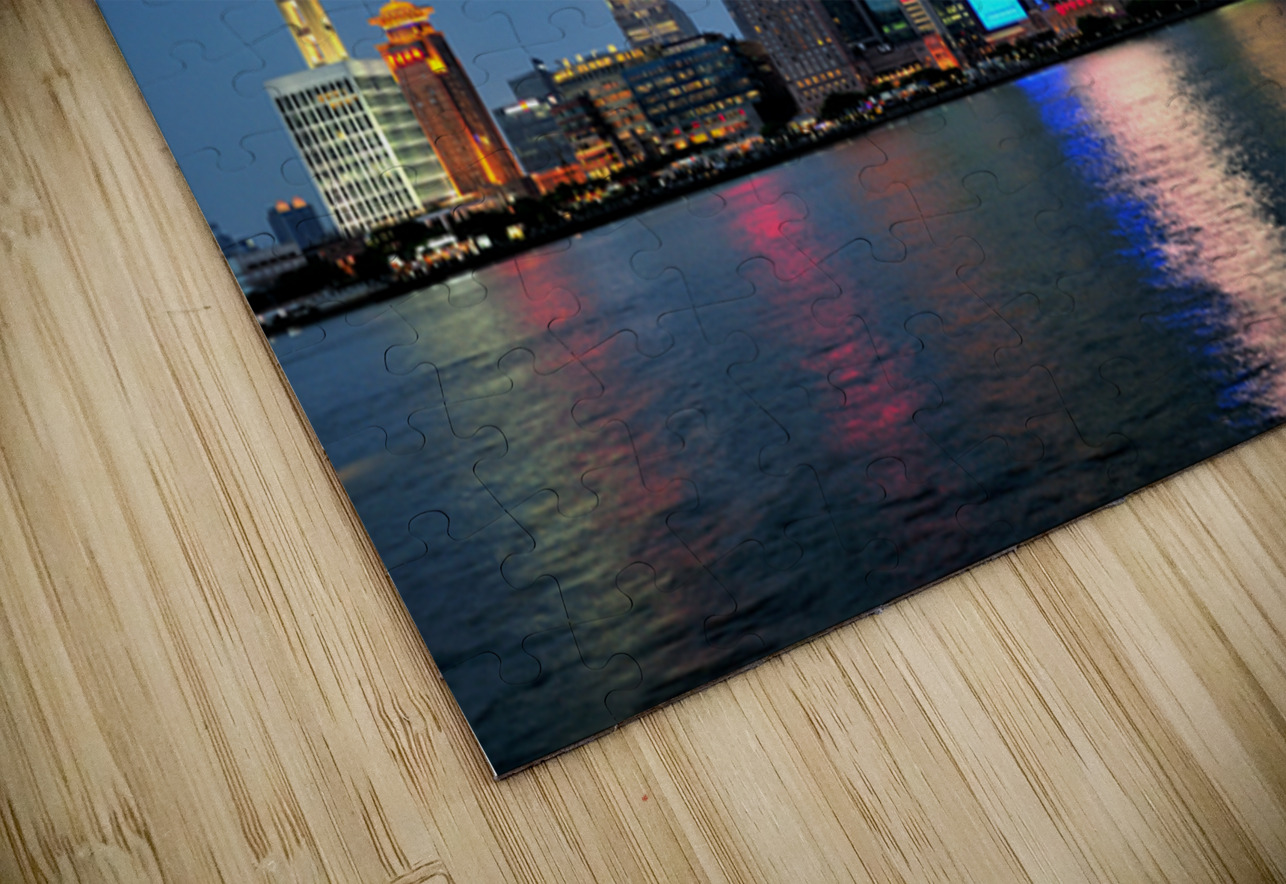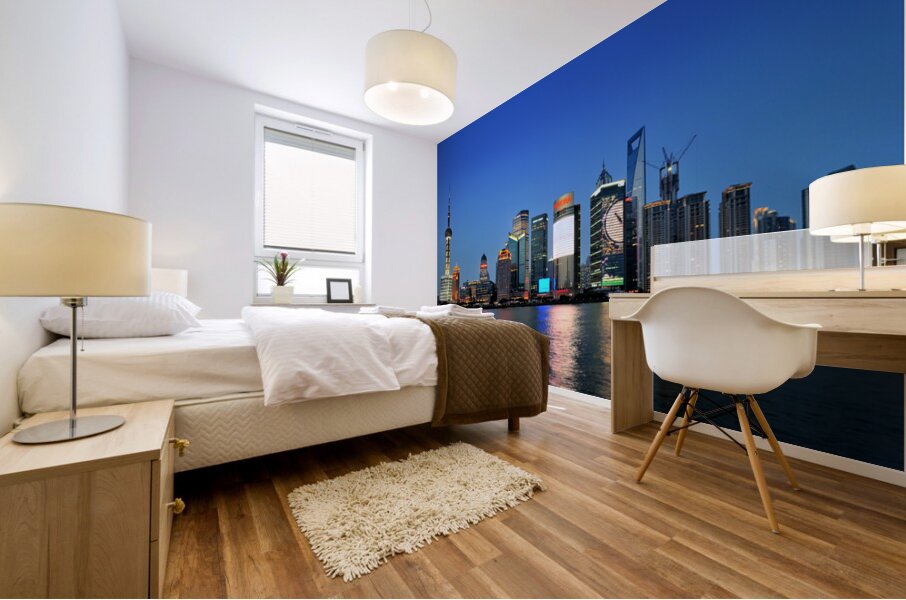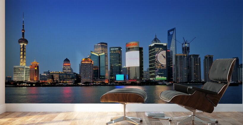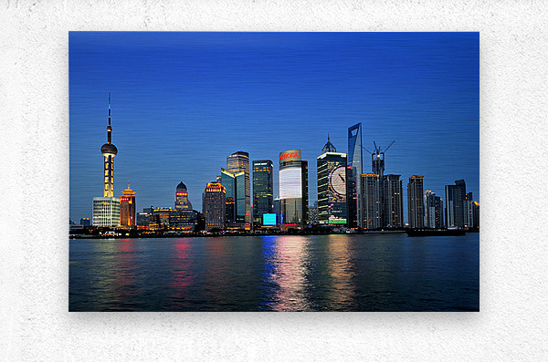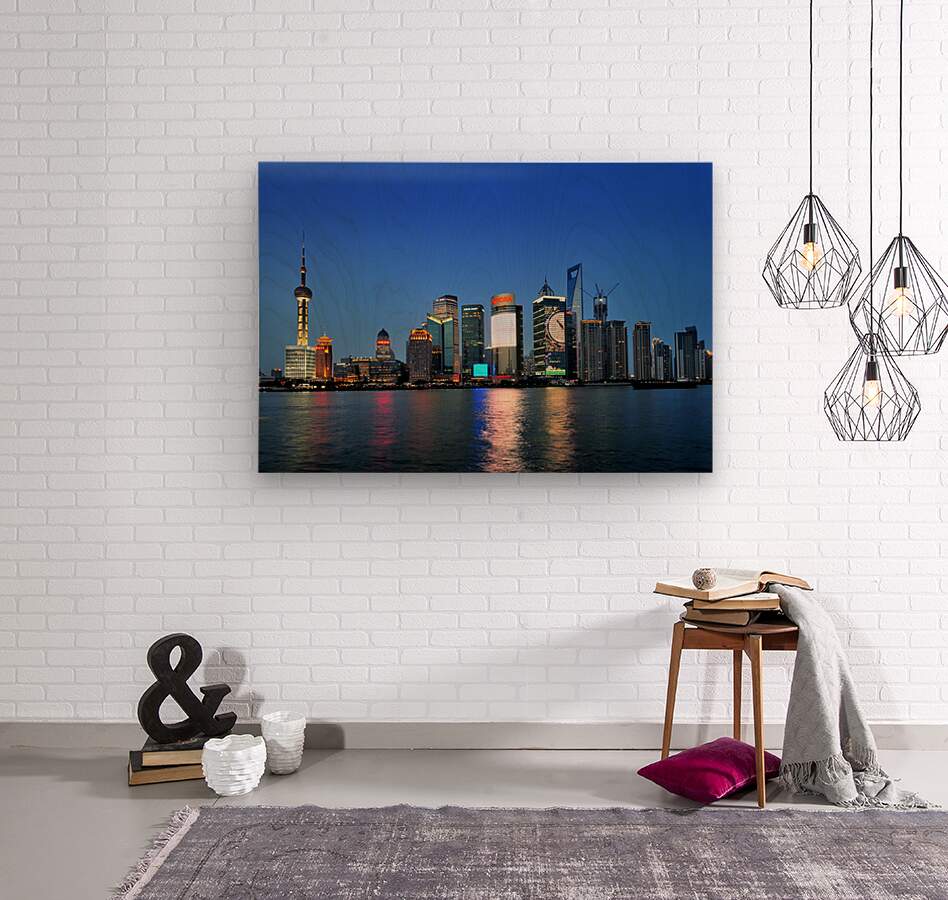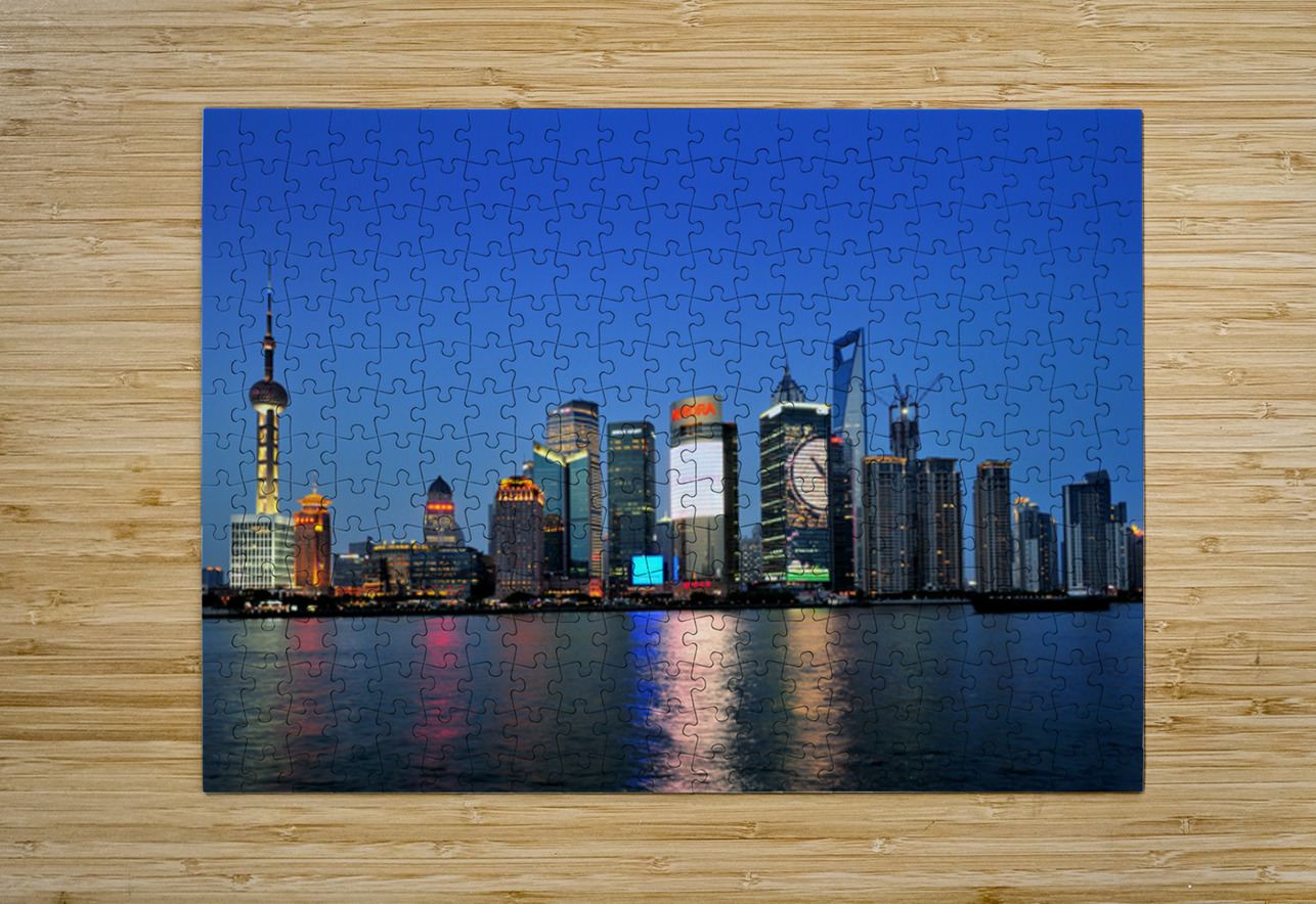 "Shanghai skyline lights up at night over the river" in a framed print.