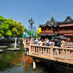 VIBRANT CHINESE GARDEN WITH KOI POND AND VISITORS IN SHANGHAI