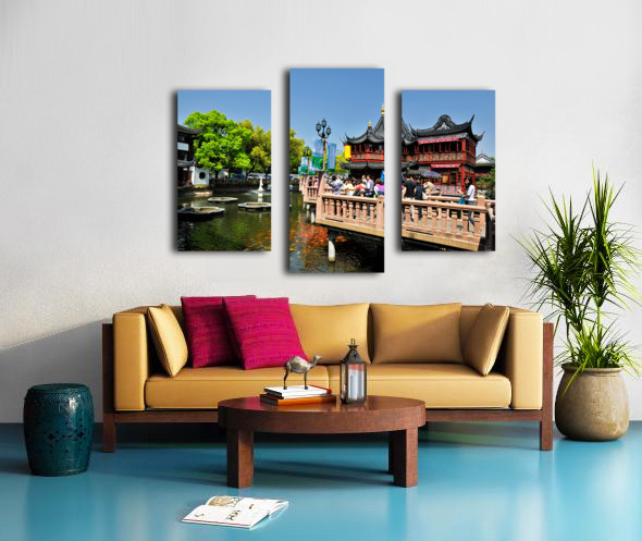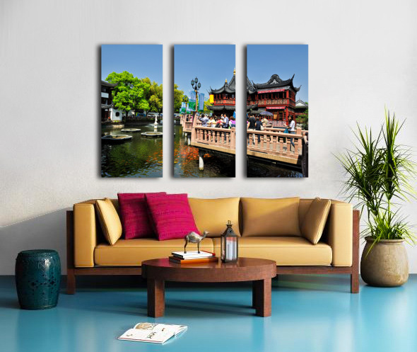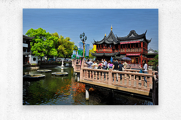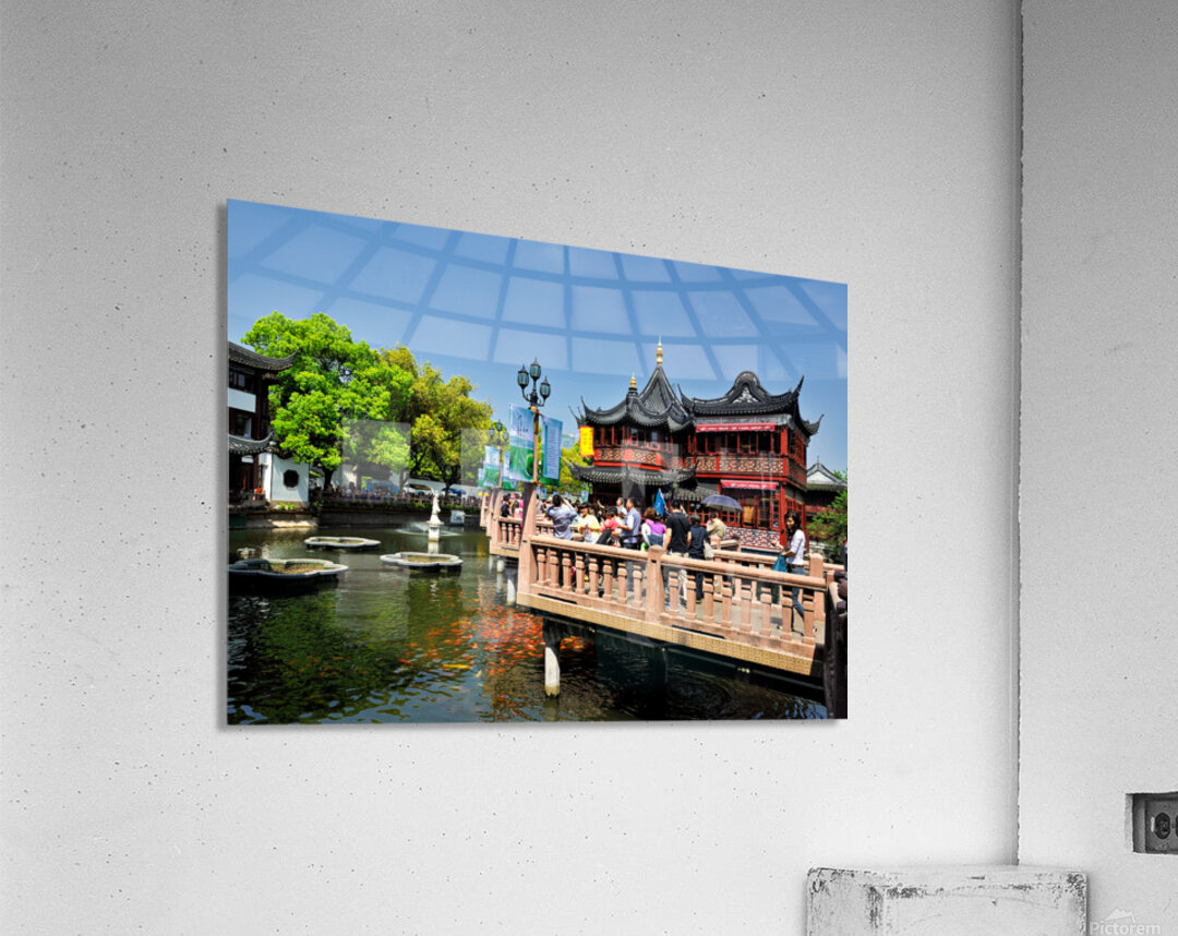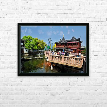Get this artwork "Vibrant Chinese garden with koi pond and visitors in Shanghai" in a framed print.