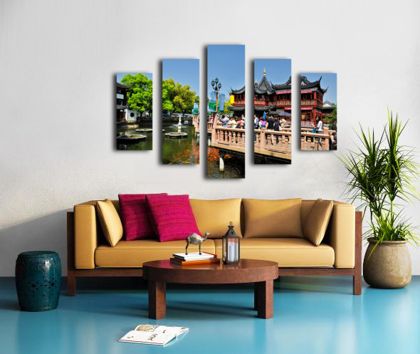 Vibrant Chinese garden with koi pond and visitors in Shanghai Frame print