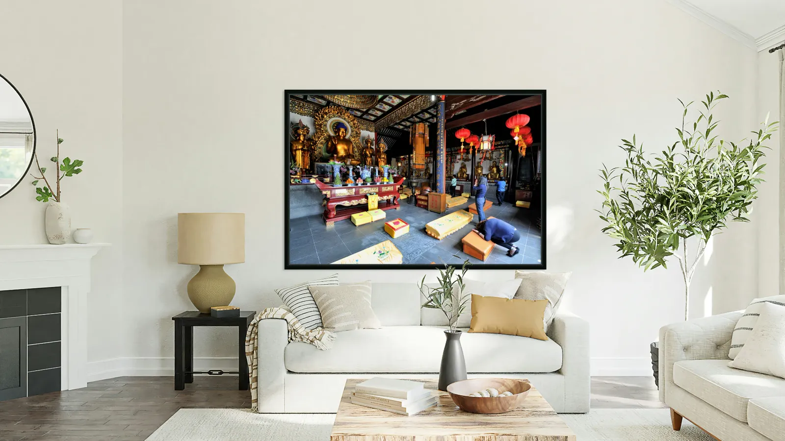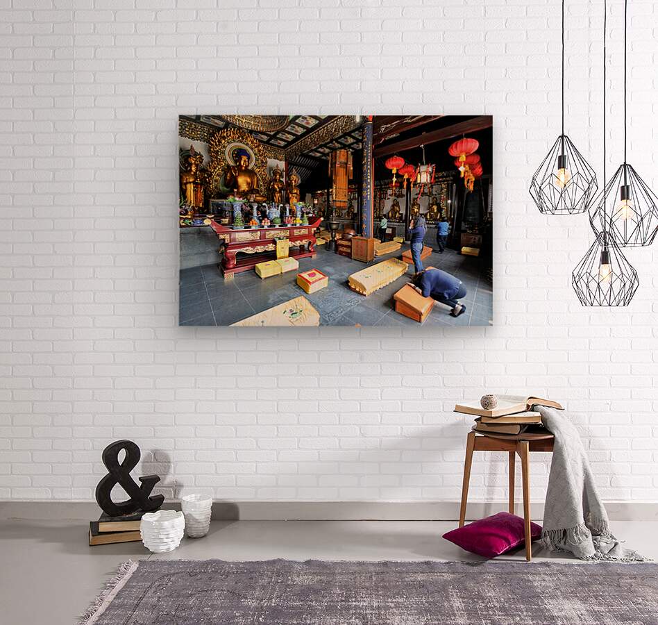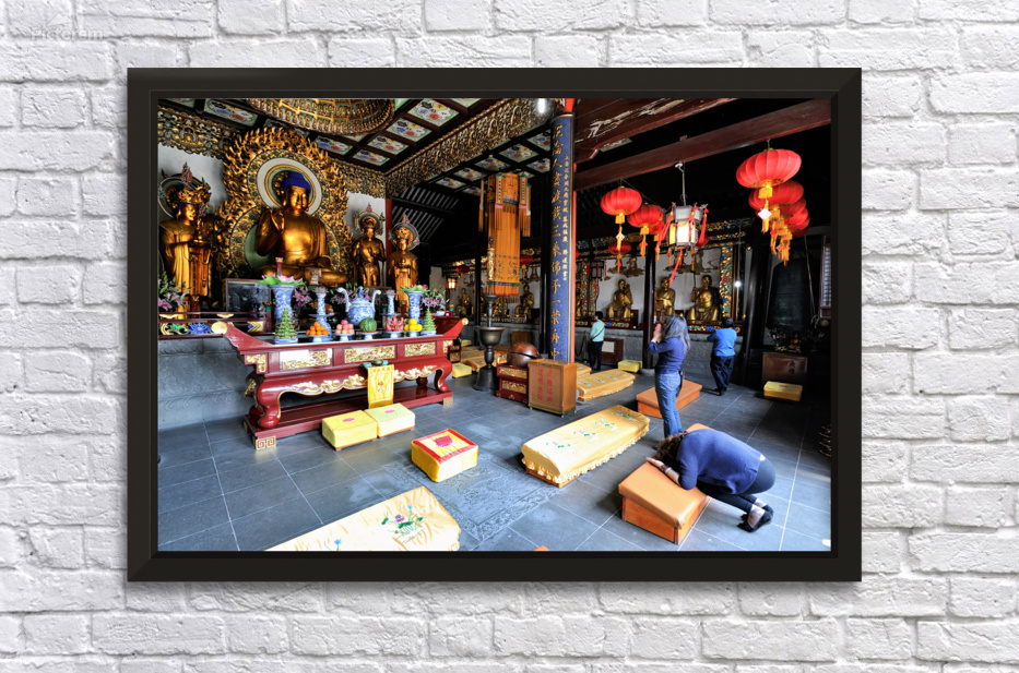 "Worshippers offer prayers in a Buddhist temple in Shanghai Chin" in a framed print.