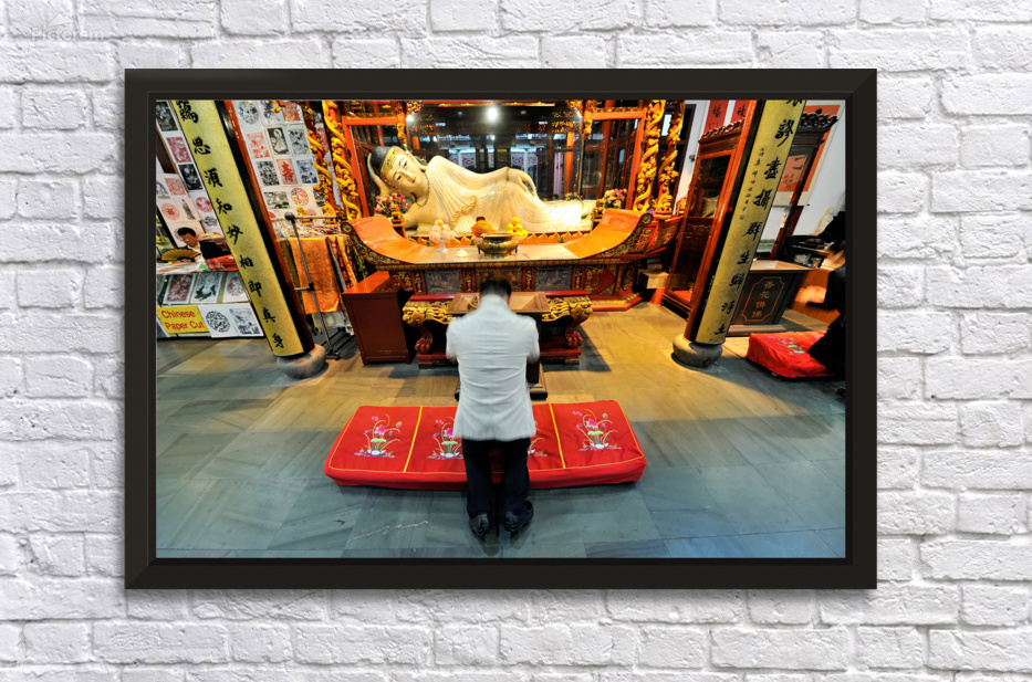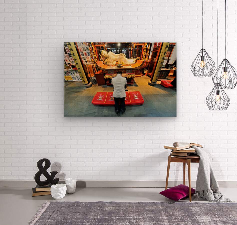 A worshipper kneels in front of a reclining Buddha statue in a colorful temple in Shanghai. The space is filled with decorations and offerings.