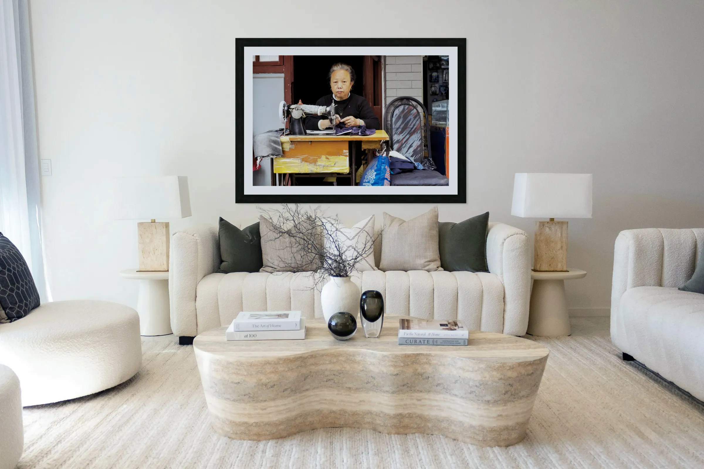 Elderly woman sews at machine in Shanghai China Picture Frame Printing