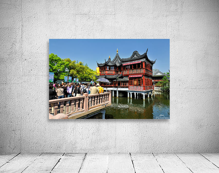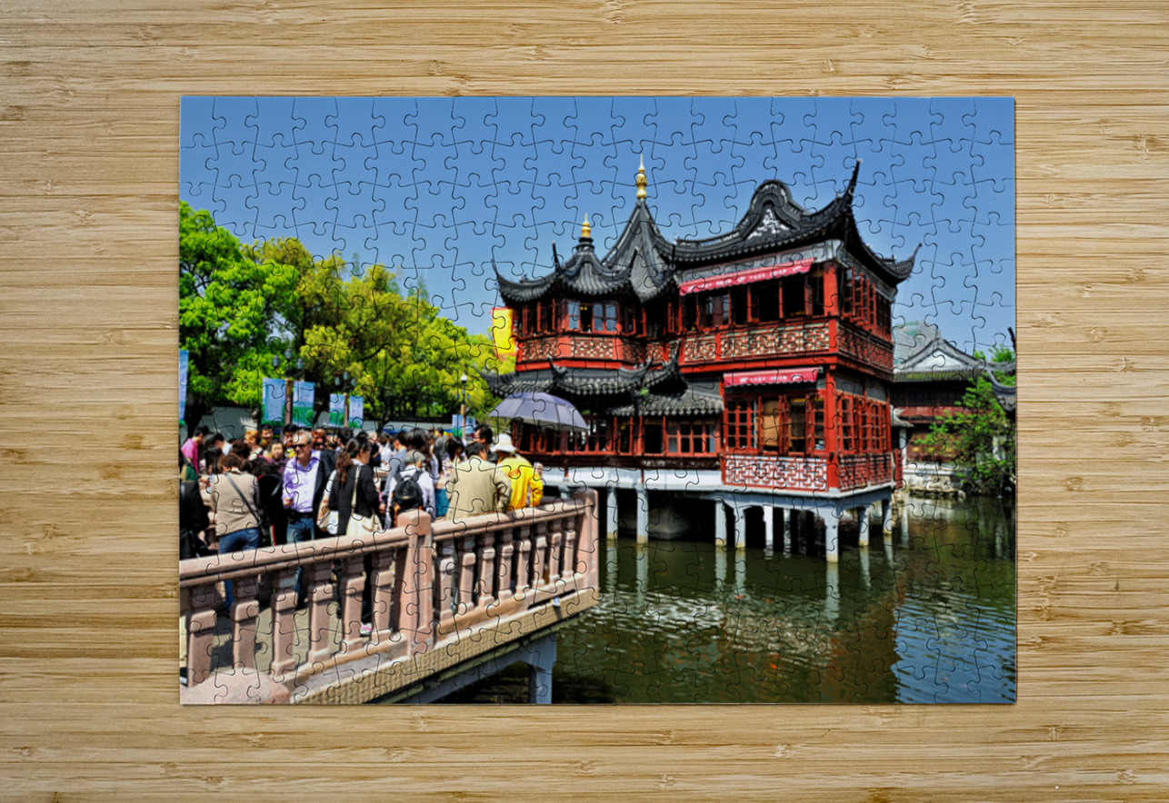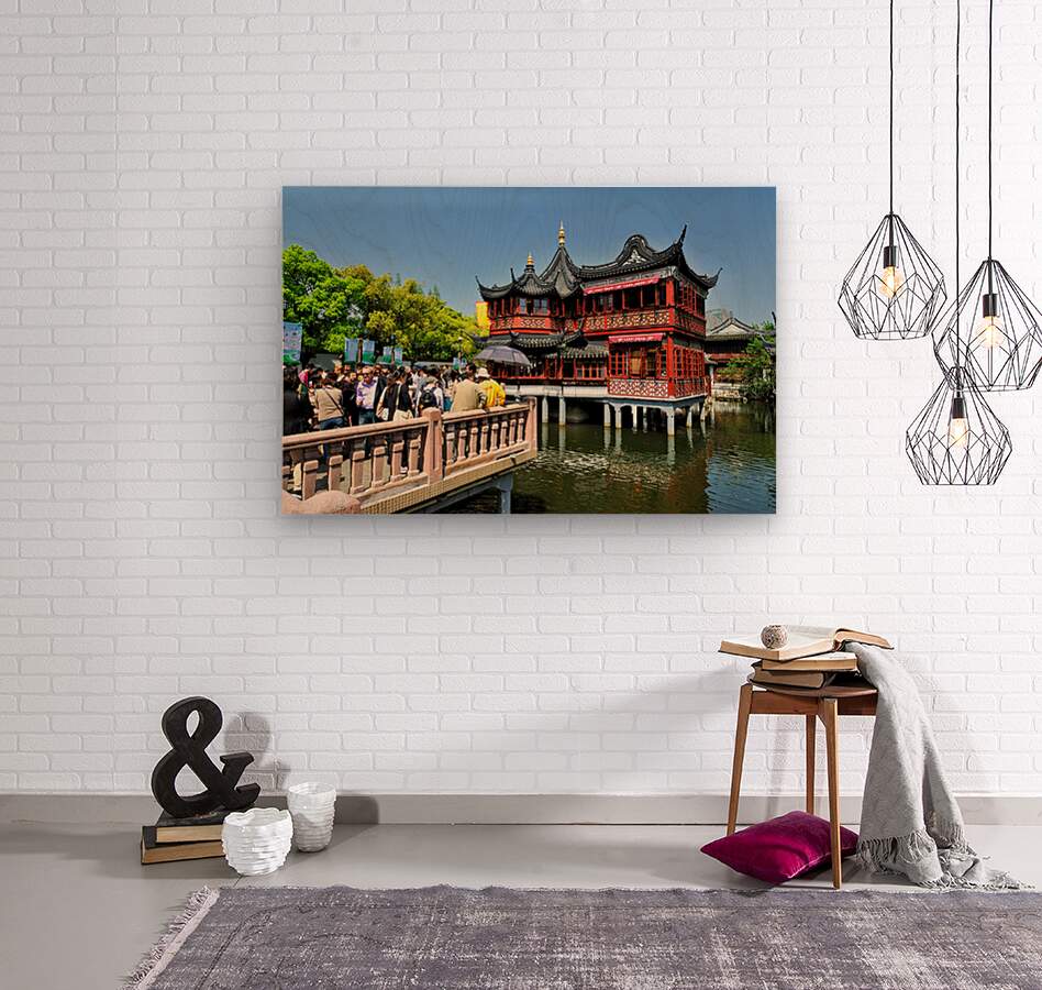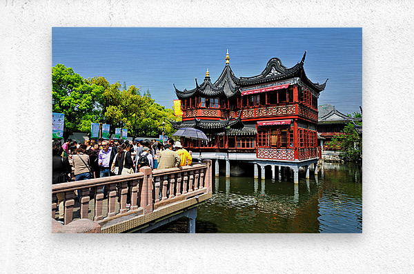 People gather at a tea house by the water in Shanghai. The bright day brings many visitors to enjoy tea and the view.