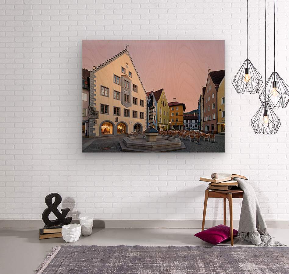 Visitors walk around the historic square in Fussen Germany as the sun sets. Buildings with detailed architecture surround the area.