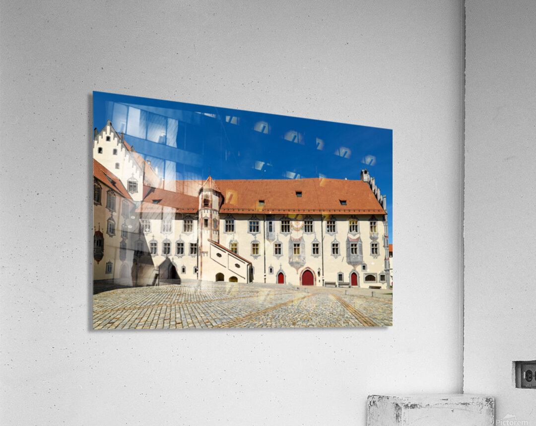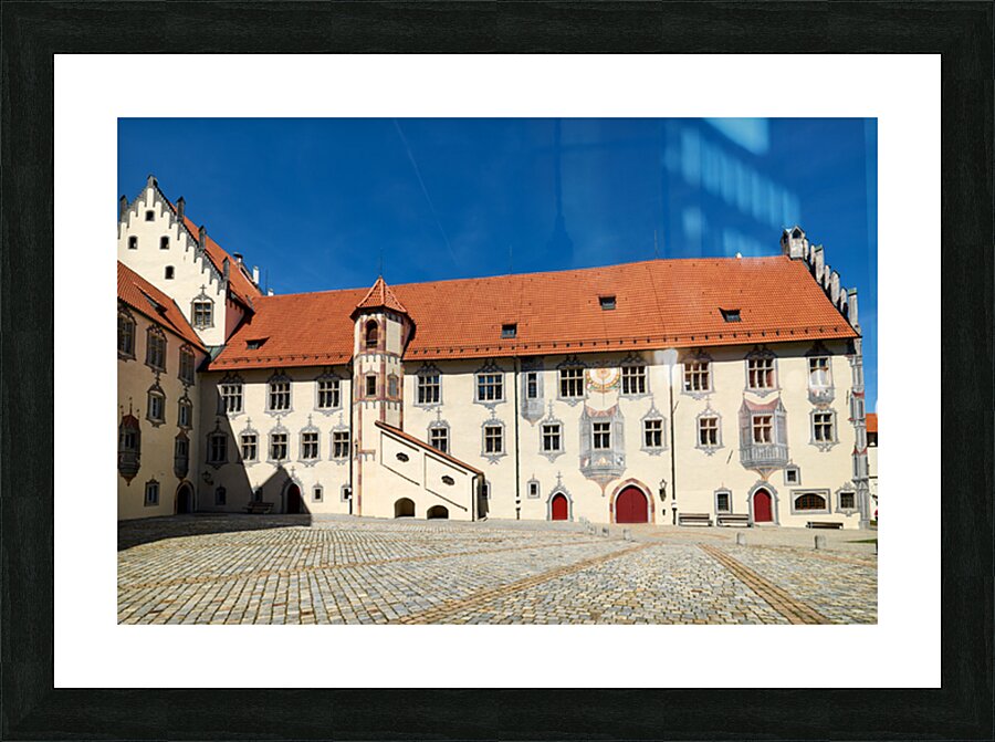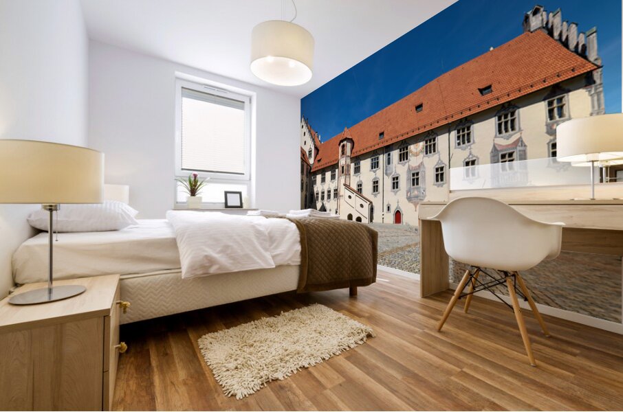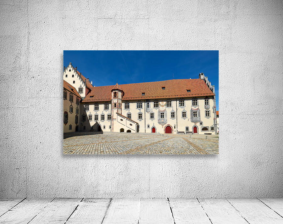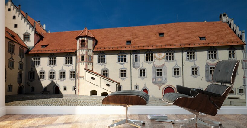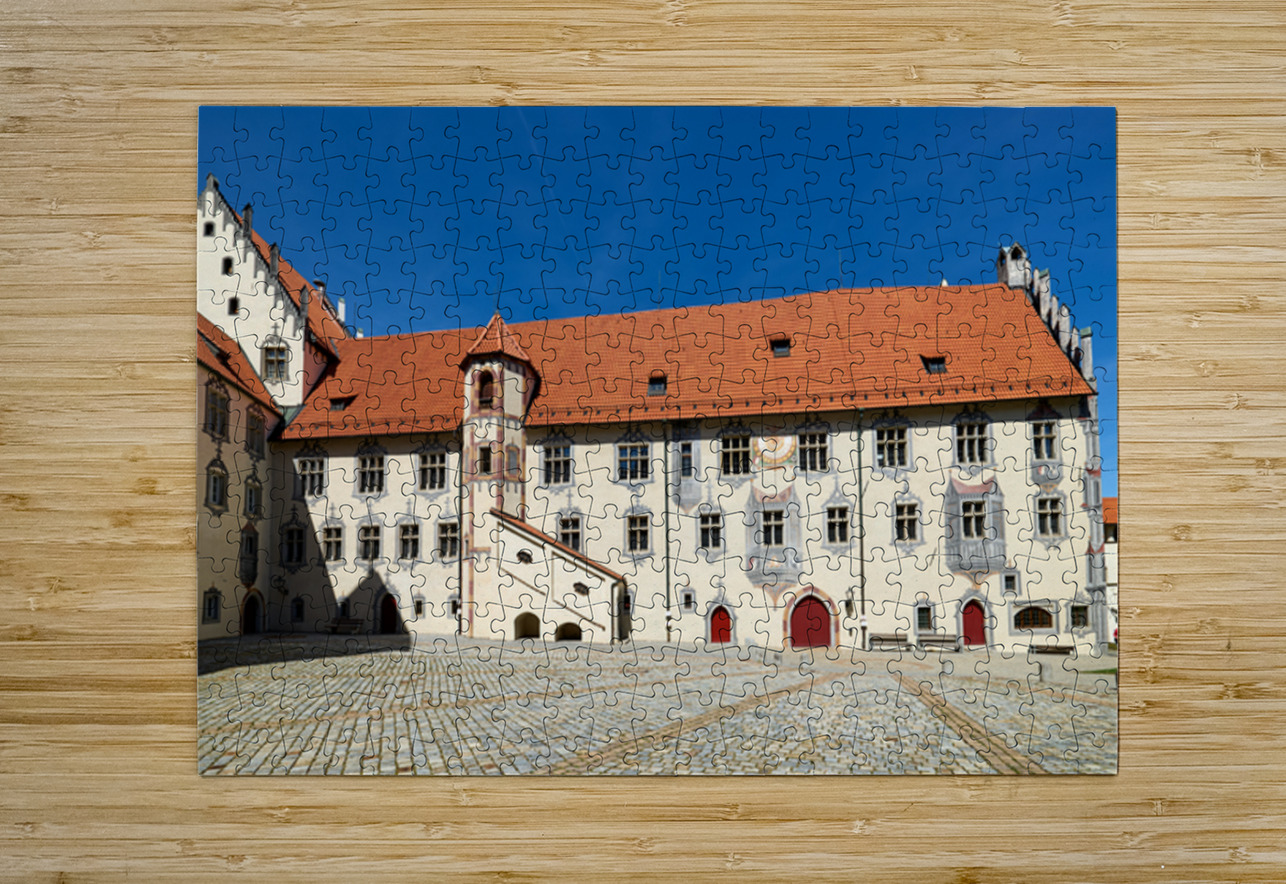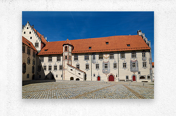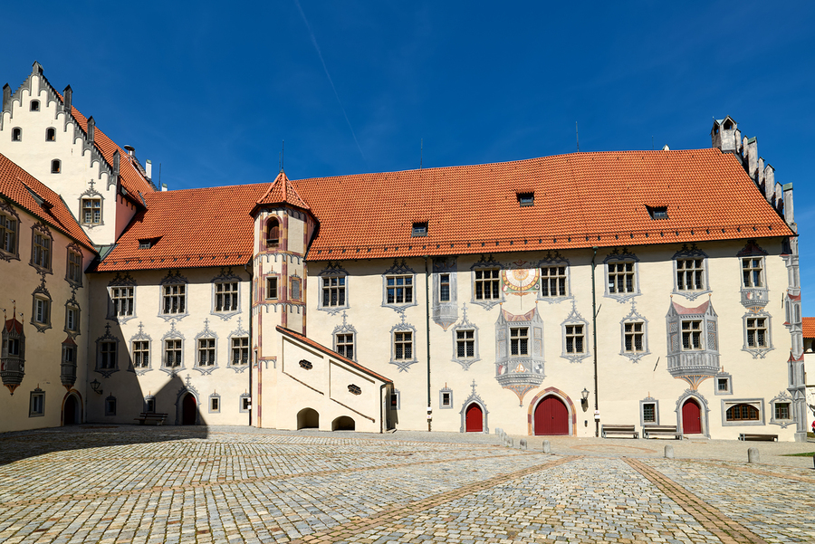 Travelers explore Hohes Schloss in Fussen located on the Romantic Road. The castle features unique architecture and a scenic setting.