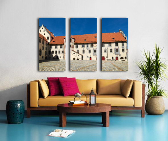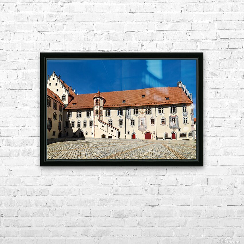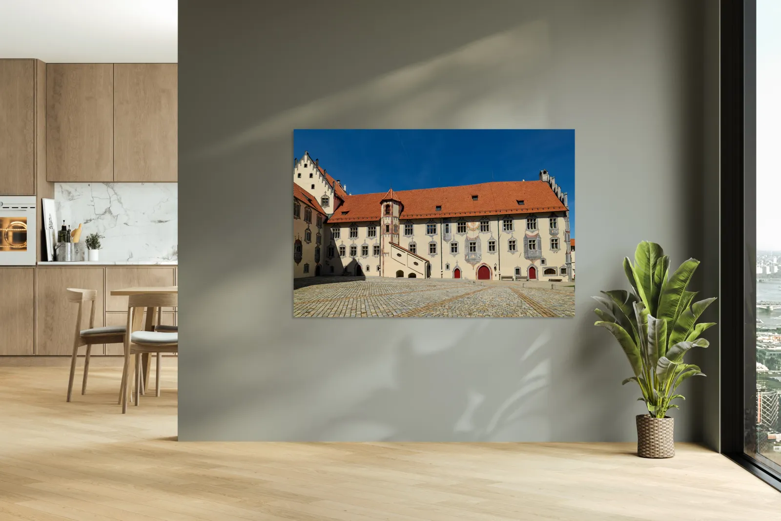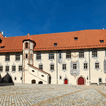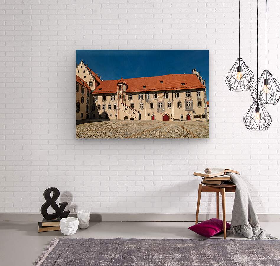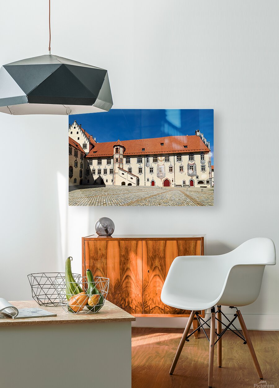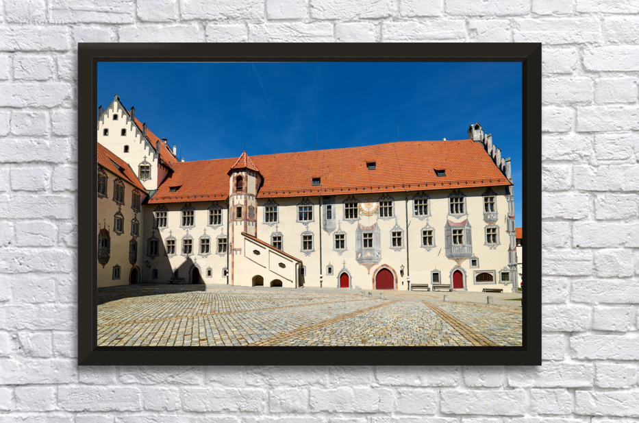 Travelers explore Hohes Schloss in Fussen located on the Romantic Road. The castle features unique architecture and a scenic setting.