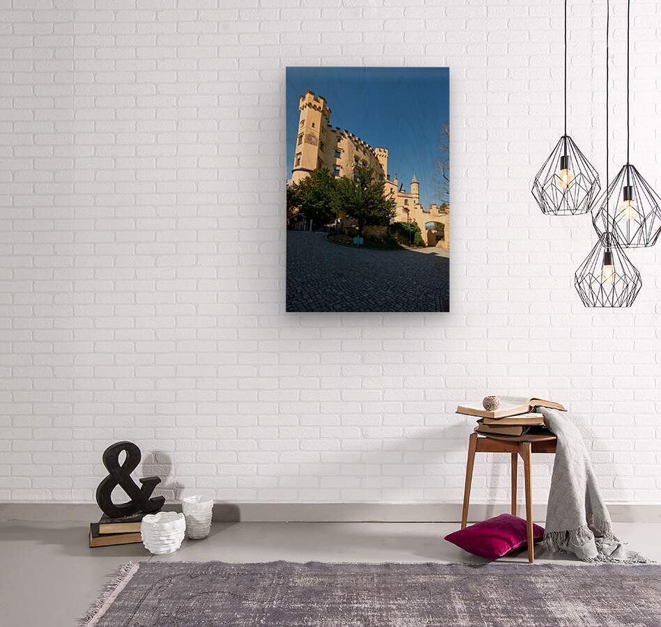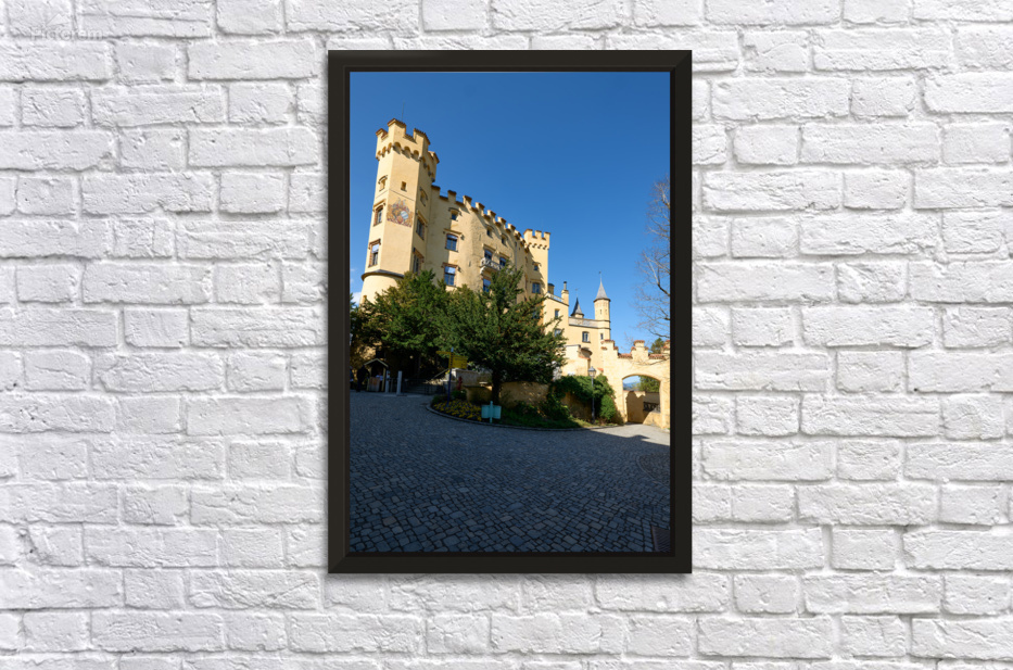 Visitors walk near Hohenschwangau castle in Fussen Bavaria during a clear day. The castle shows medieval design and history.