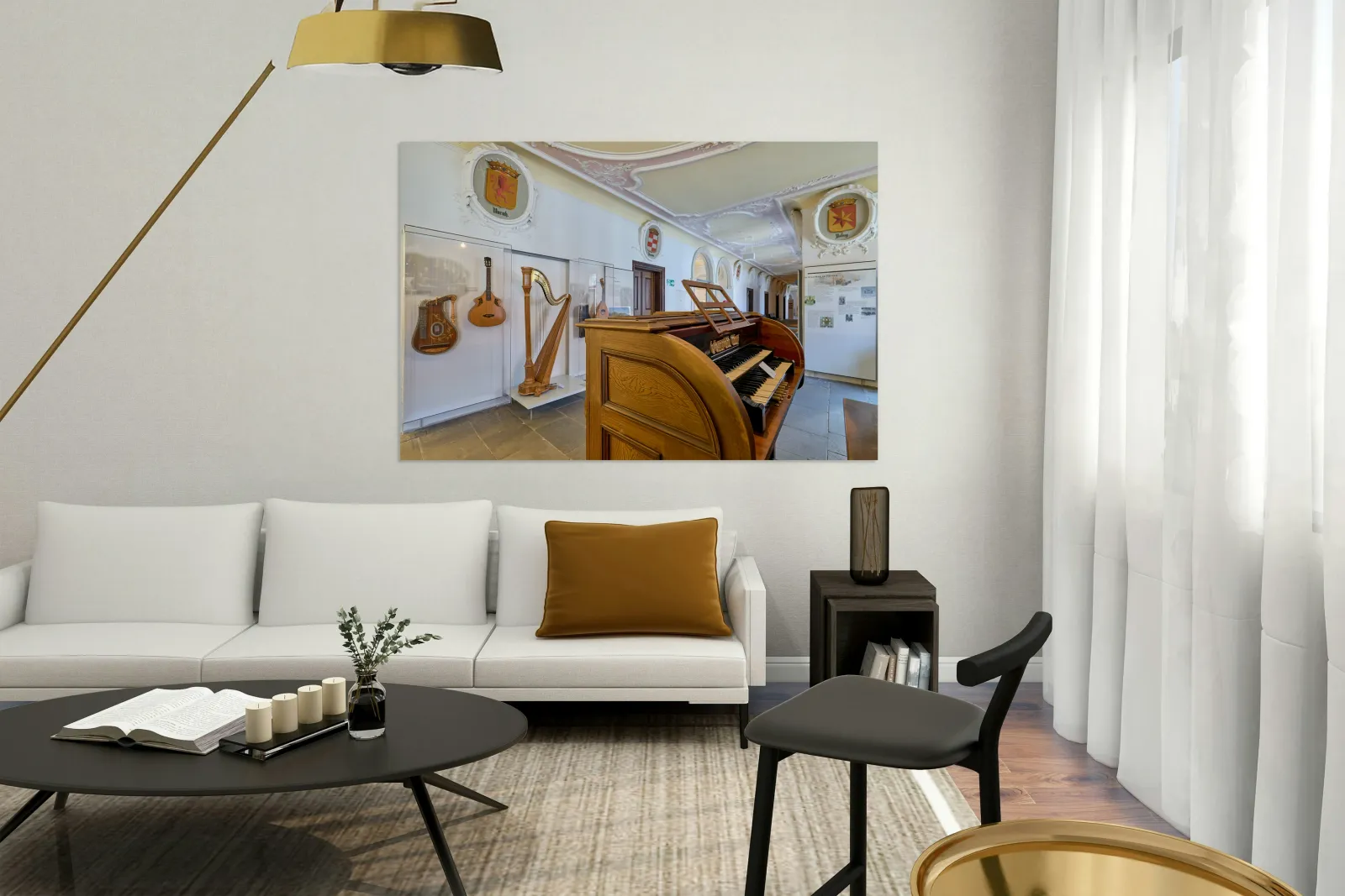Musical instruments are showcased in St. Mang Abbey Fussen on the Romantic Road. The setting includes a wooden organ and string instruments.