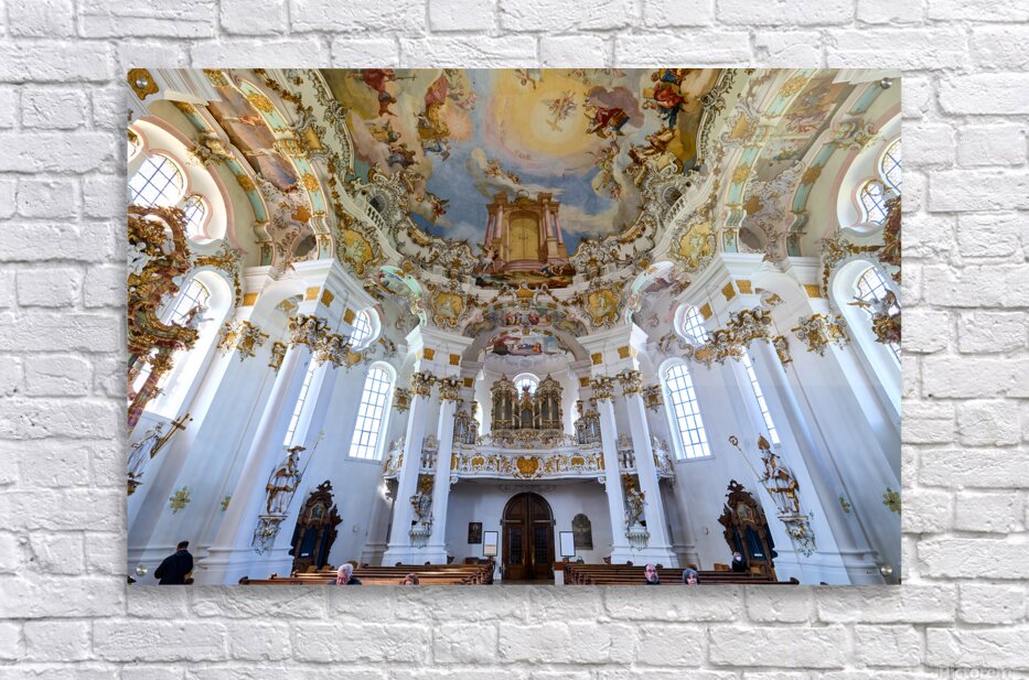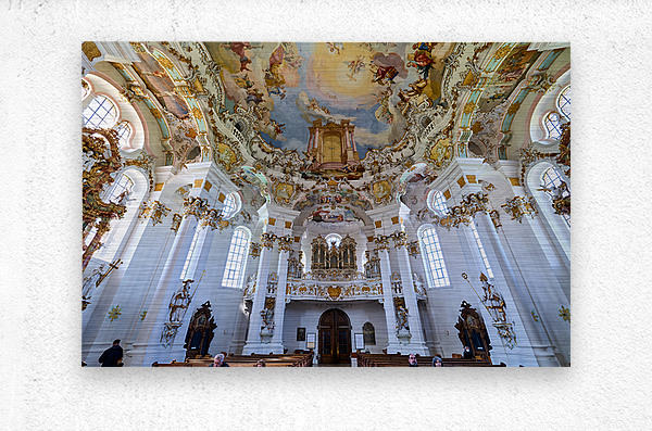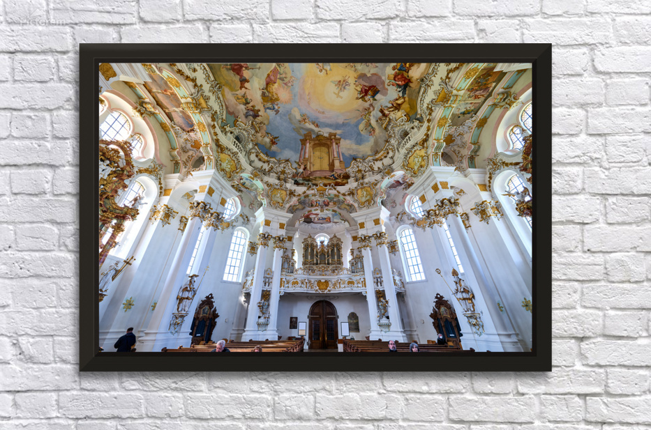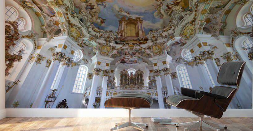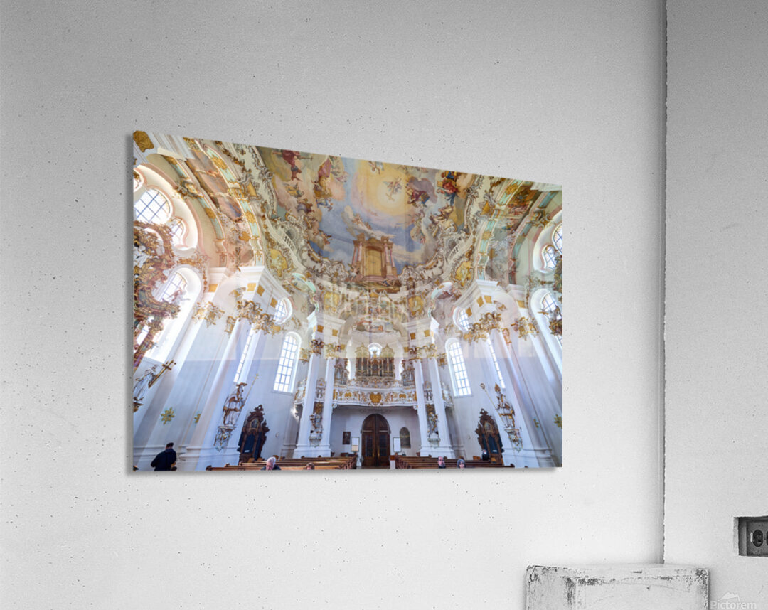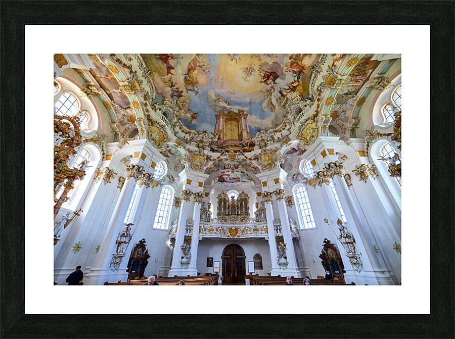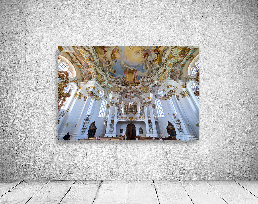 Visitors admire the interior of Wieskirche a famous pilgrimage church in Bavaria Germany. The church features elaborate decorations and artwork.
