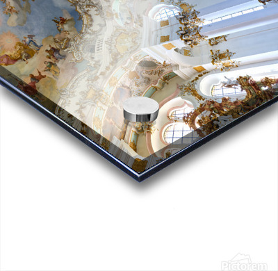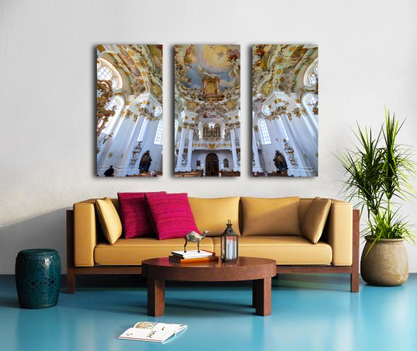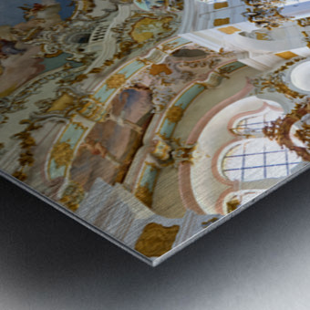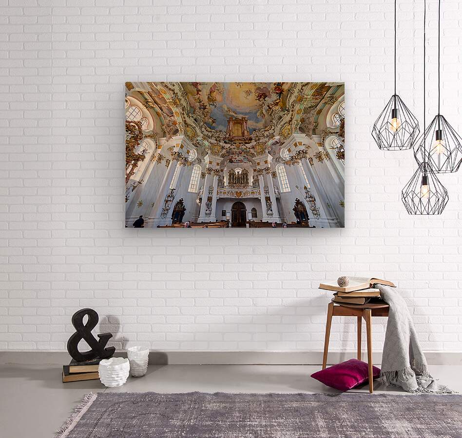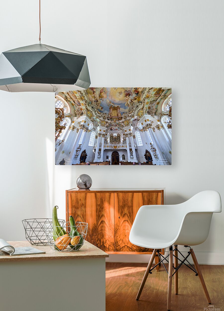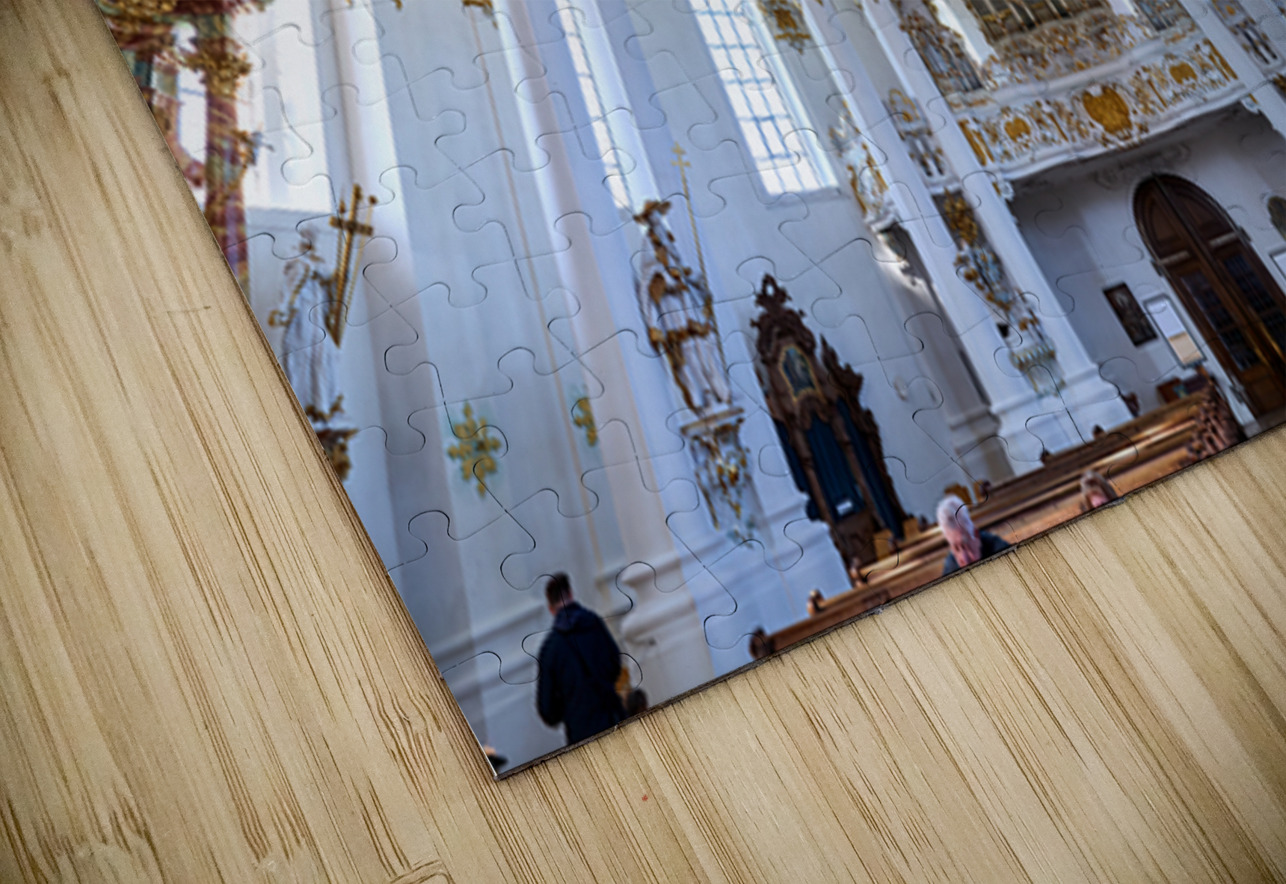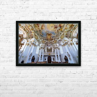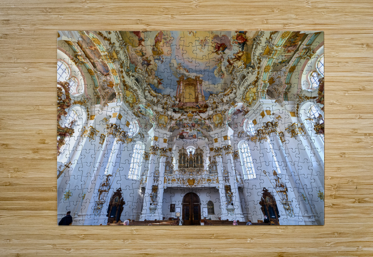 Visitors admire the interior of Wieskirche a famous pilgrimage church in Bavaria Germany. The church features elaborate decorations and artwork.