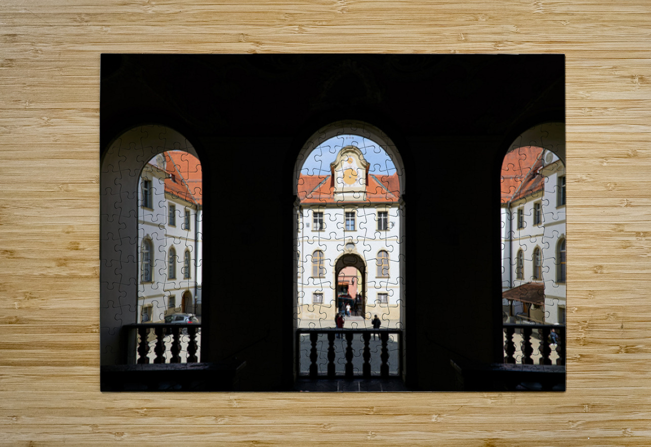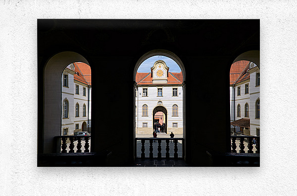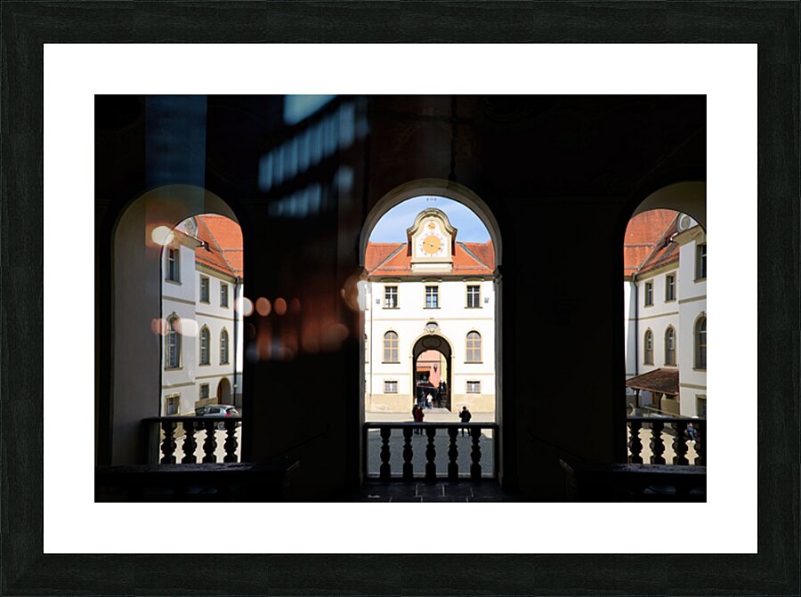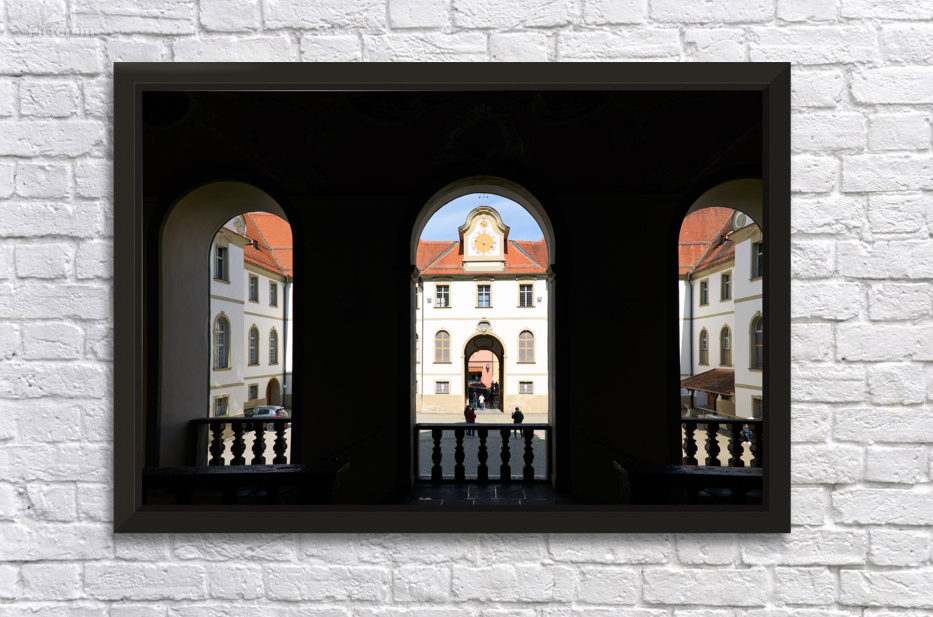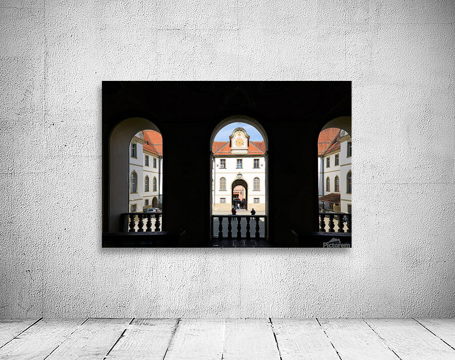 Visitors walk through the arches of Benediktinerkloster St. Mang in Fussen Bavaria. The historic architecture creates an inviting space.