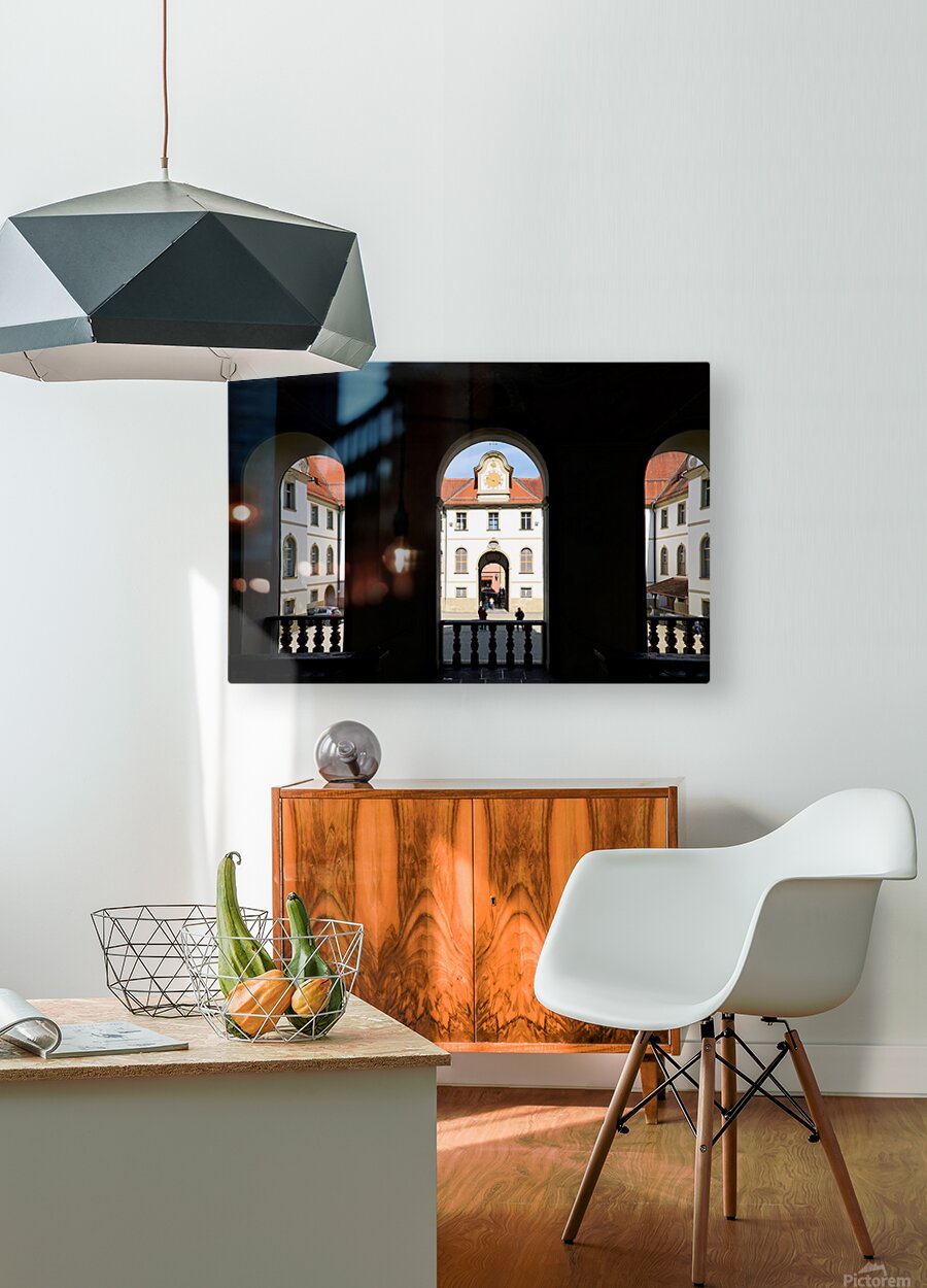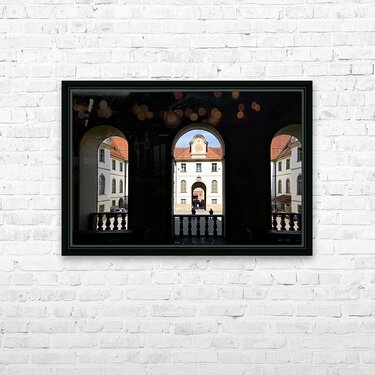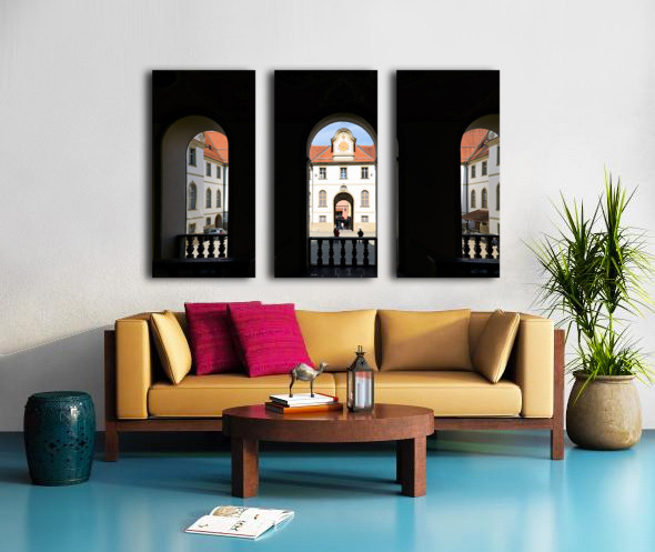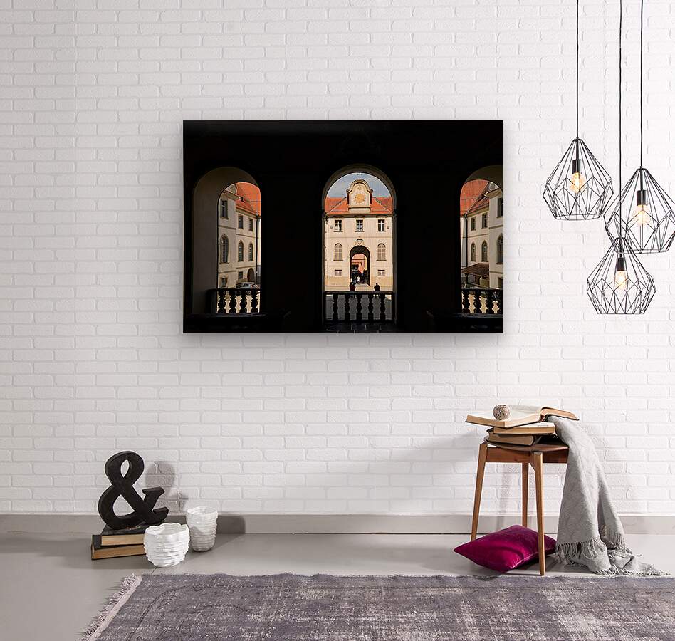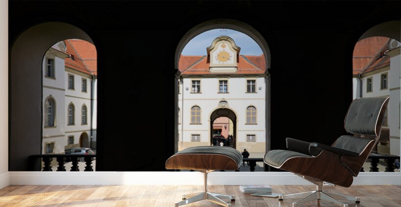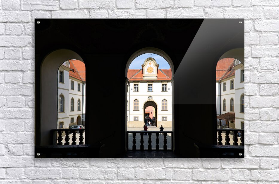 Visitors walk through the arches of Benediktinerkloster St. Mang in Fussen Bavaria. The historic architecture creates an inviting space.