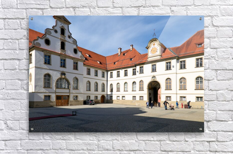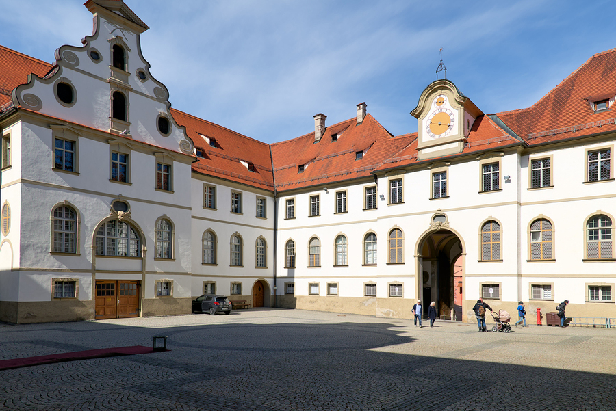 People walk in the courtyard of Benediktinerkloster St. Mang in Fussen Germany. The building shows historical architecture under clear blue skies.