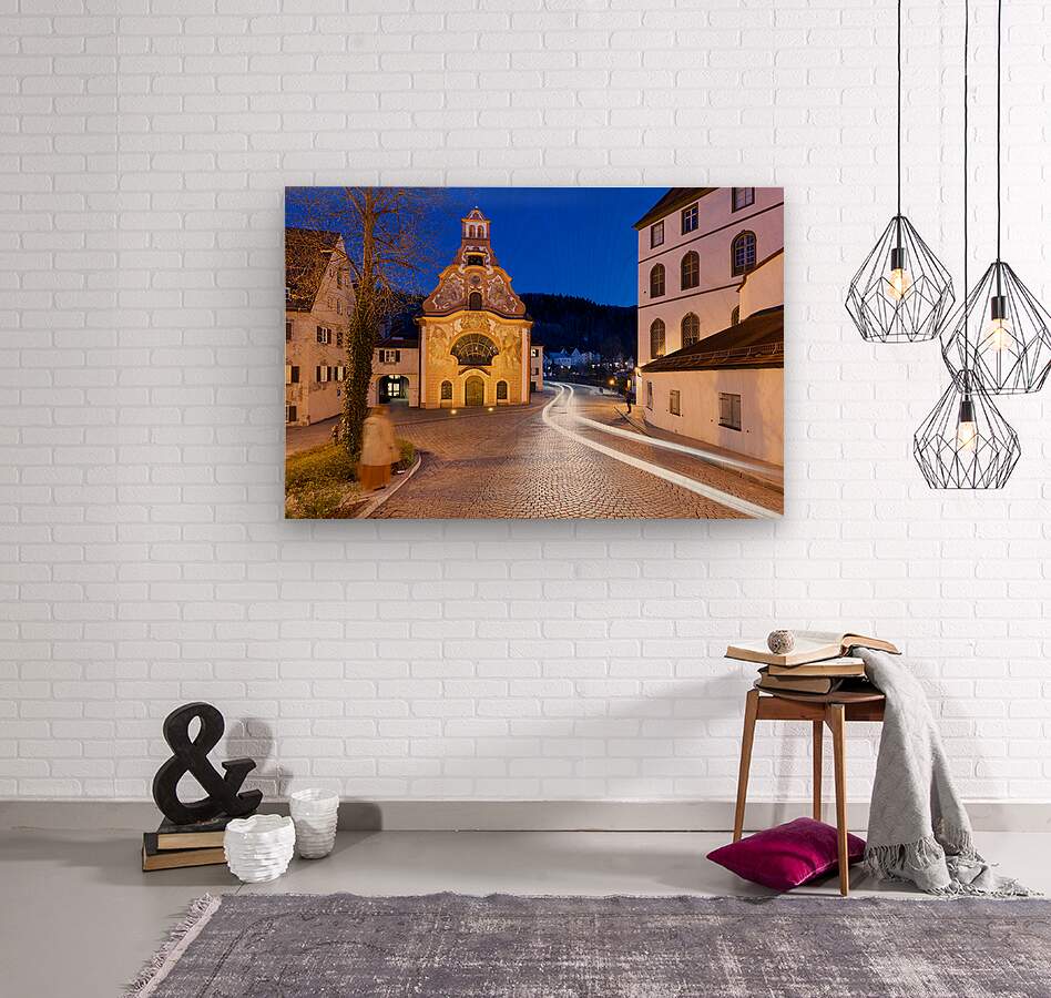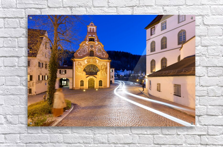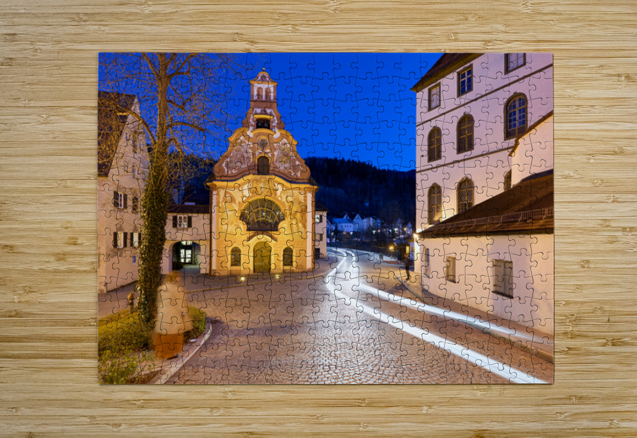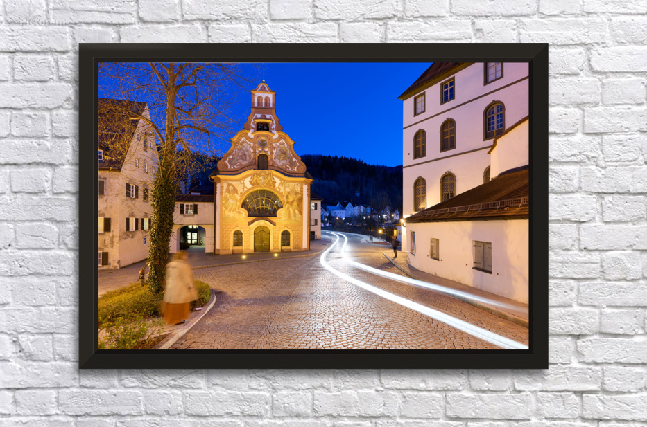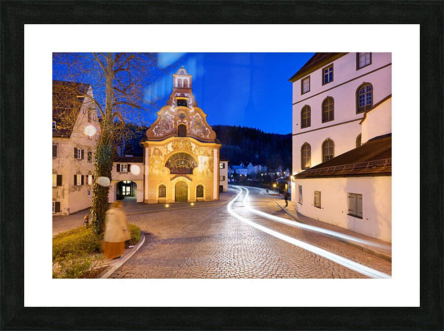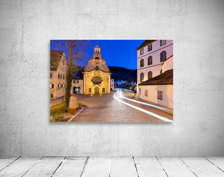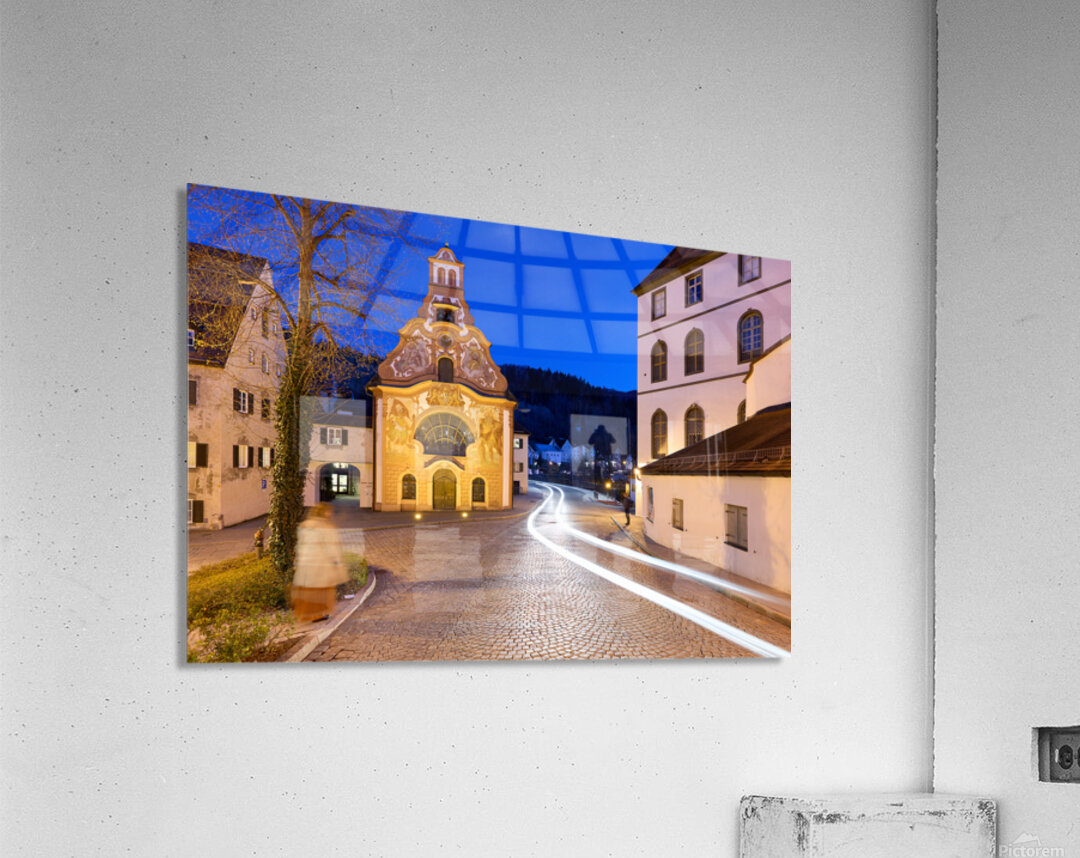 Heilig-Geist-Spitalkirche stands in Fussen as day turns to night. The colorful facade and street lights create a warm atmosphere.