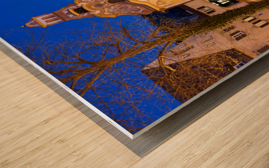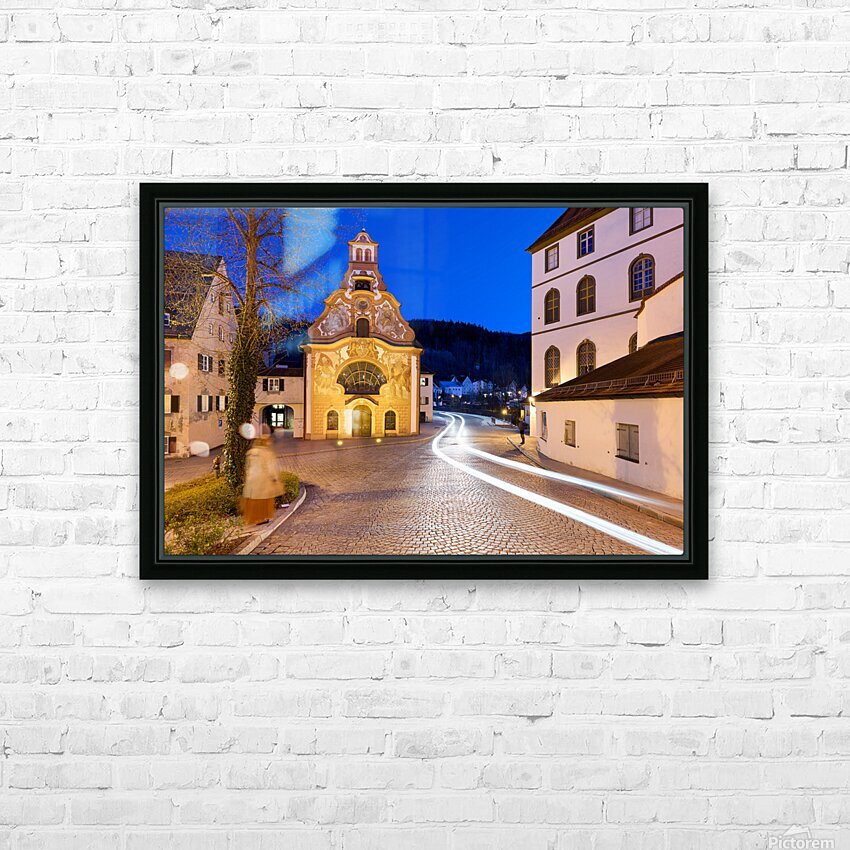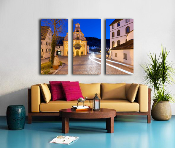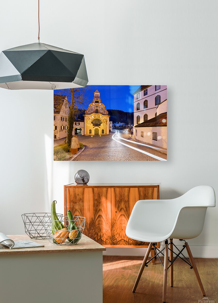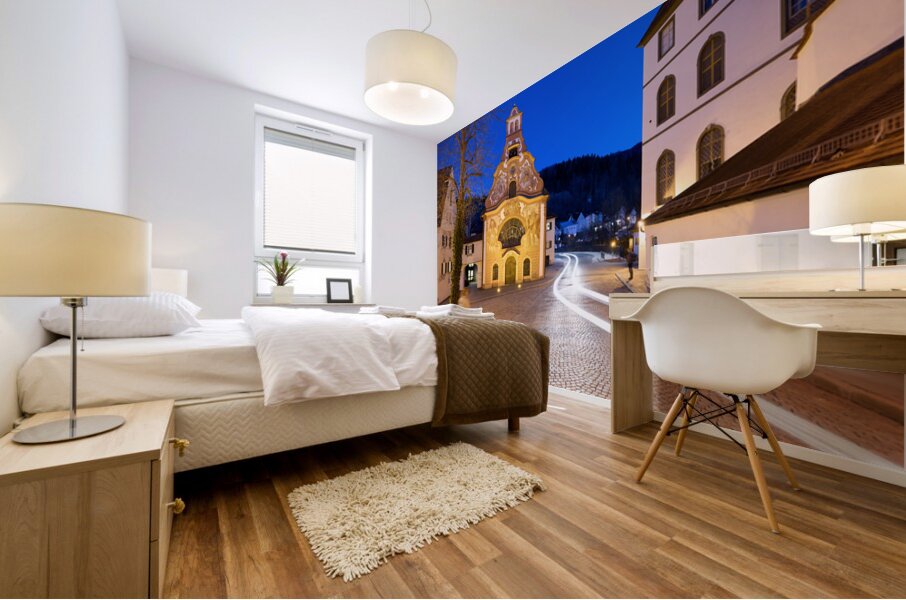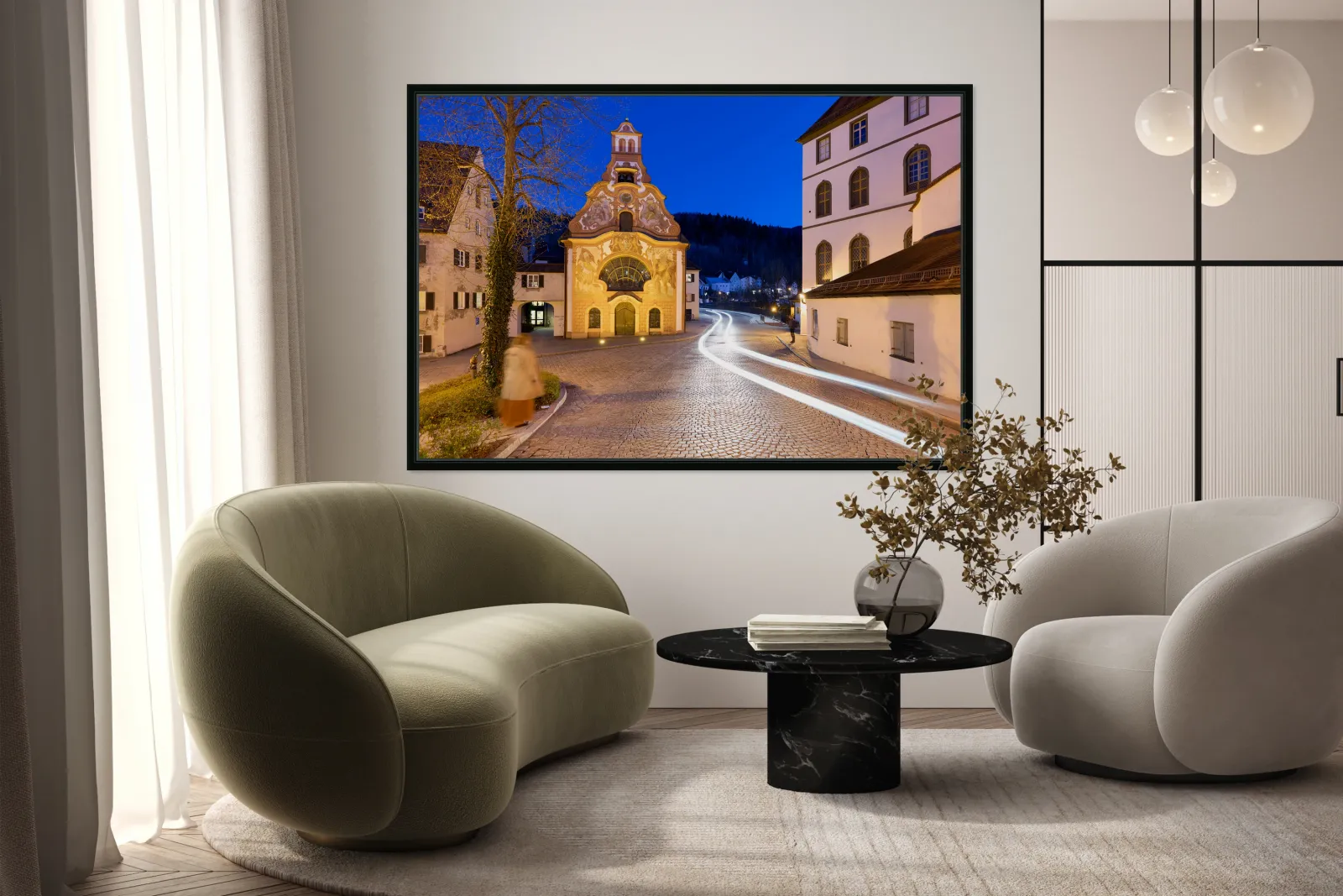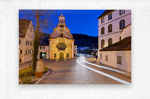 Heilig-Geist-Spitalkirche stands in Fussen as day turns to night. The colorful facade and street lights create a warm atmosphere.