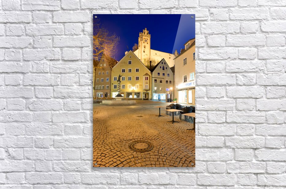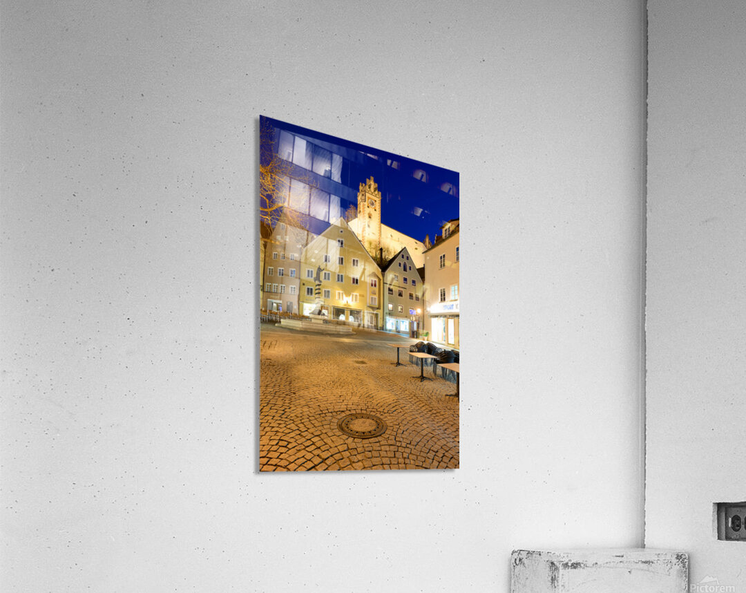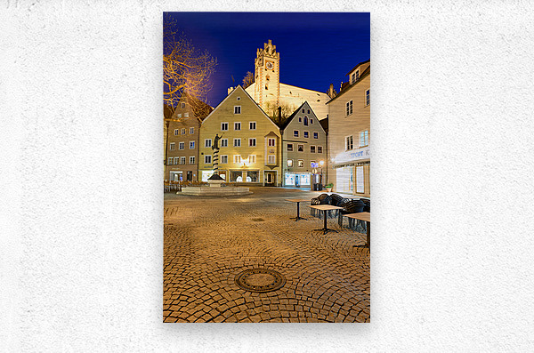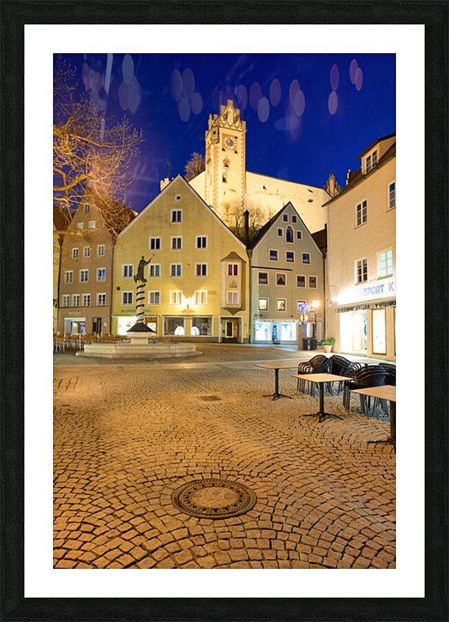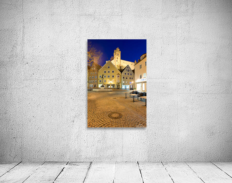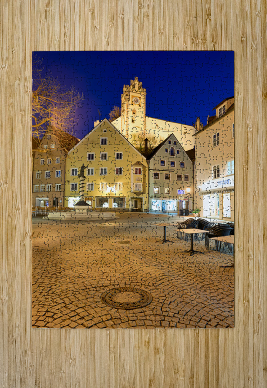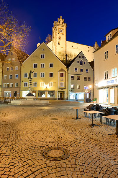 Visitors stroll through a square in Fussen at night with buildings and a clock tower lit up showcasing the charm of Bavaria.