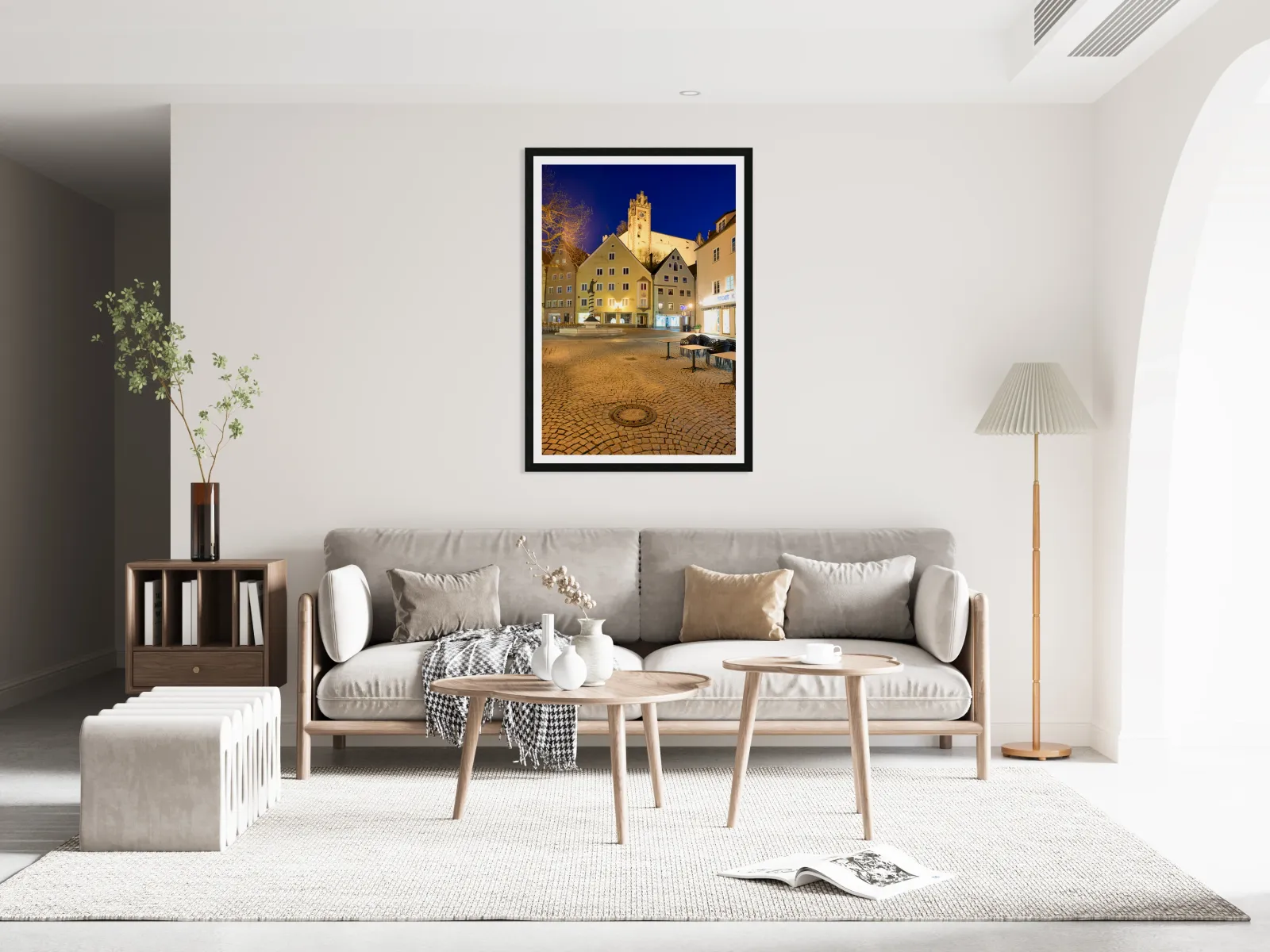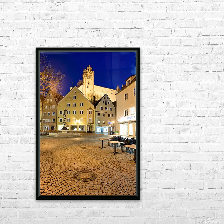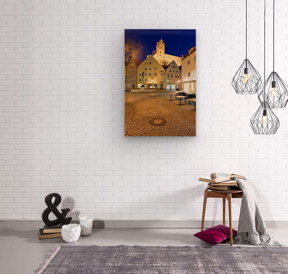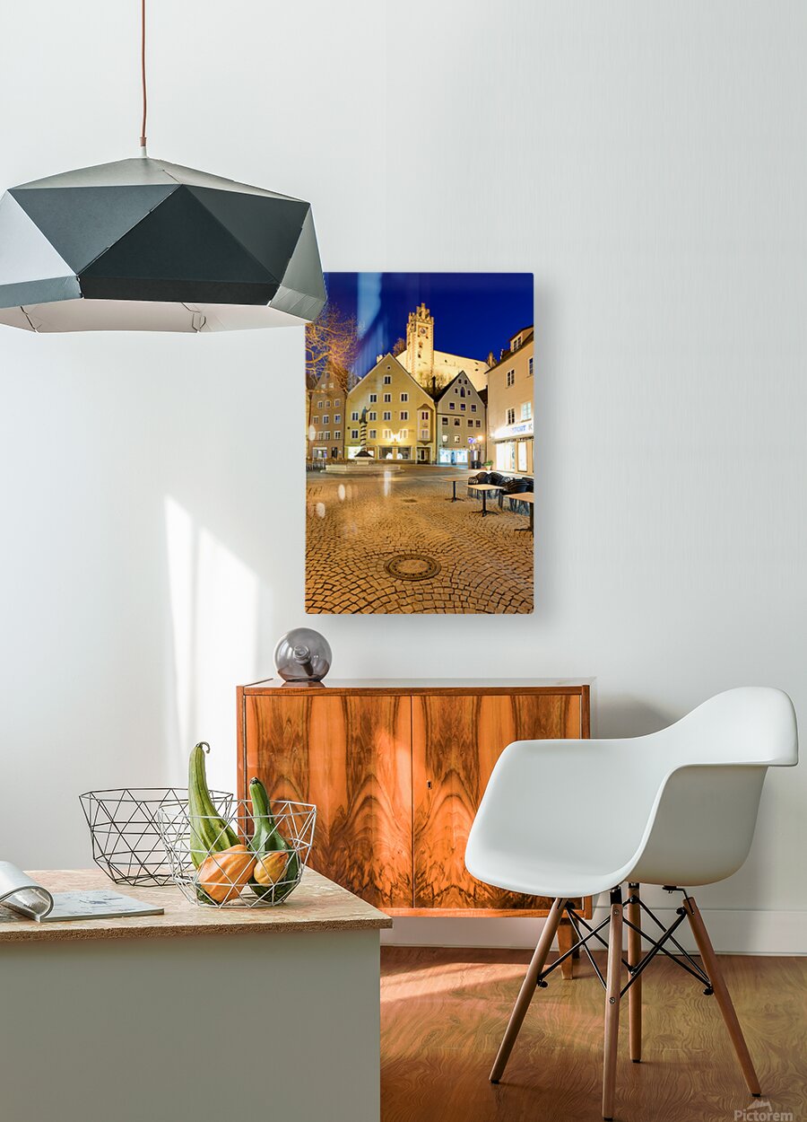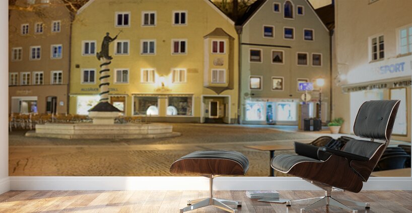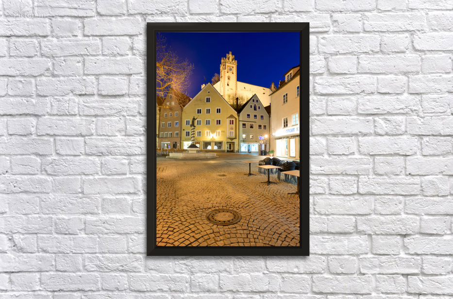 Visitors stroll through a square in Fussen at night with buildings and a clock tower lit up showcasing the charm of Bavaria.