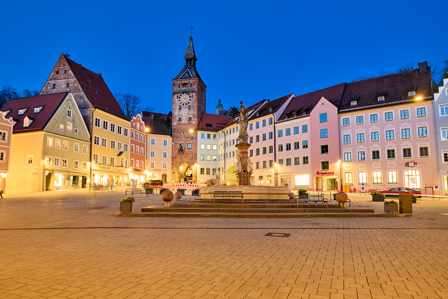People walk through Hauptplatz square in Landsberg am Lech as buildings light up at dusk. This area is along the famous Romantic Road in Bavaria.